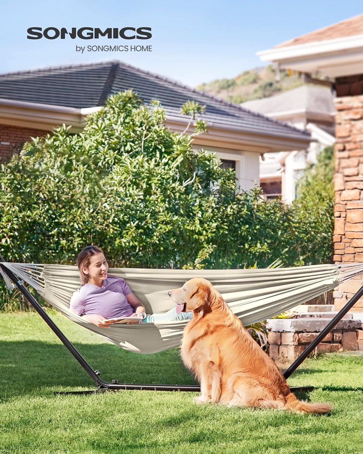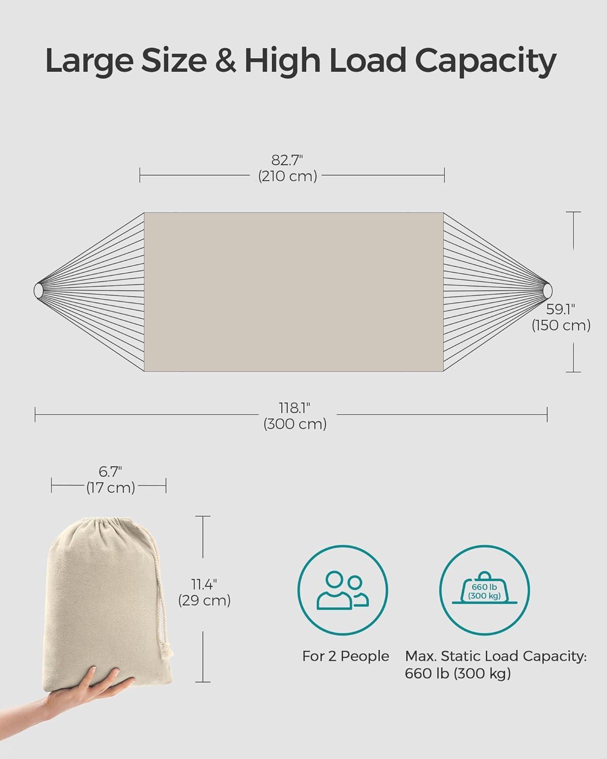 SONGMICS Double Hammock, 98.4 x 59.1 Inches, 660 lb Load Capacity, with Compression Bag, Mounting Straps, Carabiners, for Terrace, Balcony, Garden, Outdoor, Camping, Gray UGDC15GY(Beige)