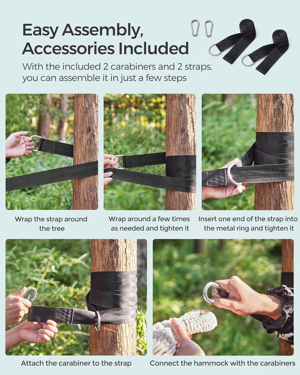 Hang out Everywhere: 2 mounting straps and carabiners are included with the hammock, so you can hang the hammock outside without any problems. Find a quiet place, 2 strong trees, and take a nap outside