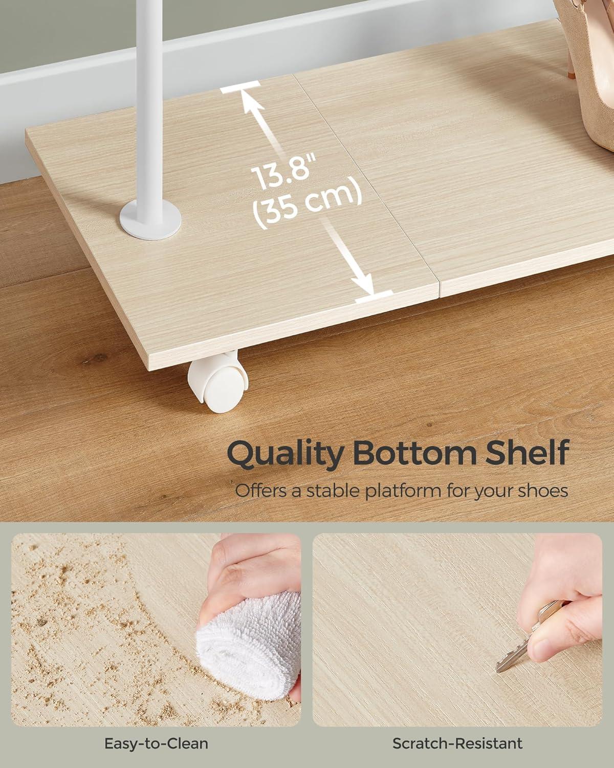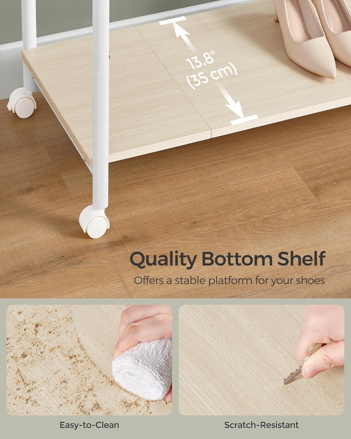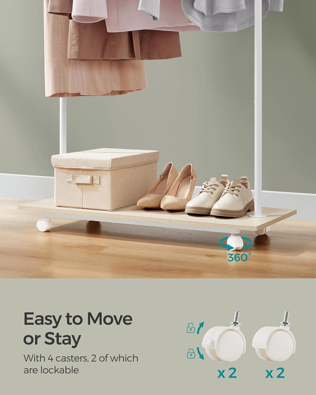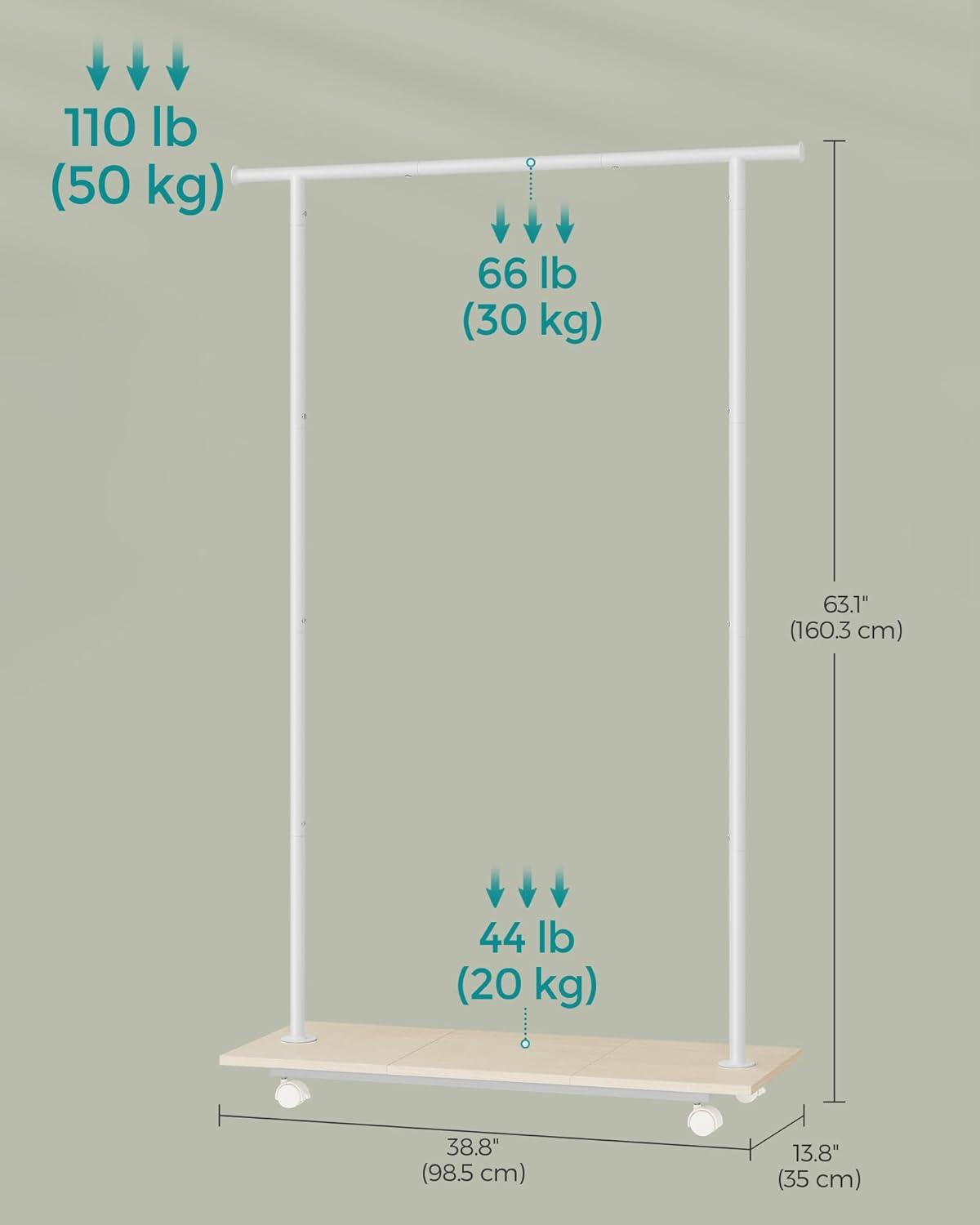 [Crafted for Strength] The robust steel rail is capable of supporting up to 66 lb, while the particleboard bottom shelf holds up to 44 lb. This garment rack allows you to store your heavy winter coats and boots without any problem