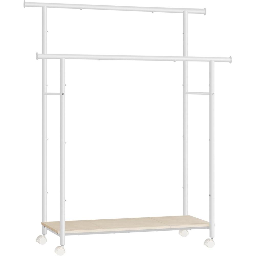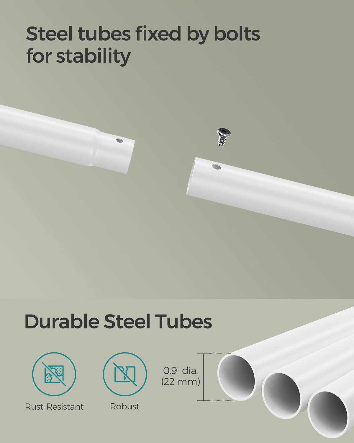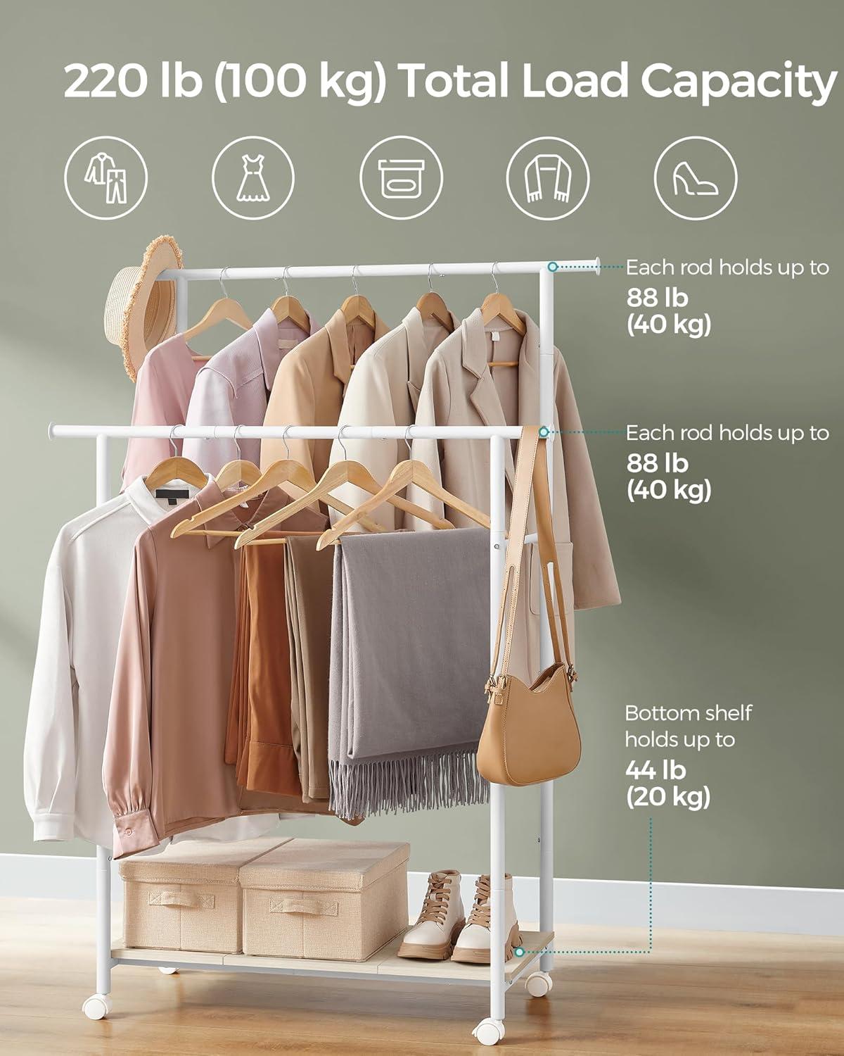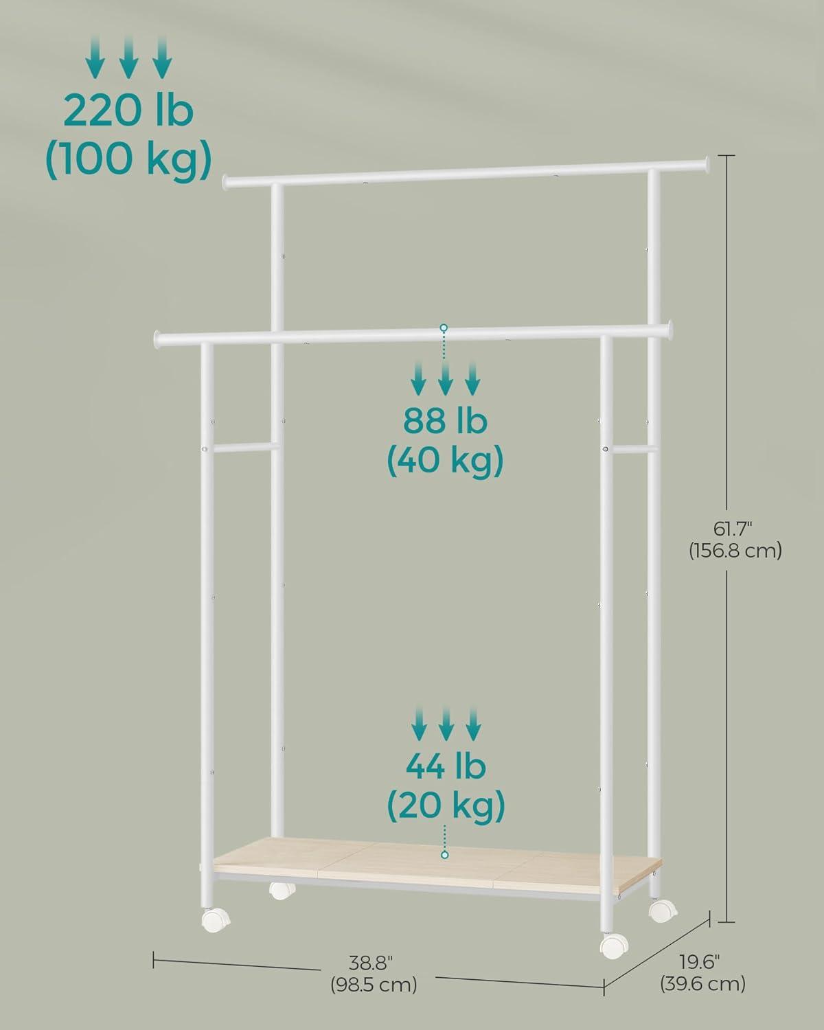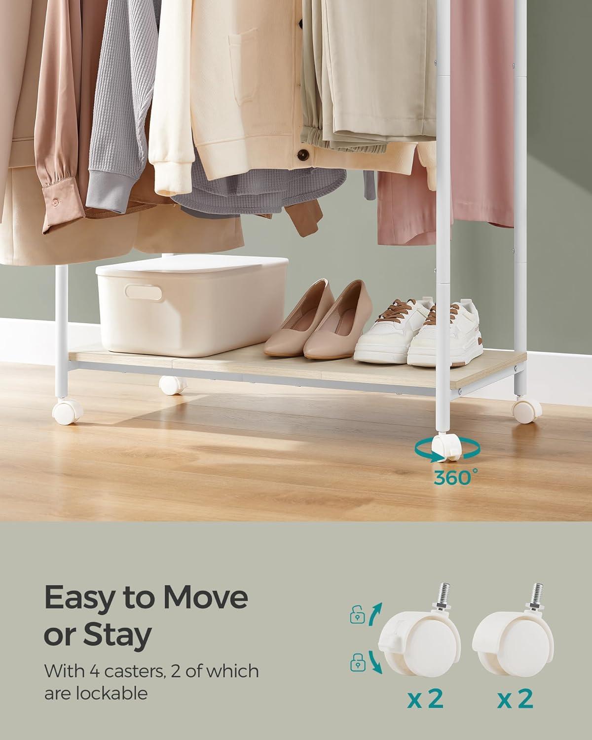 [Crafted for Strength] The robust steel rail is capable of supporting up to 66 lb, while the particleboard bottom shelf holds up to 44 lb. This garment rack allows you to store your heavy winter coats and boots without any problem