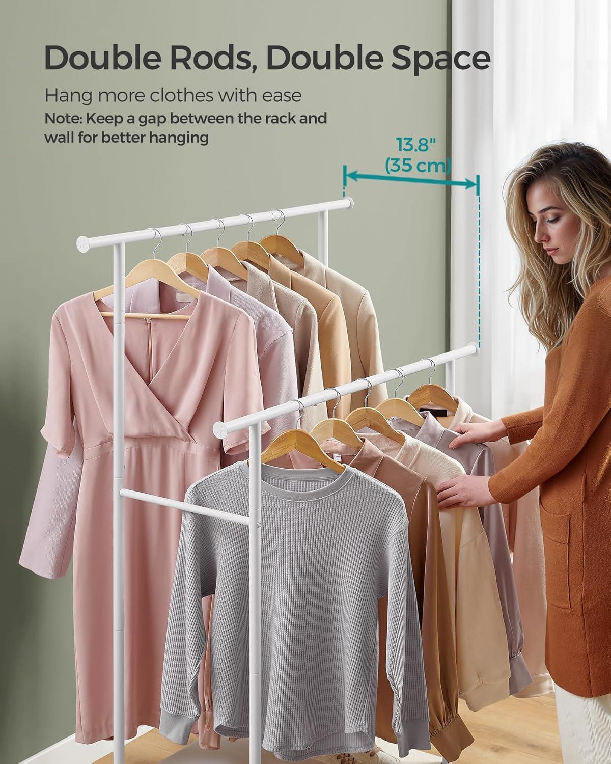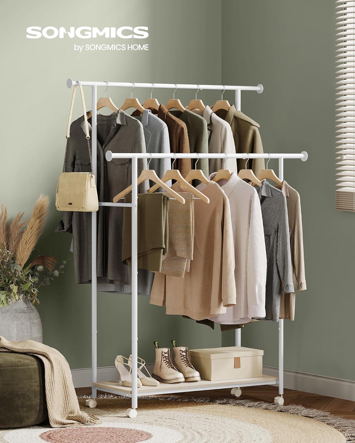 [Double Rods, Double Space] Double your garment space with our double-rod clothes rack. It also features 2 side rods for scarves and belts, and a bottom shelf for shoes and boxes. Say goodbye to clothes piling up!