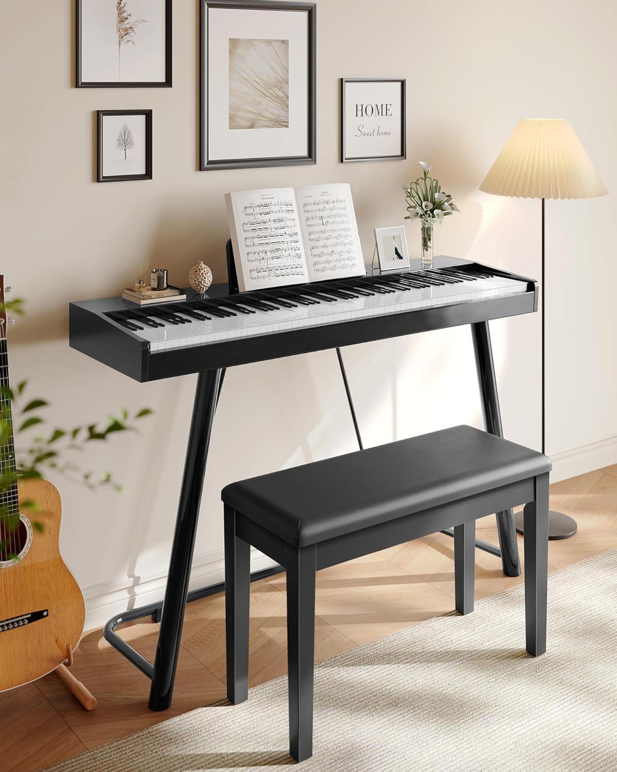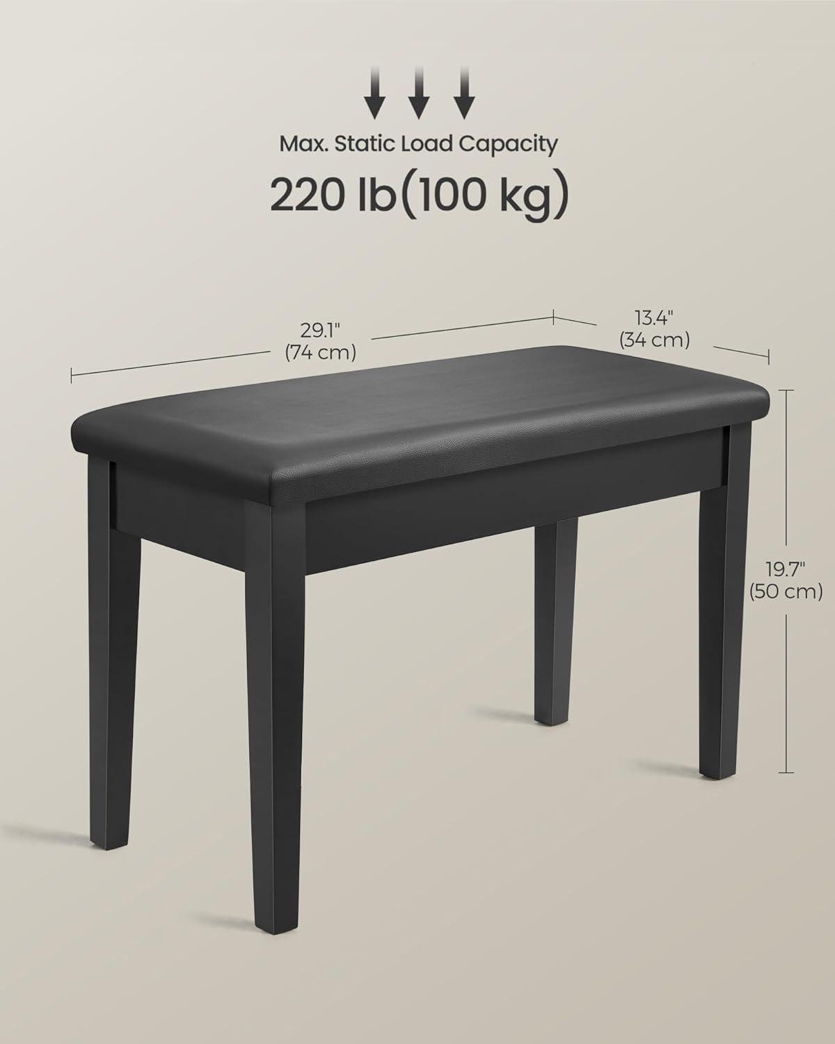 【CRAFTED WITH EXCELLENCE】This keyboard bench is padded with high-density foam for comfy seating. The premium faux leather surface is durable, water-resistant, and easy to clean. Solid wood legs offer a sturdy structure that supports up to 220 lb