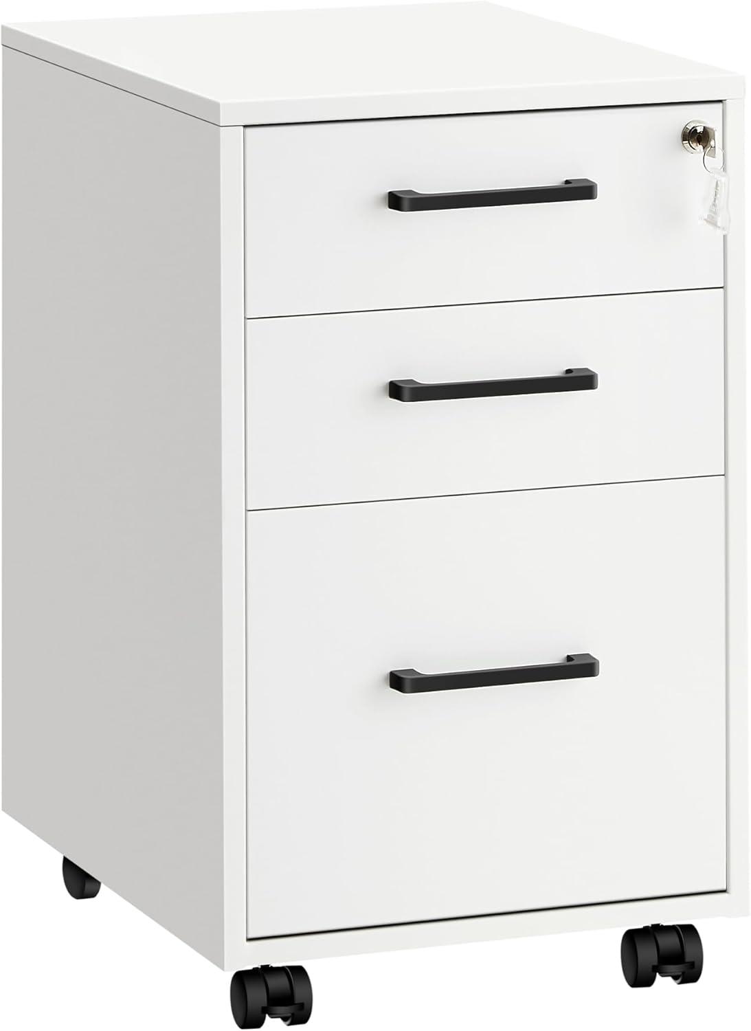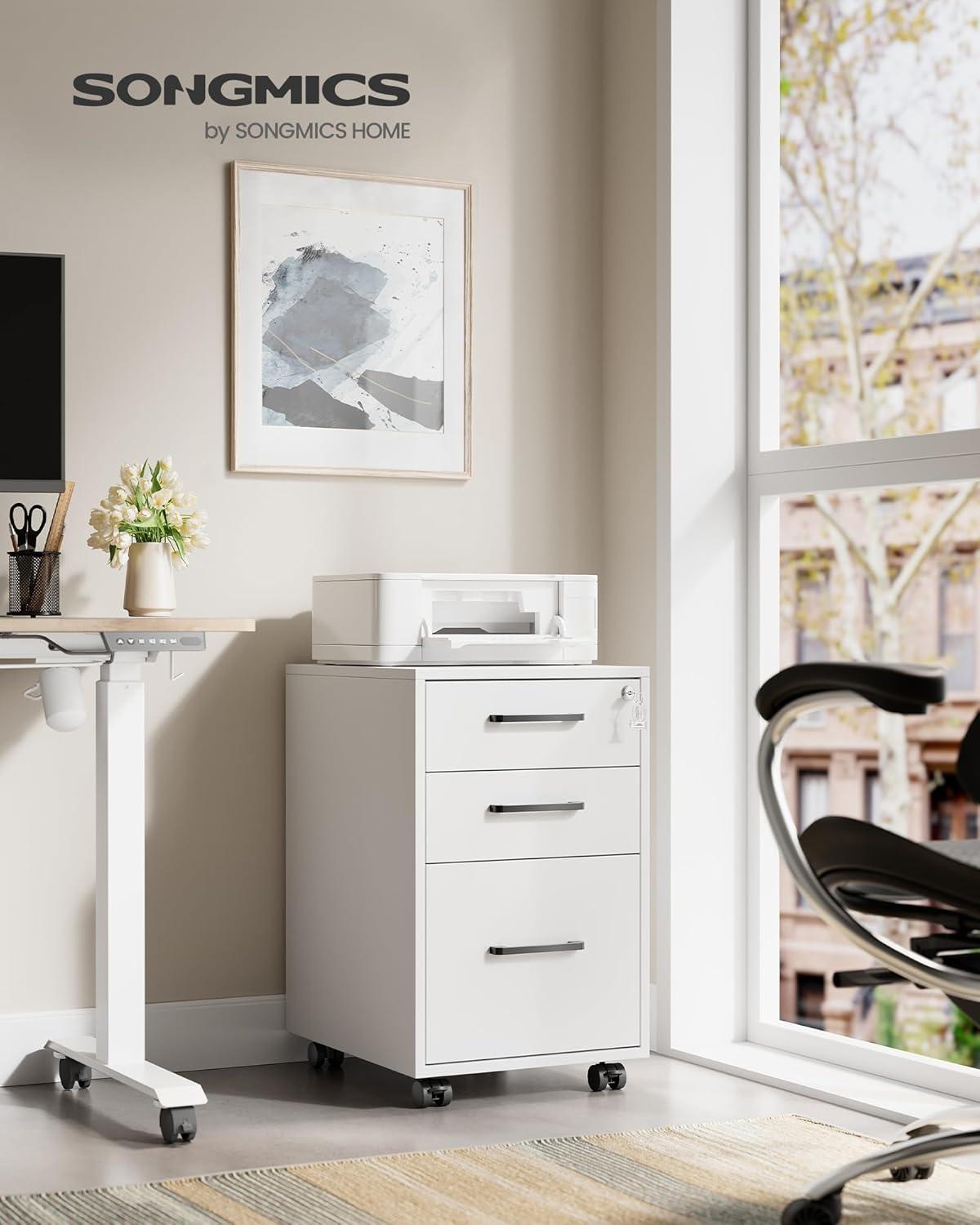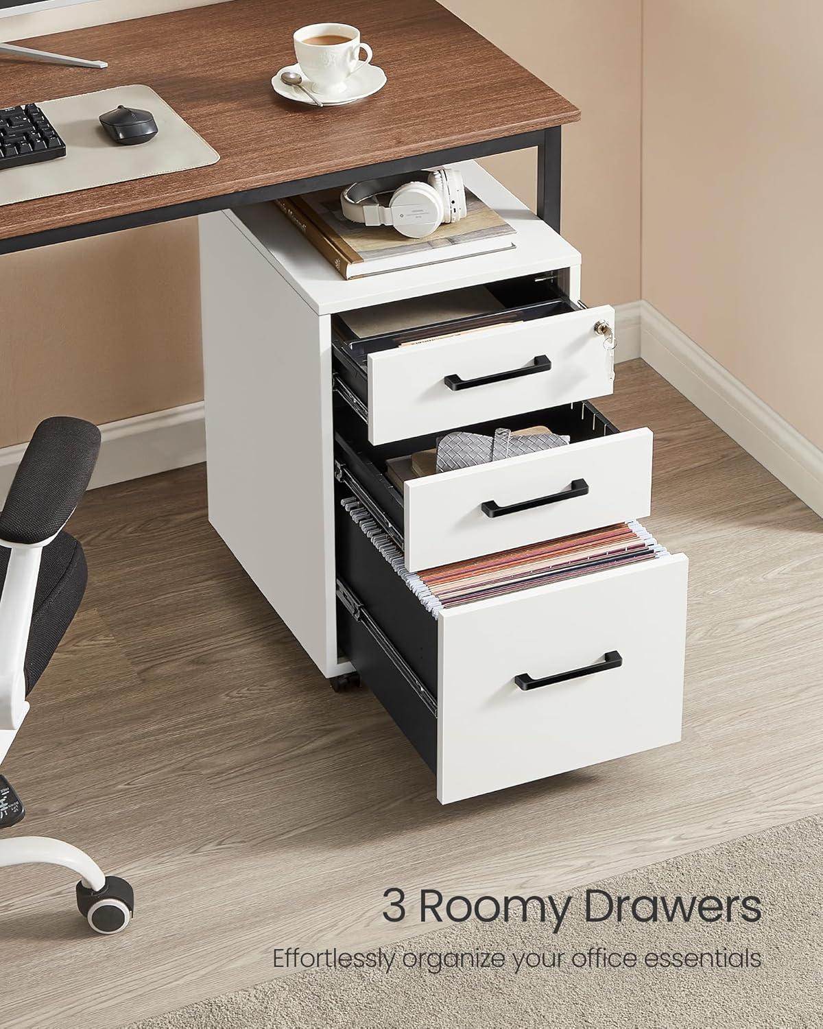 SONGMICS File Cabinet, Pre-Assembled Except Wheels and Handles, Office Filing Cabinet with Lock, for A4, Legal, Letter Sized Documents, 17.7 x 14.4 x 23.6 Inches, Rustic Brown and Black UOFC110B01V1(Matte White + Black)