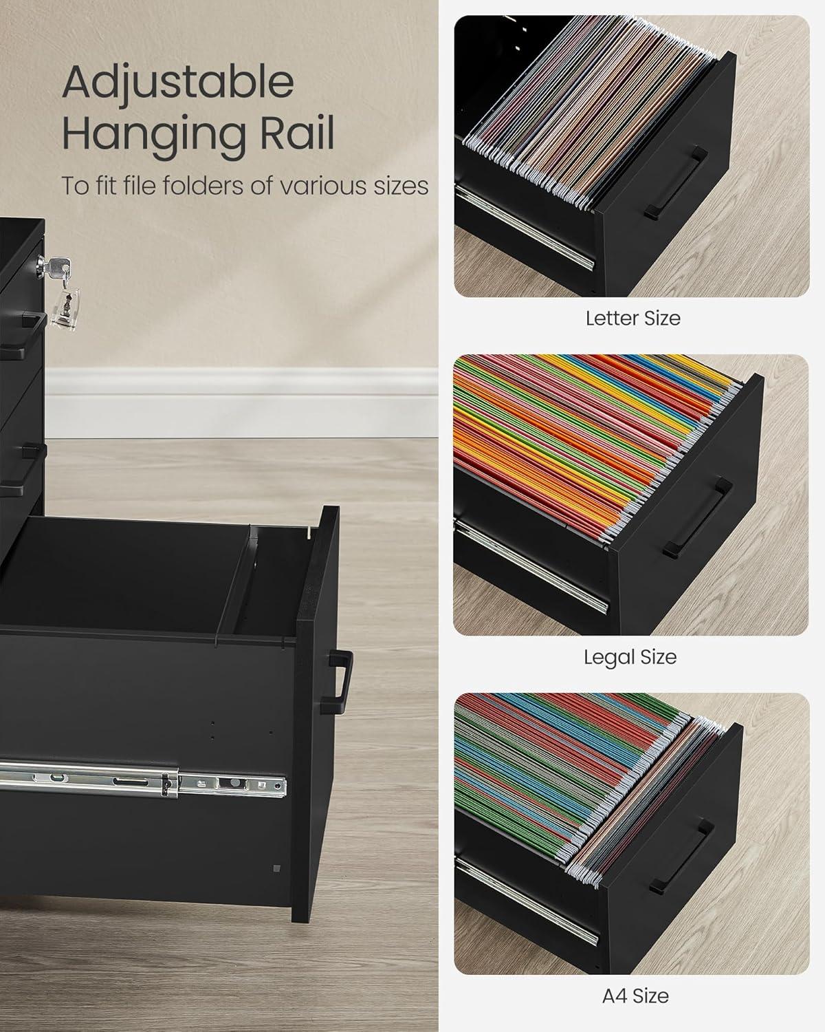 [Generous and Thoughtful] Pens, sticky notes, A4, letter or legal sized hanging files…keep them all organized and secured in the 3 drawers with a stationery tray, a hanging rail, and a lock included. Full extension slides make it smooth to open and close