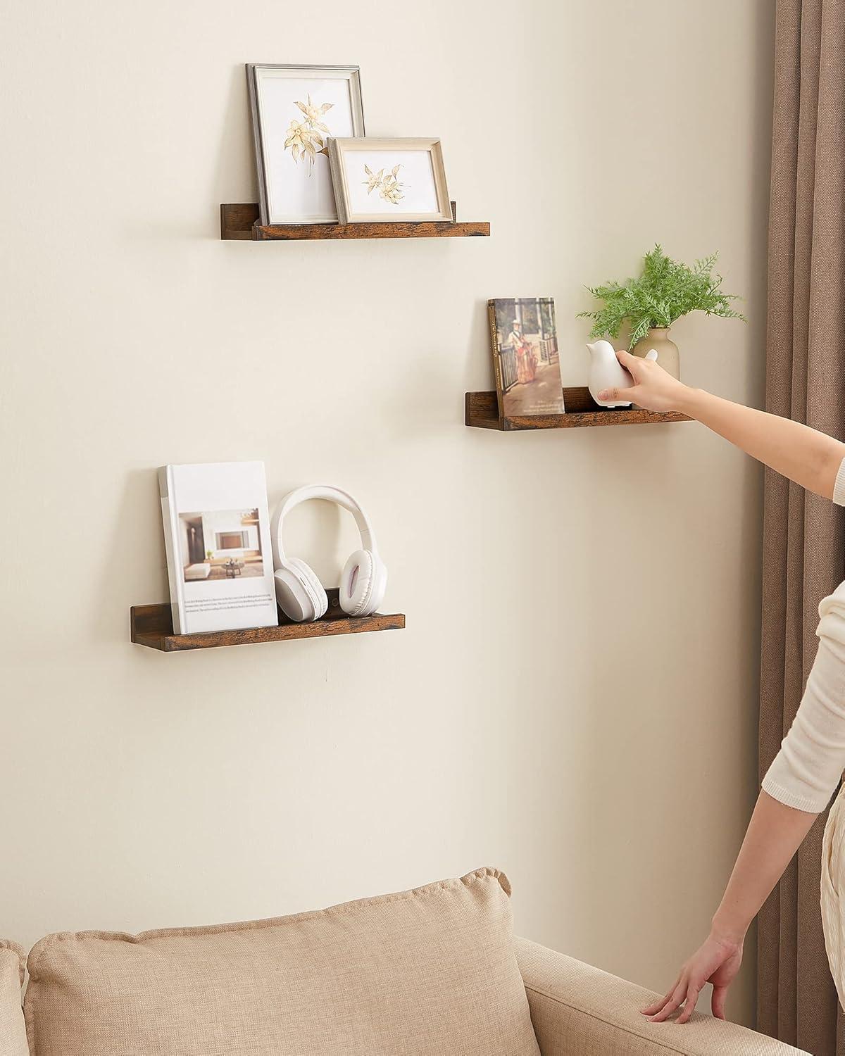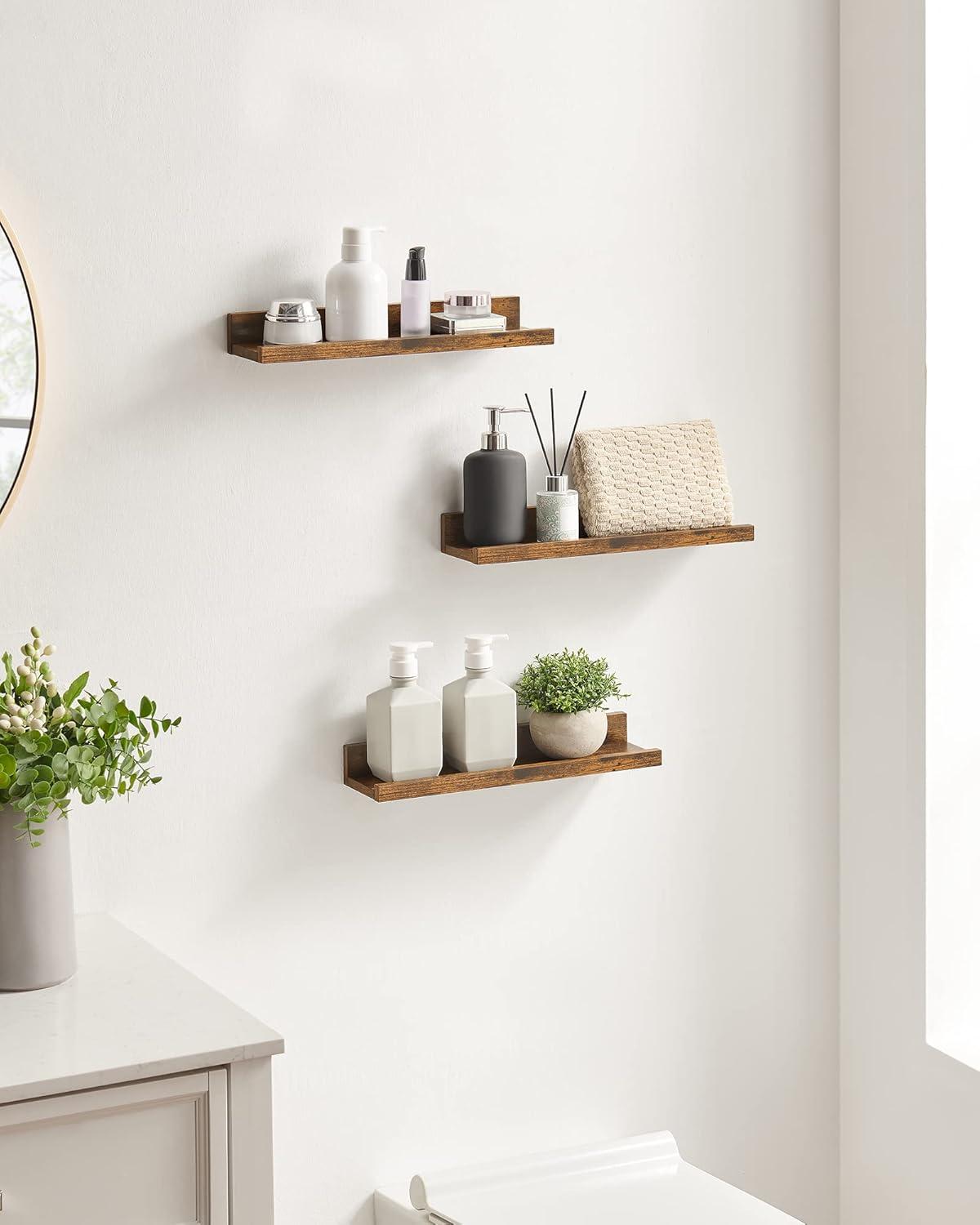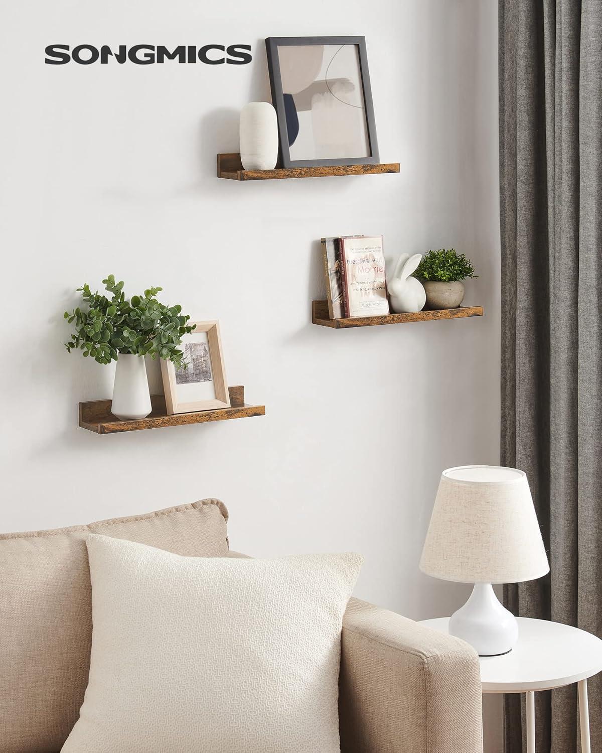 SONGMICS Floating Shelves, Set of 3 Wall Shelves, 23.6-Inch Wide, for Photo Frames and Trinkets, for Living Room, Home Office, Kitchen, Bathroom, White ULWS061W01(Rustic Brown)