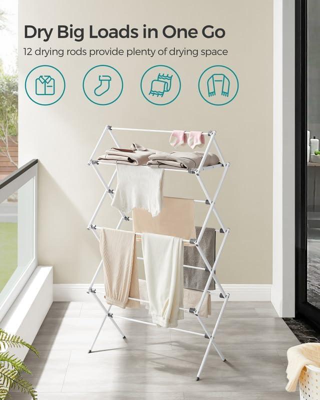 [Dry More in Less Space] Taking up only 14.6”D x 29.5”W floor space, this compact clothes airer offers plenty of drying space with its 12 rods, accommodating your towels, scarves, shoes, and more