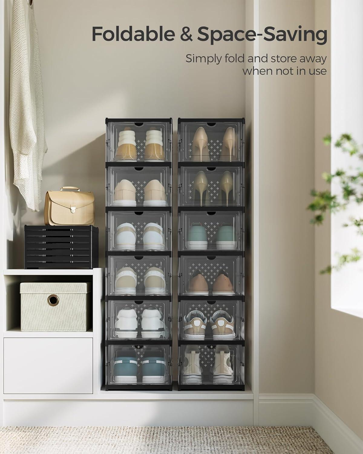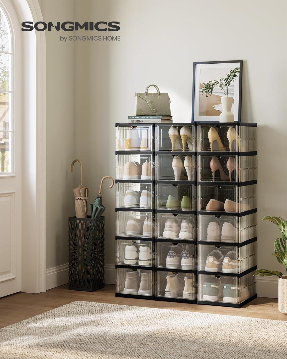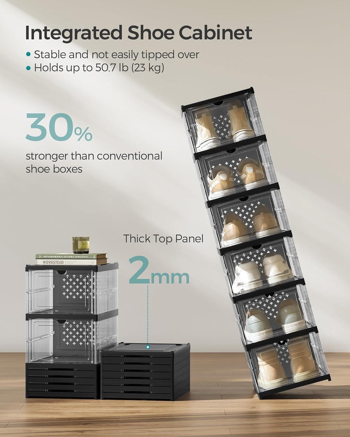 【STRONG AND DURABLE】Our shoe boxes are designed with an integrated, robust structure, crafted from premium quality PP plastic, offering 30% more load capacity than average shoe boxes. Rest assured, your footwear collection is in reliable hands