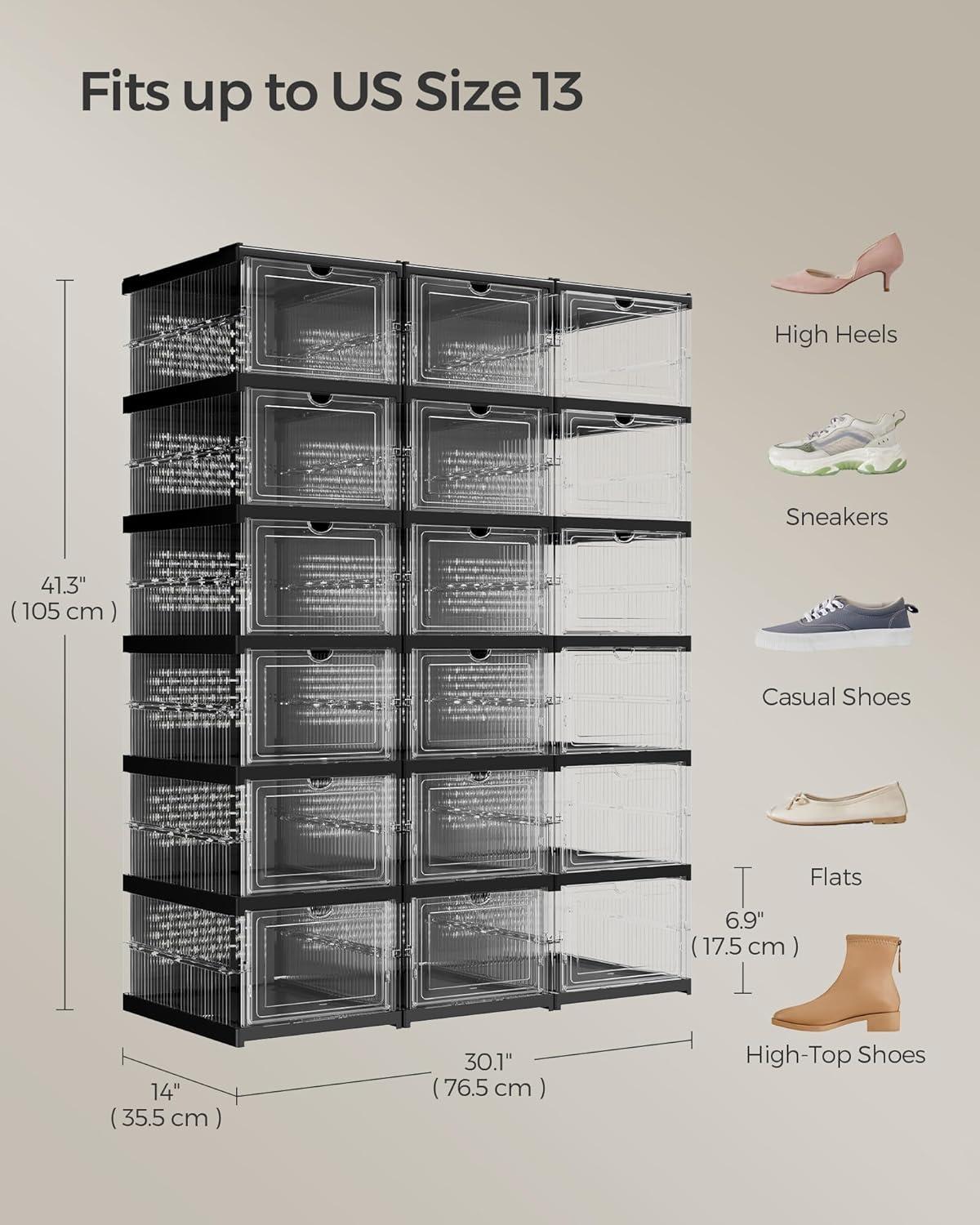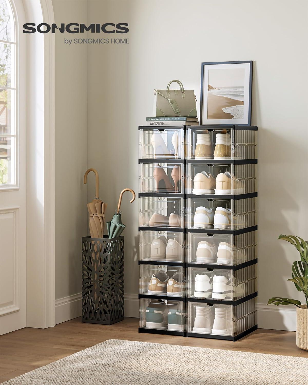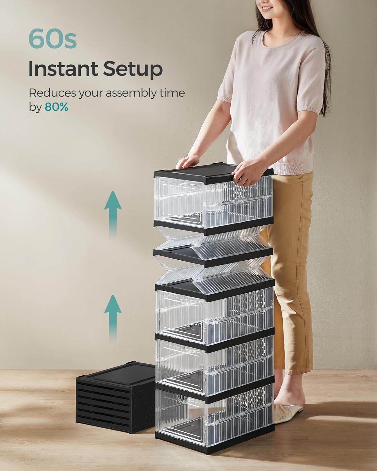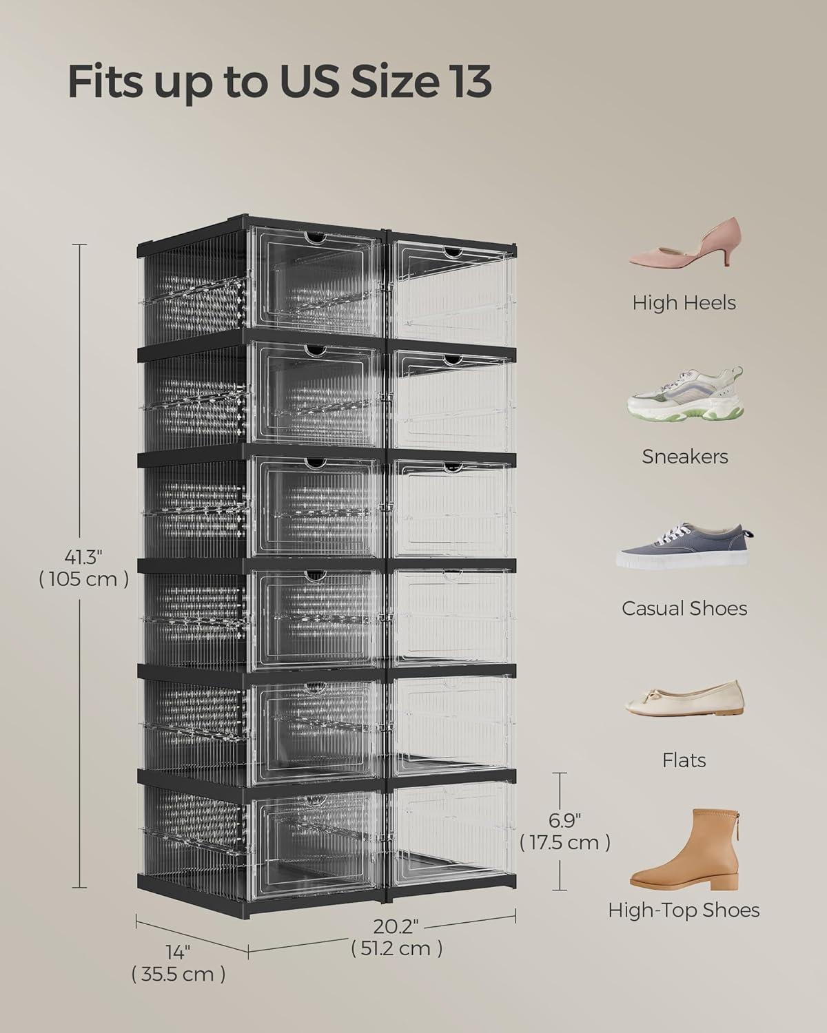 【STRONG AND DURABLE】Our shoe boxes are designed with an integrated, robust structure, crafted from premium quality PP plastic, offering 30% more load capacity than average shoe boxes. Rest assured, your footwear collection is in reliable hands