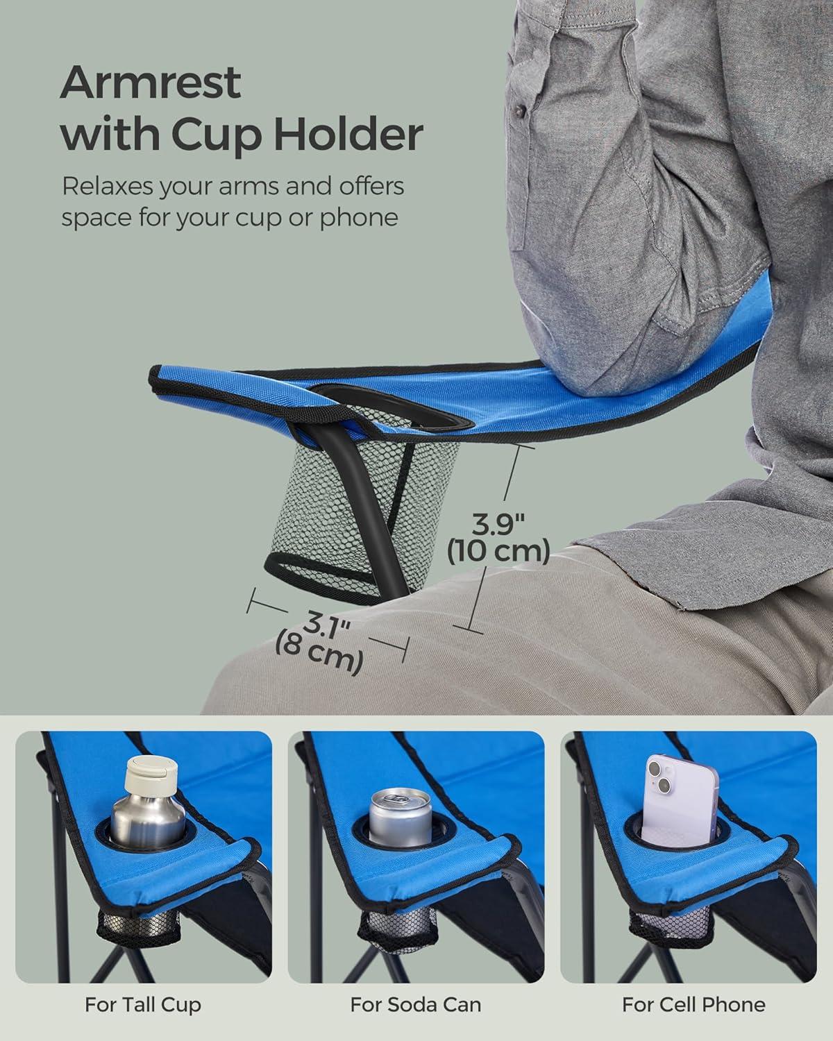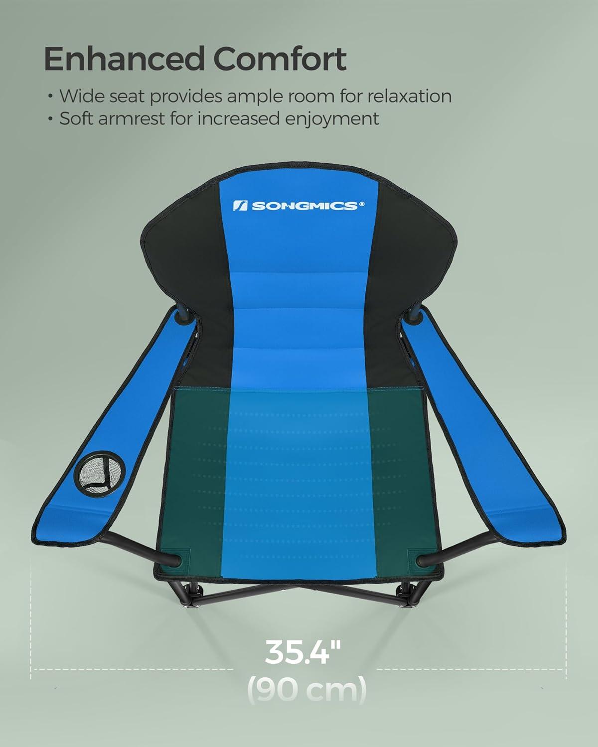 SONGMICS Folding Camping Chair, with Comfortable Sponge Seat, Cup Holder, Heavy Duty Structure, Max Load Capacity 551 lb, Outdoor Picnic Chair, Red and Black UGCB06BK(Blue + Black)