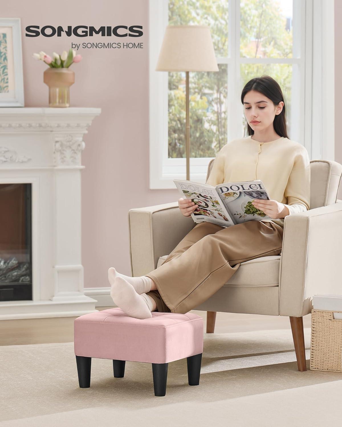 SONGMICS Foot Stool with Legs, Small Footstool Ottoman, Linen-Look Fabric Seat with Thick Cushion, for Living Room, Bedroom, Entryway, 330 lb Weight Capacity, Ink Black ULOM502B01(Jelly Pink)