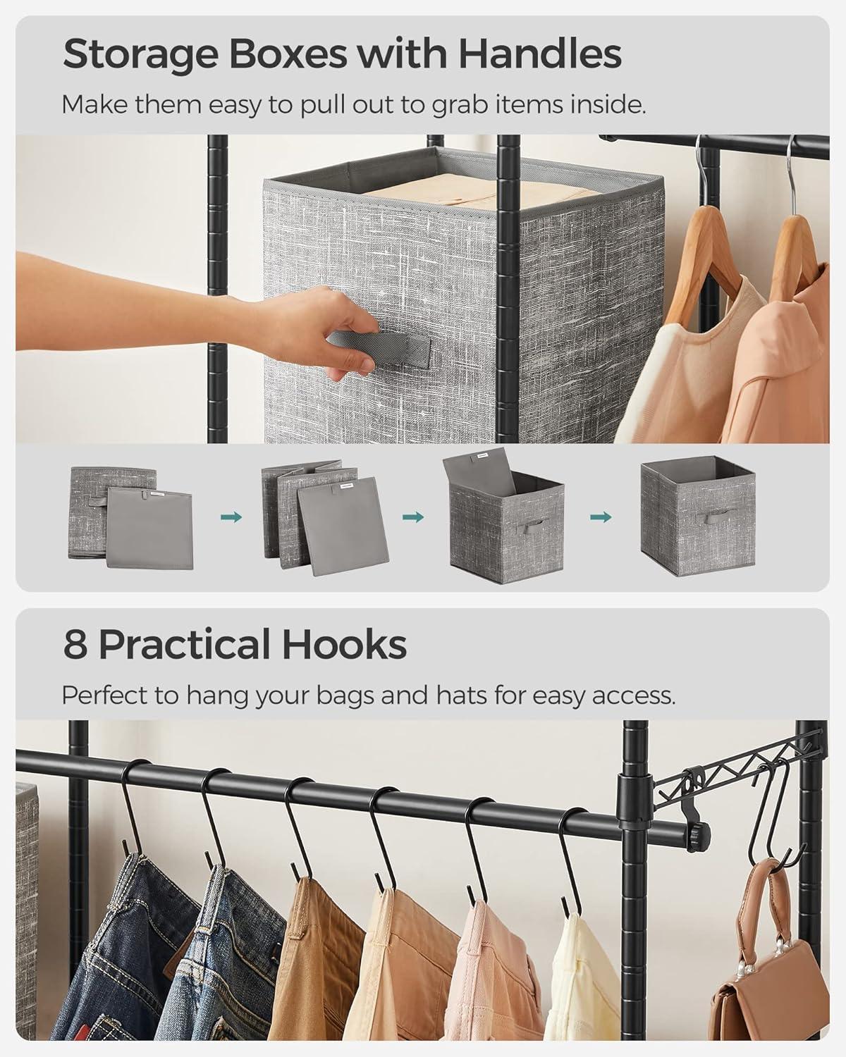 [1 Box & 8 Hooks, Add Handy Storage] This garment rack comes with a 10.2’’ x 10.2’’ x 11’’ non-woven fabric box that can be used anywhere you like to hide small items for a tidy look and 8 hooks to hang your bags and hats for easy access