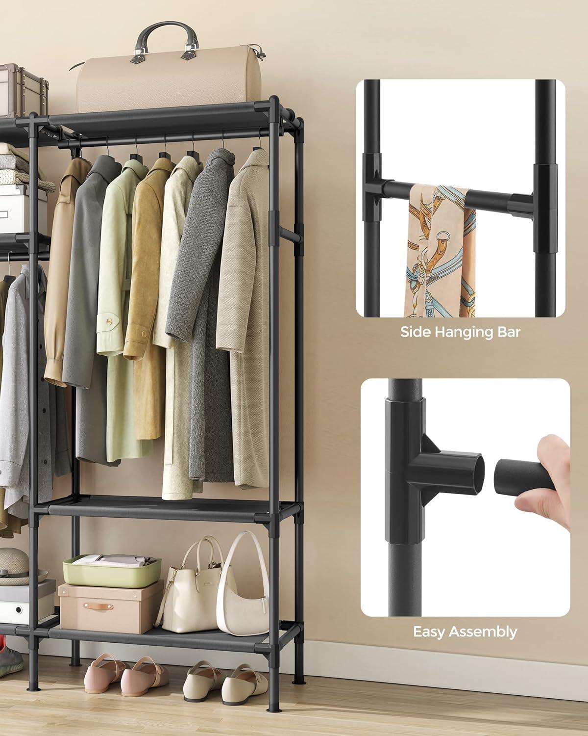 SONGMICS Heavy Duty Clothes Rack, 65 Inch Freestanding Portable Wardrobe with Hanging Rails and Shelves, Total Load 242 lb, Easy Assembly, for Cloakroom, Bedroom, Black URDR201B02(3-Row without Cover)