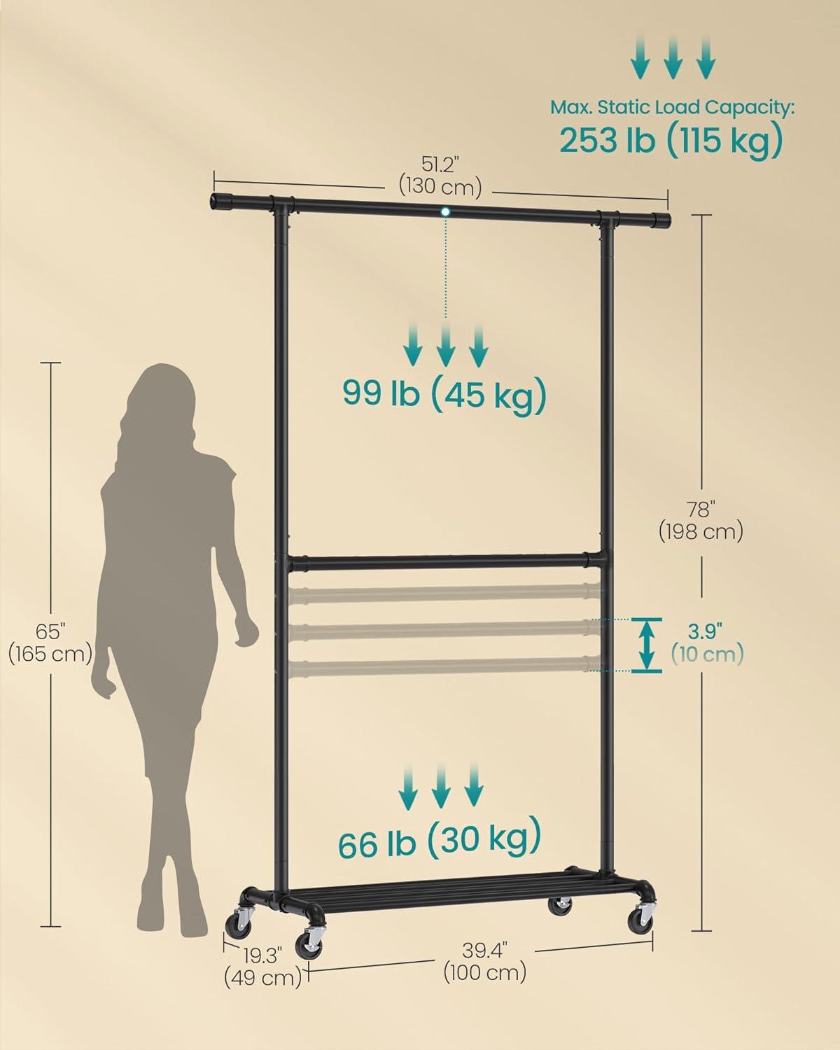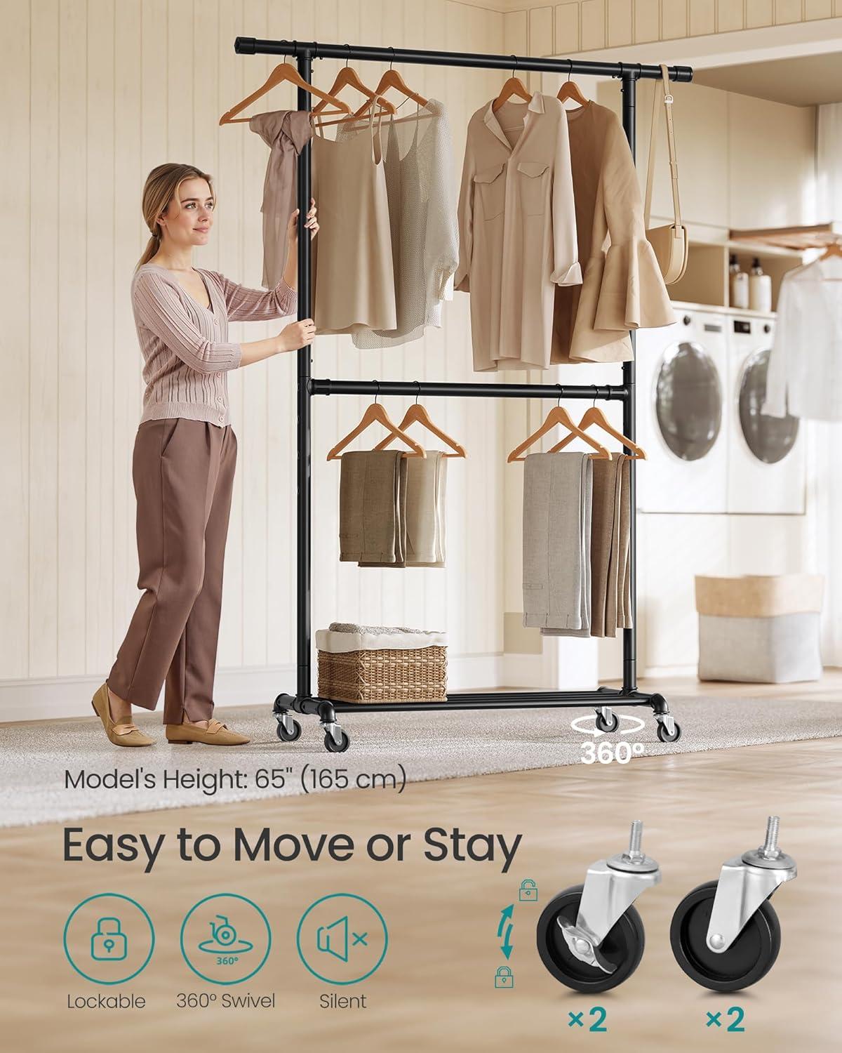 SONGMICS Heavy-Duty Clothes Rack, Double-Rod Clothing Rack for Hanging Clothes, Industrial Garment Rack on Wheels, Metal Frame, 2 Casters with Brakes, Commercial Display, Black UHSR60B(Double Rod)