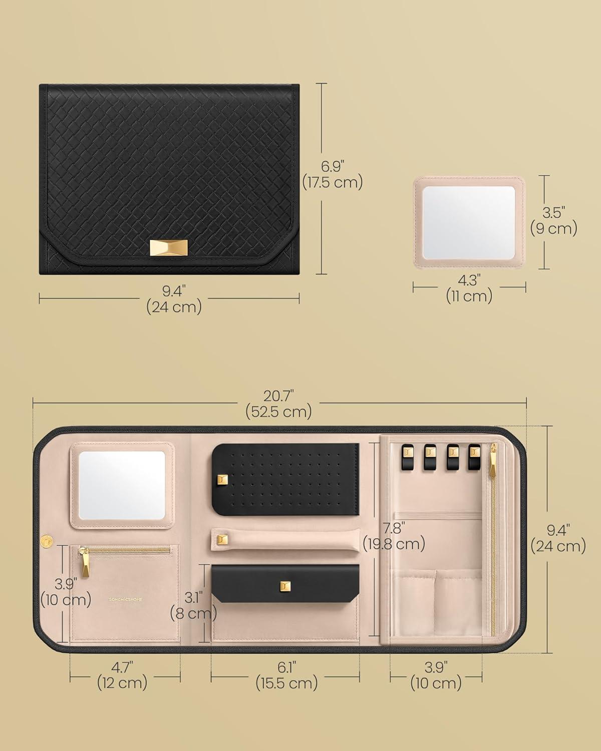 SONGMICS HOME Travel Jewelry Case, Foldable Jewelry Organizer with Mirror, Sectioned Storage, Large Capacity, Woven Embossed PU Leather, Gift Idea, Jelly Pink UJBC196R01(Ink Black)