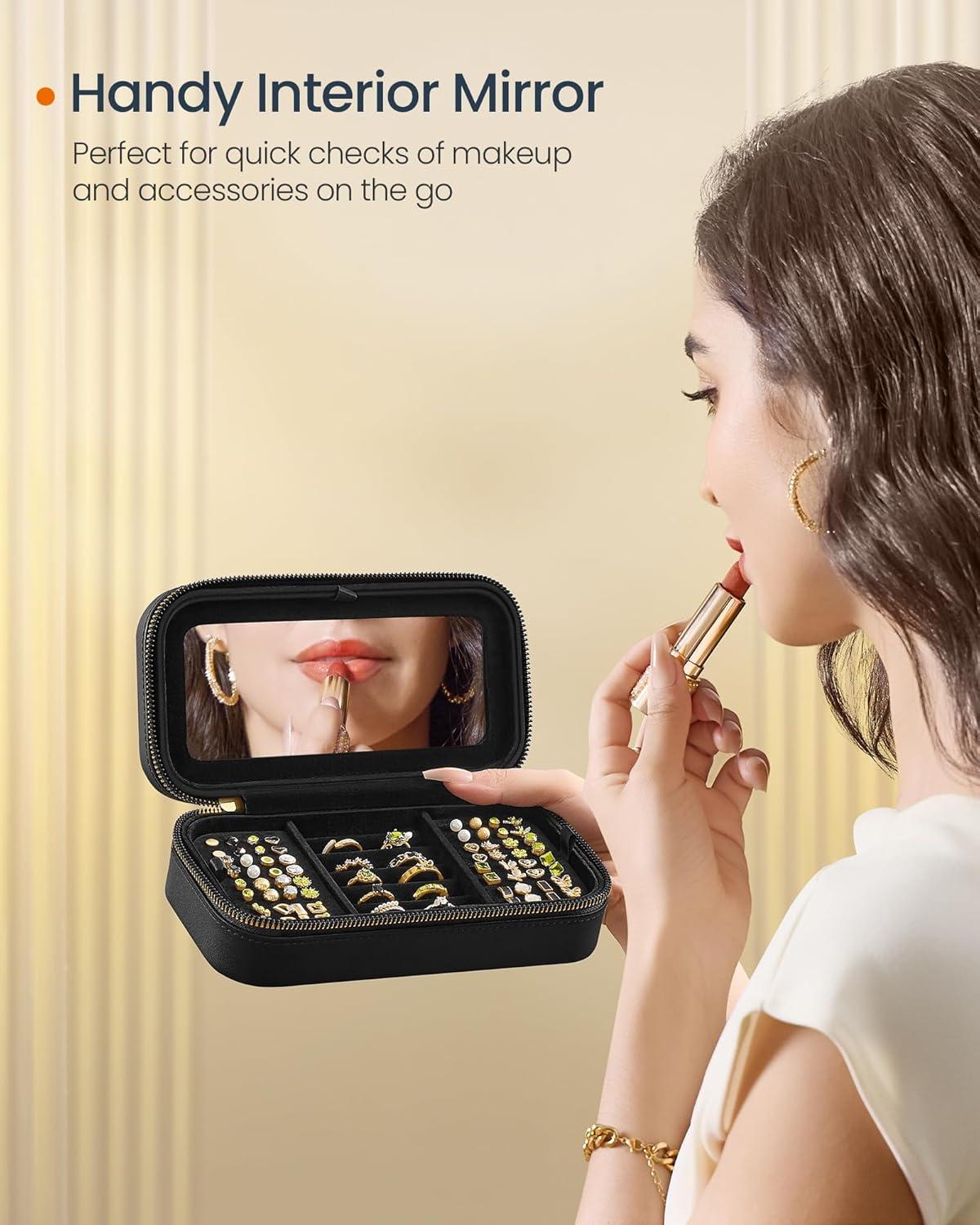【COMPACT AND TRAVEL-READY】Travel in style with our portable jewelry box, a compact 4.1″D x 8″W x 2.4″H size that effortlessly fits into your bag or suitcase. Complete with an independent mirror for quick makeup checks and smooth zippers for easy access
