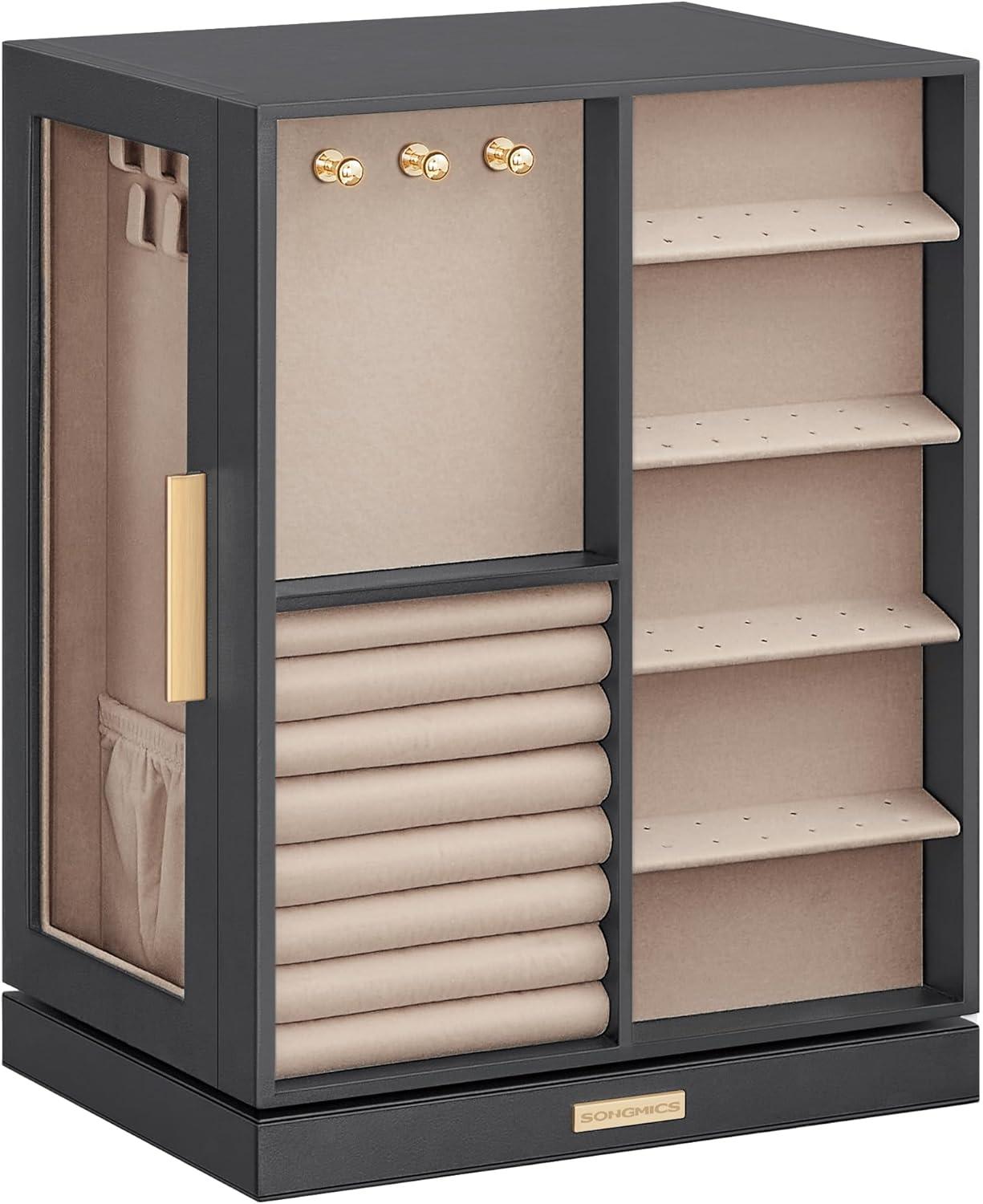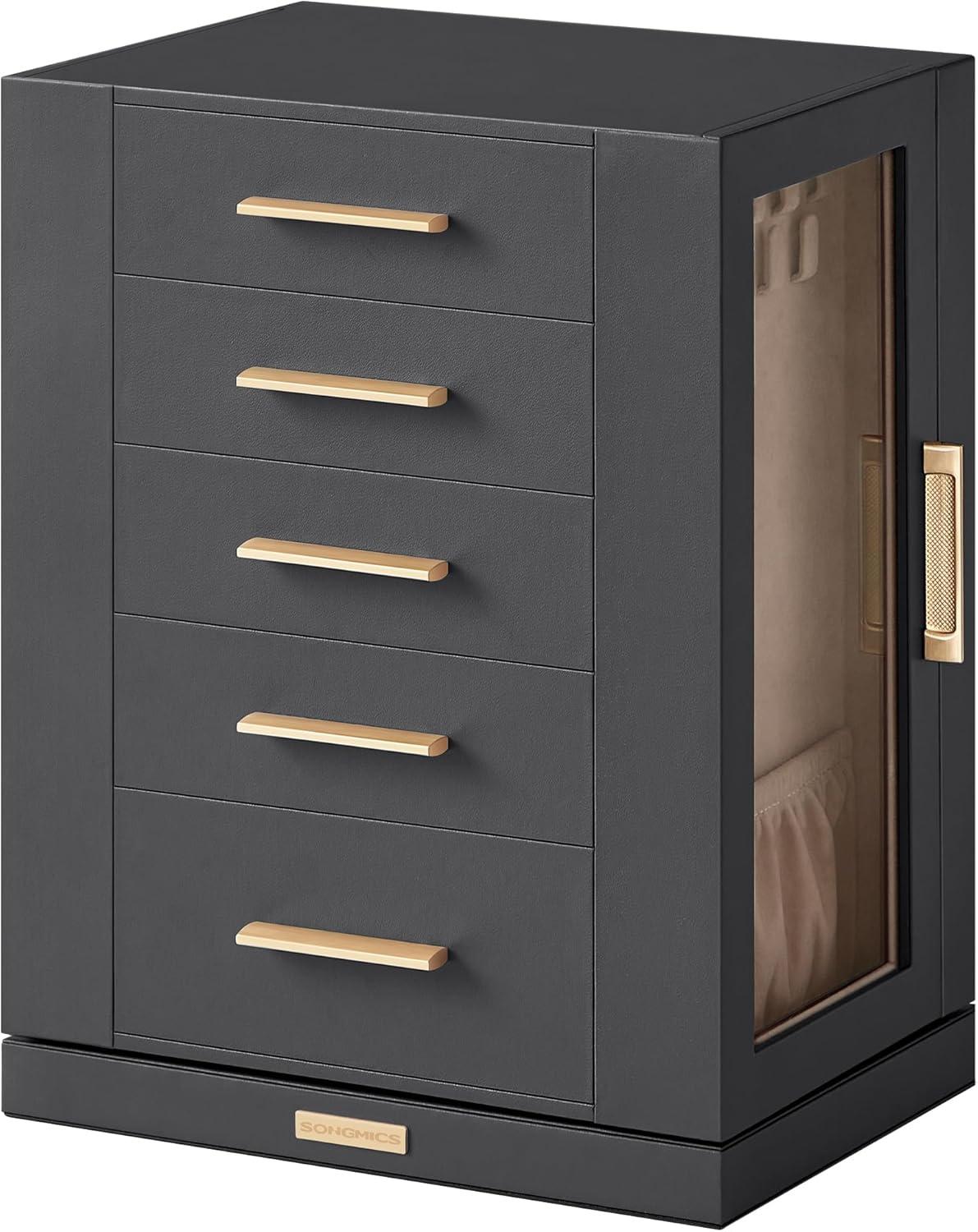 [Spacious Meets Versatile] This 6.3 x 8.7 x 11.2 inches jewelry box is designed with ring slots, necklace hooks, stud earring holes, 5 drawers for brooches and hair accessories, and 18 necklace hooks. It provides convenient storage for all jewelry