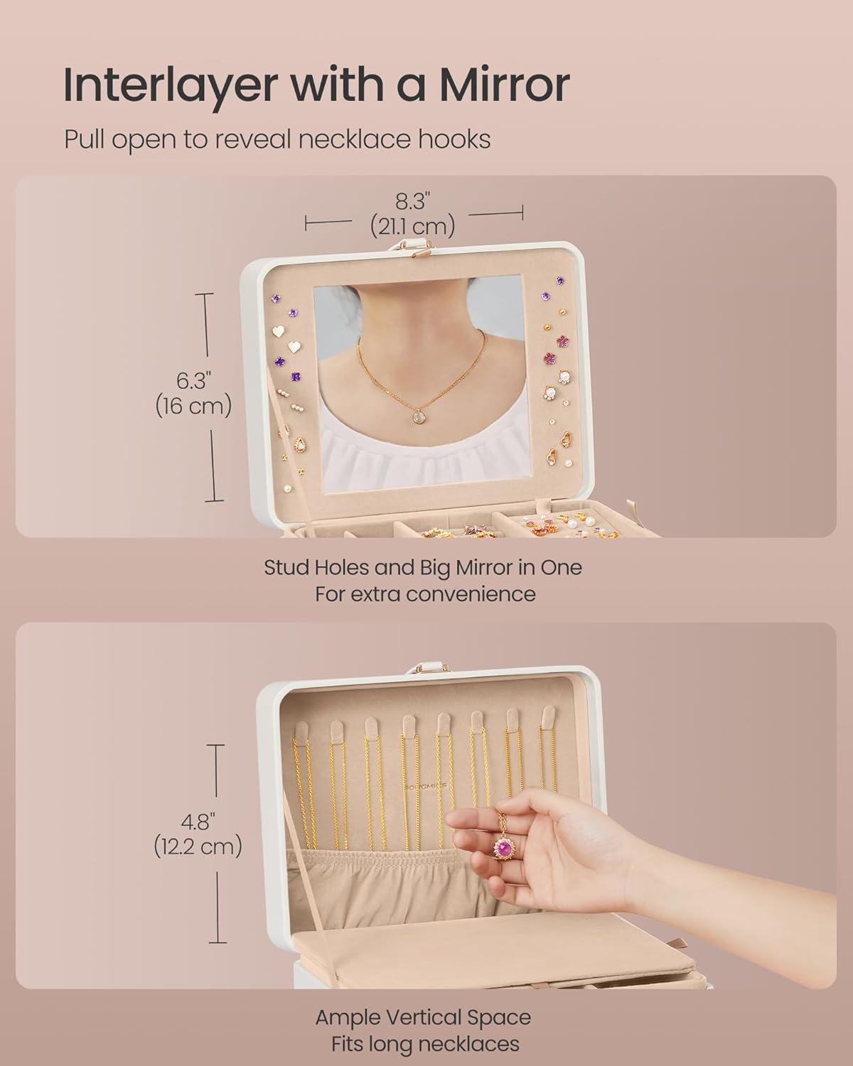[Interior Mirror & Thoughtful Details] The jewelry case boasts a mirror to check your makeup and jewelry, removable cross-shaped dividers to accommodate larger accessories, and a secure zipper for reliable closure