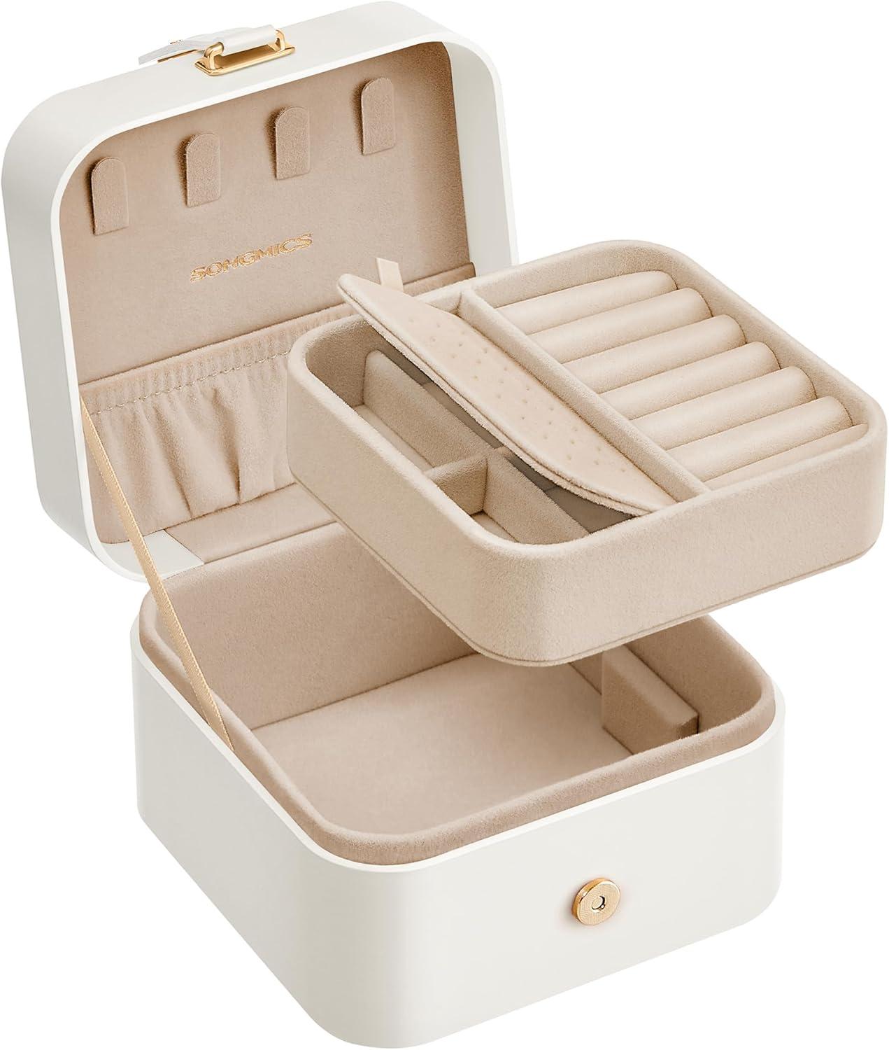 SONGMICS Jewelry Box, 4.5 x 4.5 x 2.2 Inches Travel Jewelry Box with Interior Mirror, PU Leather Jewelry Storage for Women, Small Jewelry Organizer, Portable, Gift Idea, Ink Black UJBC146BKV1(Cloud White)