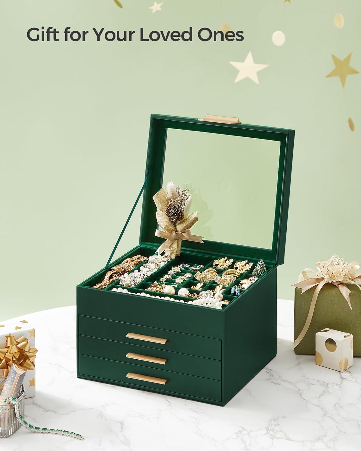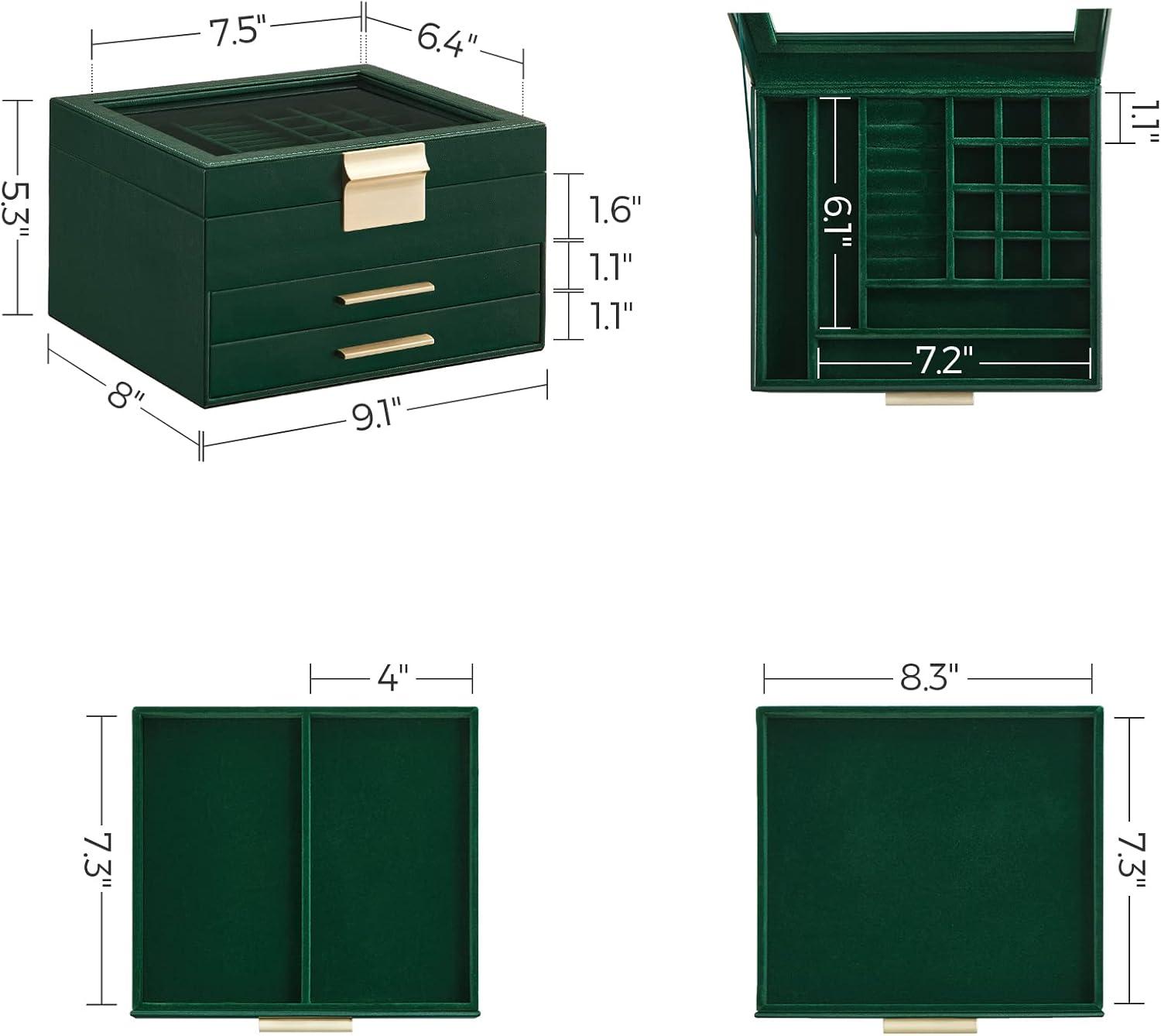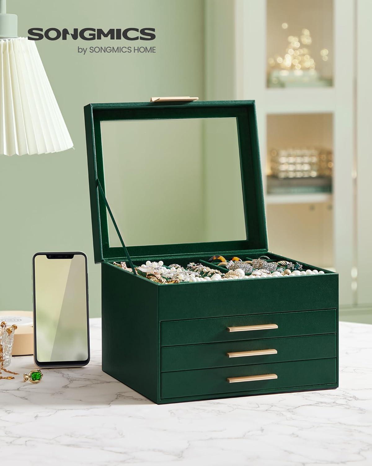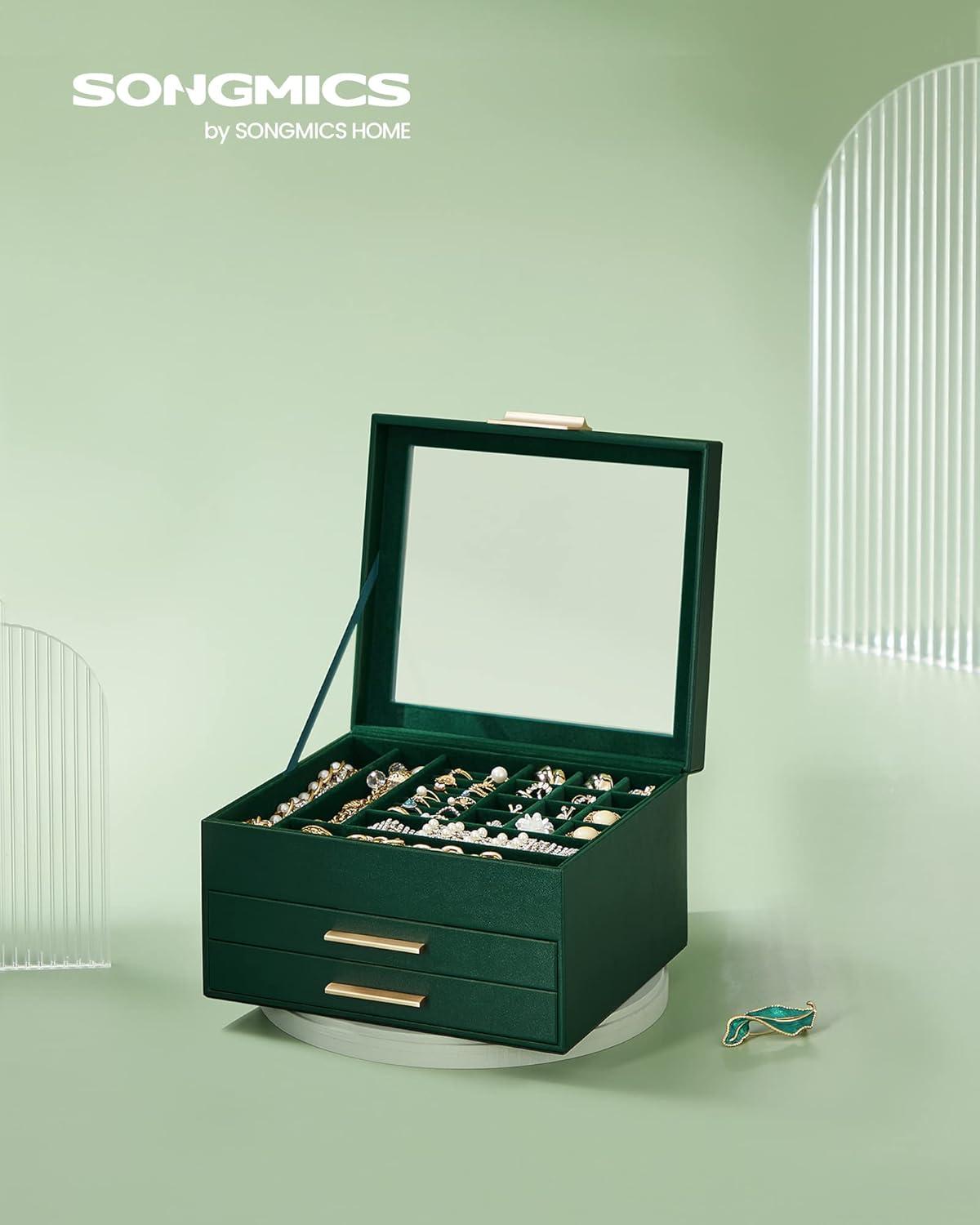 SONGMICS Jewelry Box Organizer with Glass Lid, 3-Layer Jewelry Storage, with 2 Drawers, Modern Style, 8 x 9.1 x 5.3 Inches, Cloud White and Gold Color UJBC239WT(Forest Green + Gold)