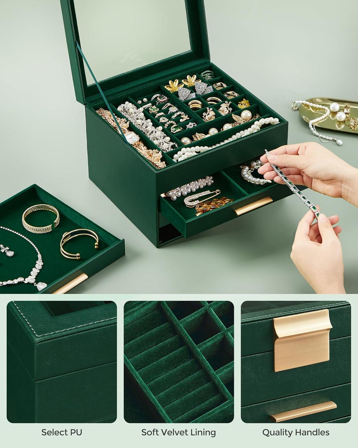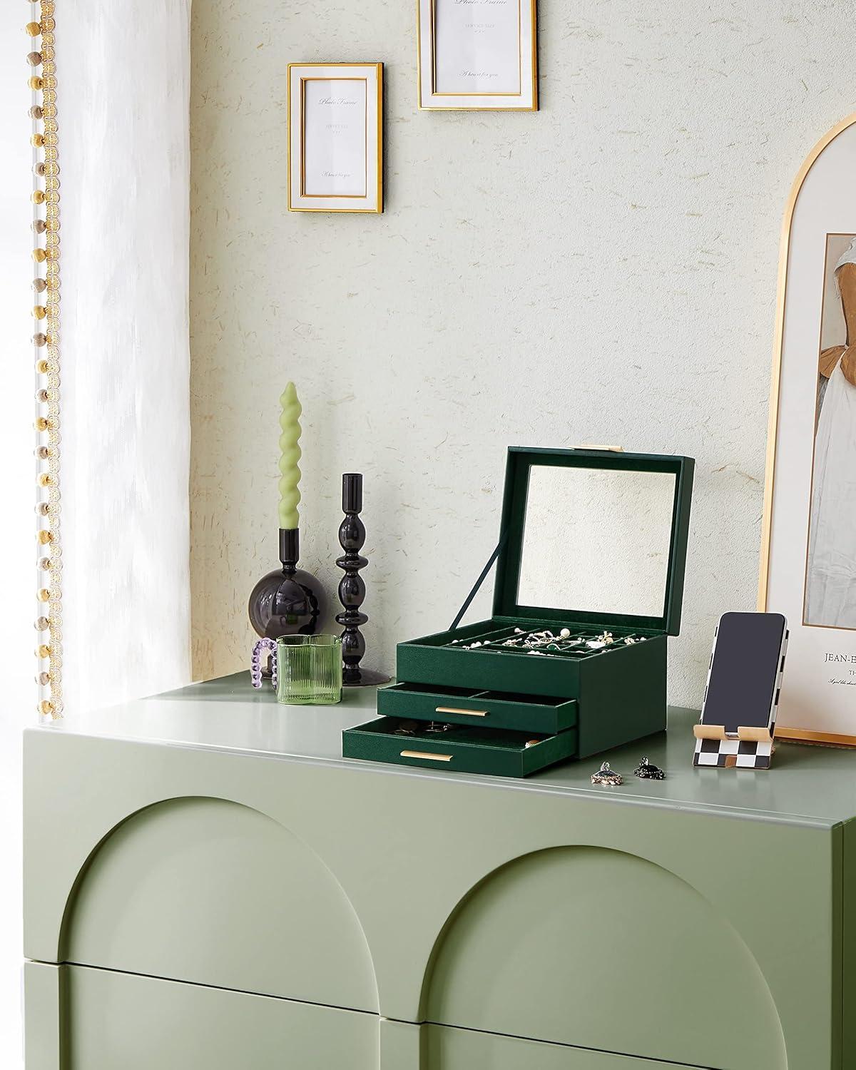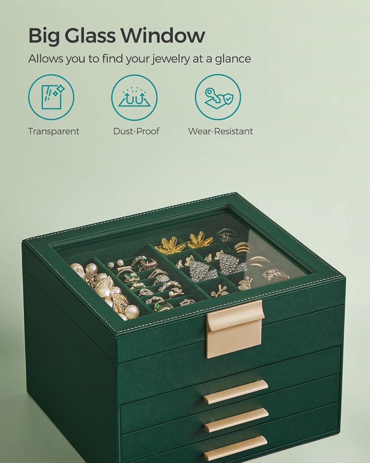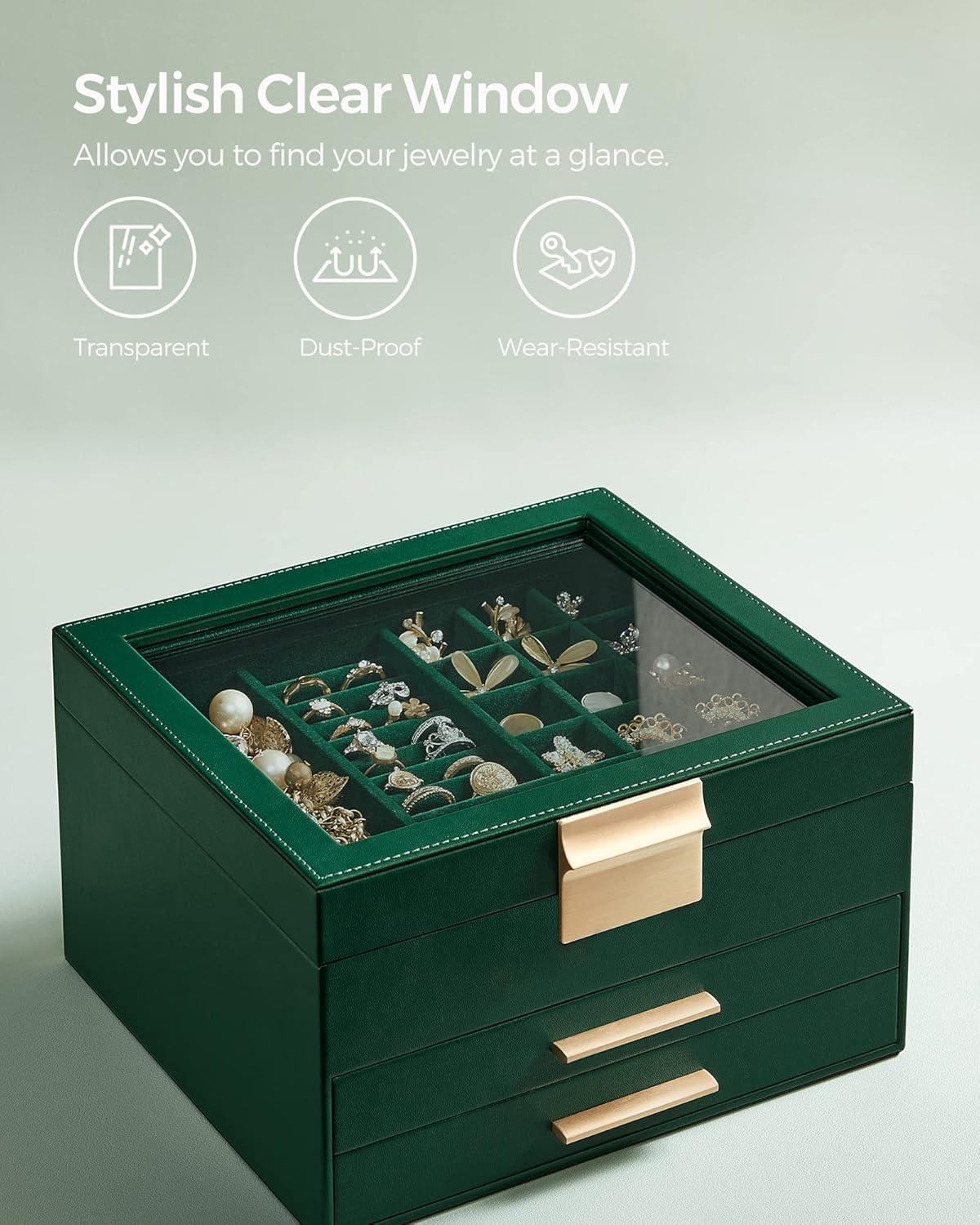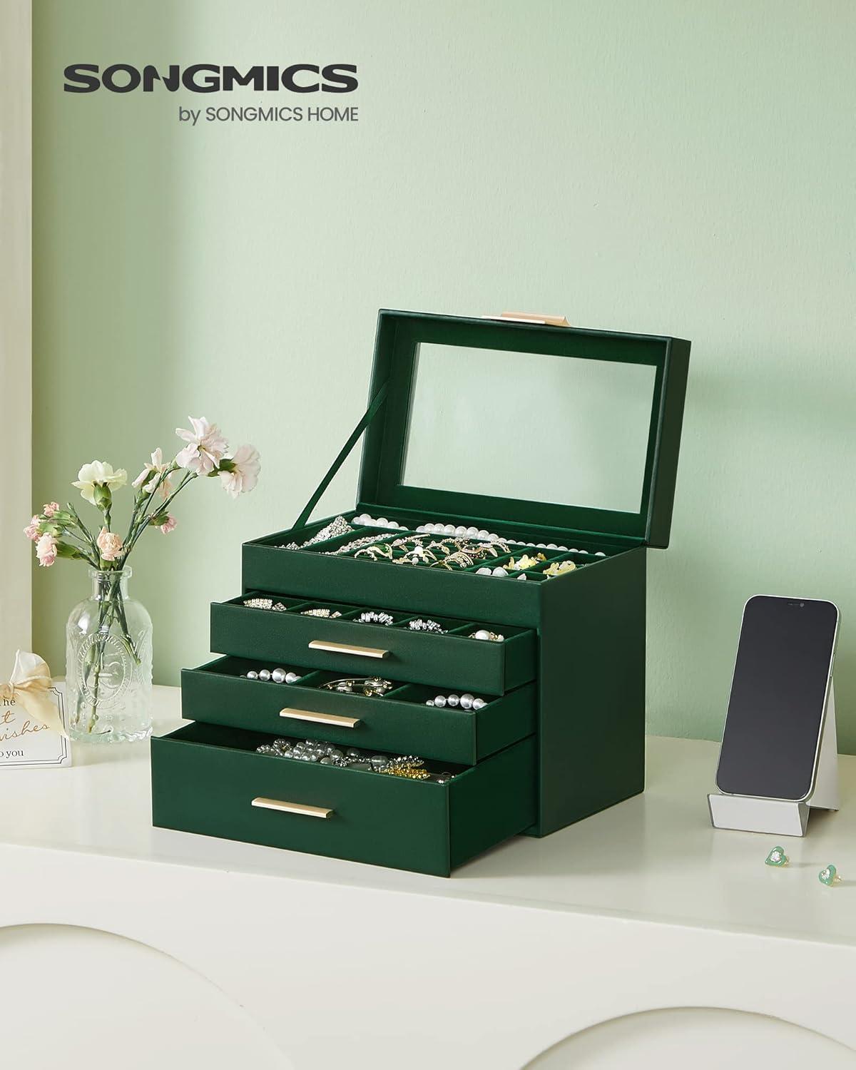 SONGMICS Jewelry Box Organizer with Glass Lid, 3-Layer Jewelry Storage, with 2 Drawers, Modern Style, 8 x 9.1 x 5.3 Inches, Cloud White and Gold Color UJBC239WT(Forest Green + Gold)