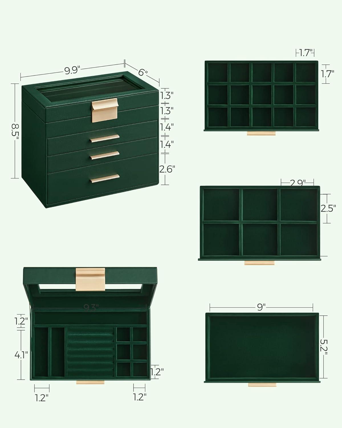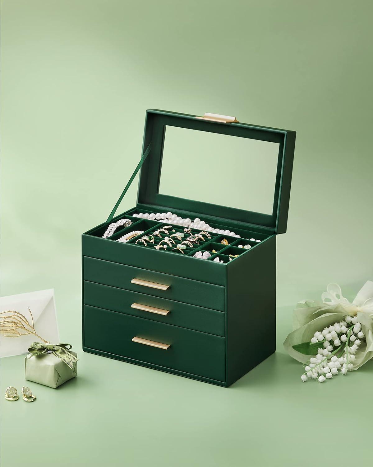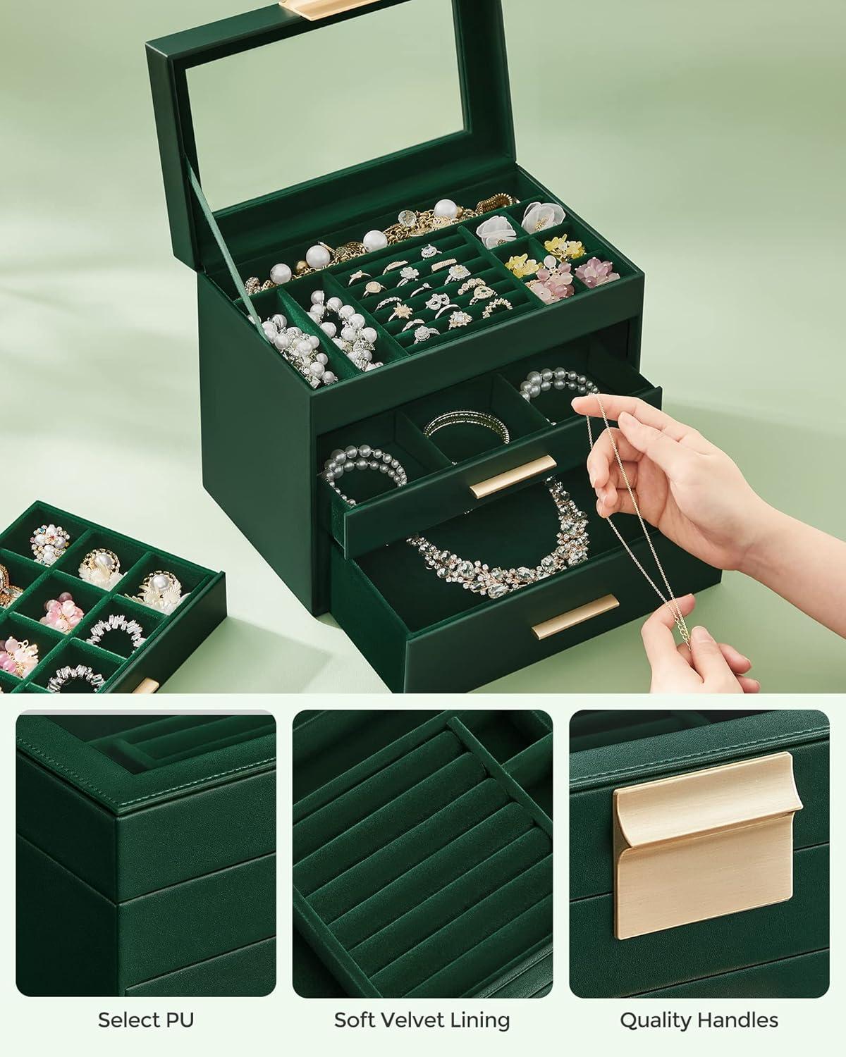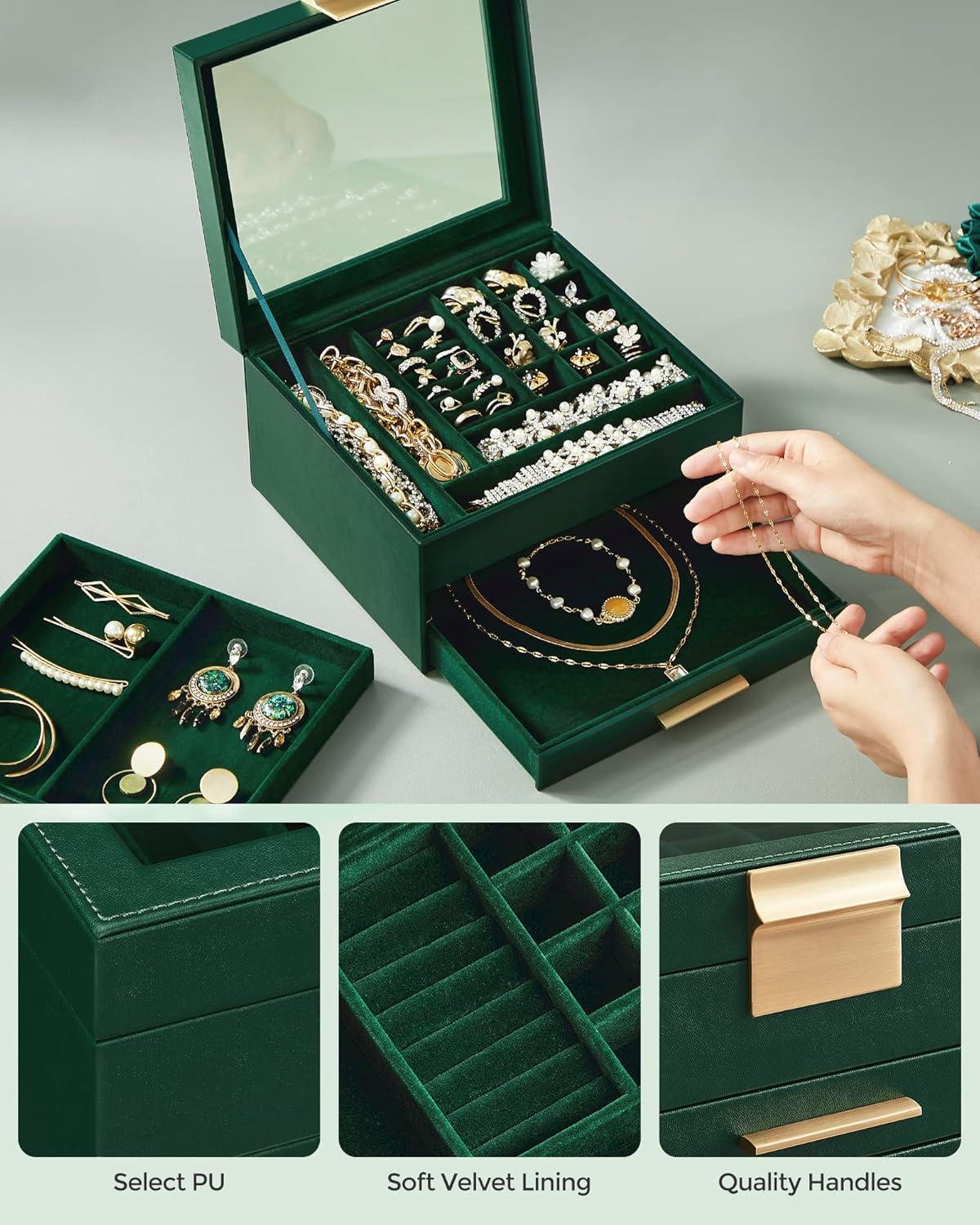 SONGMICS Jewelry Box Organizer with Glass Lid, 3-Layer Jewelry Storage, with 2 Drawers, Modern Style, 8 x 9.1 x 5.3 Inches, Cloud White and Gold Color UJBC239WT(Forest Green + Gold)