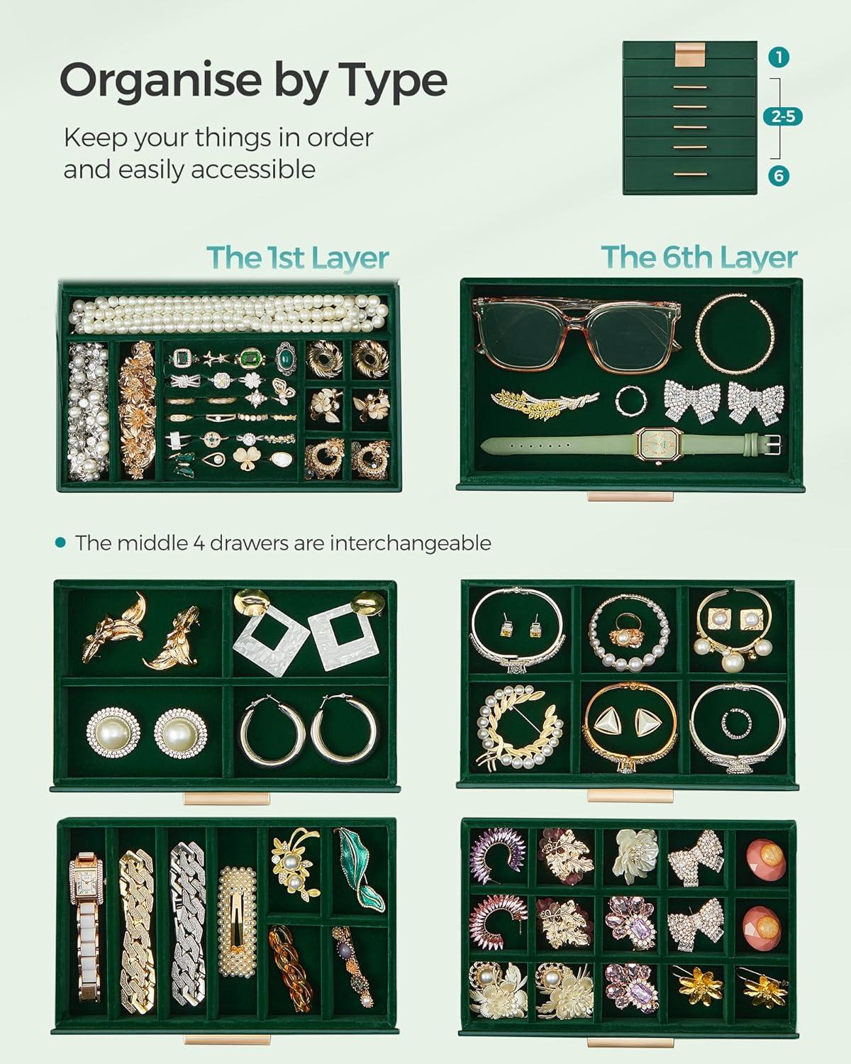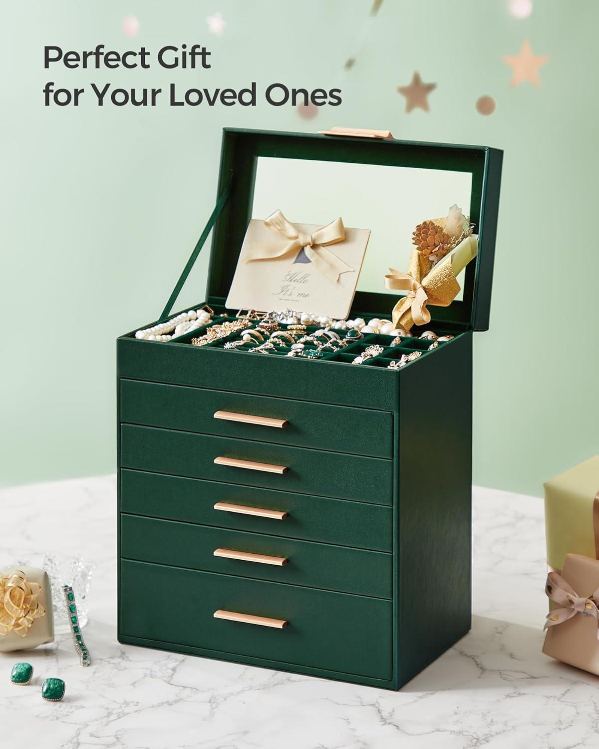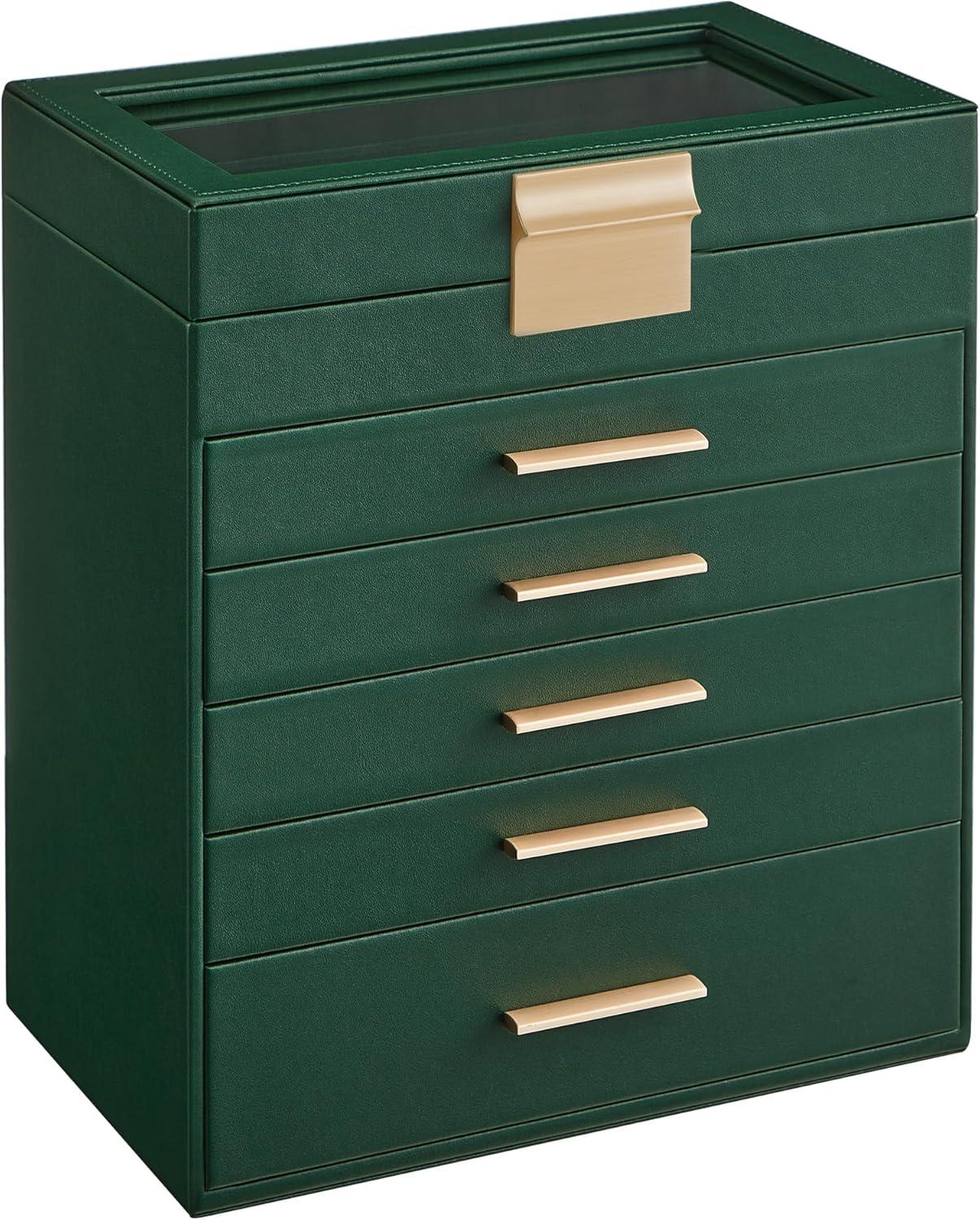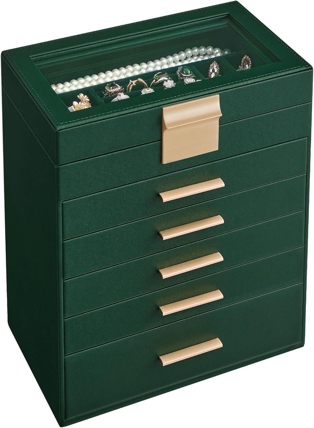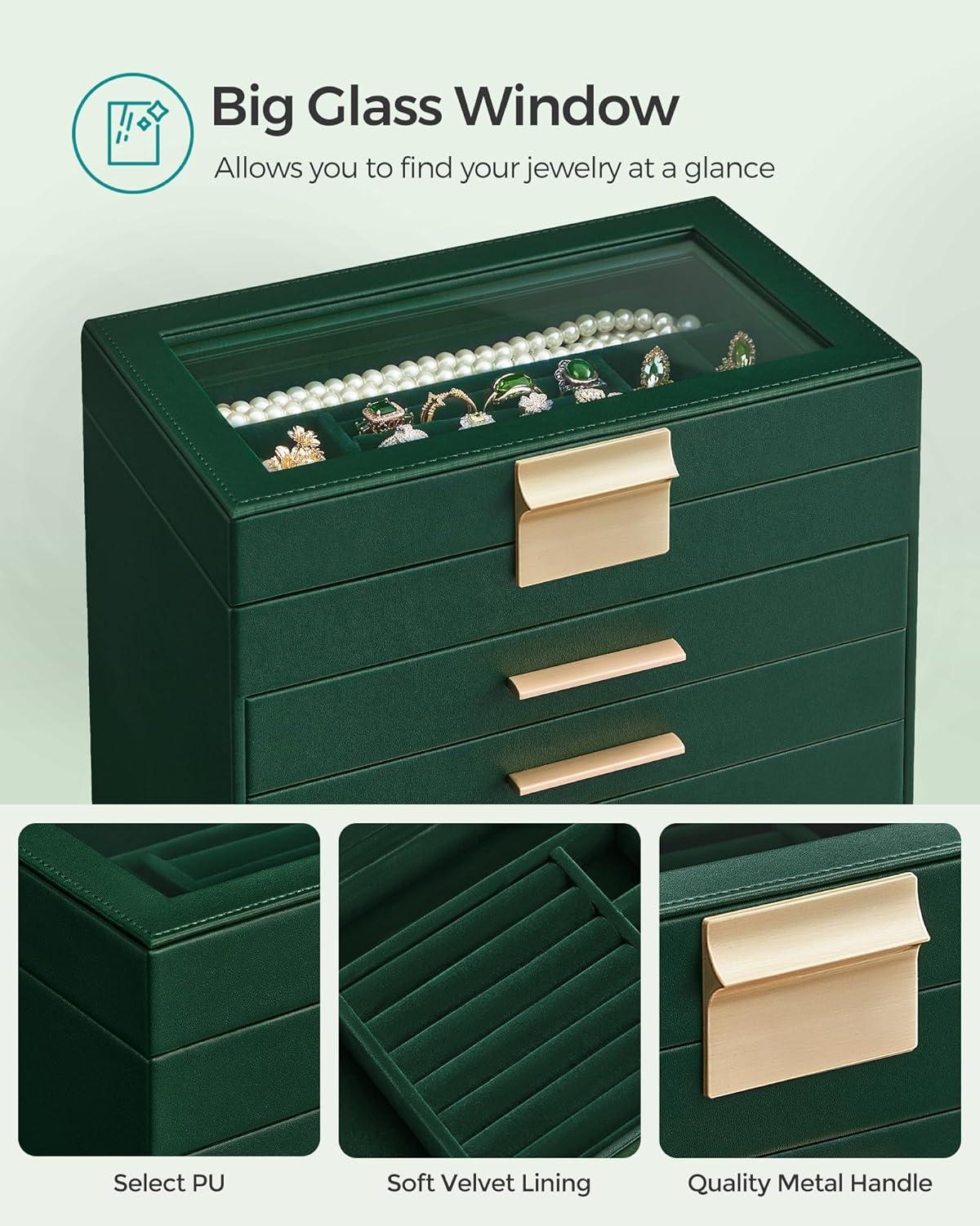 SONGMICS Jewelry Box Organizer with Glass Lid, 3-Layer Jewelry Storage, with 2 Drawers, Modern Style, 8 x 9.1 x 5.3 Inches, Cloud White and Gold Color UJBC239WT(Forest Green + Gold)