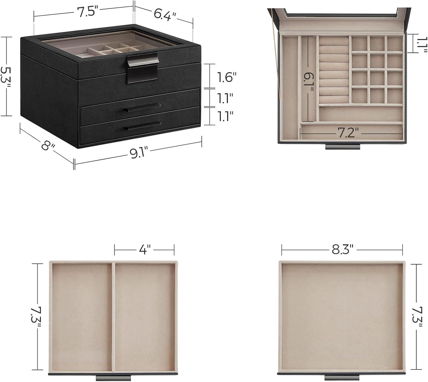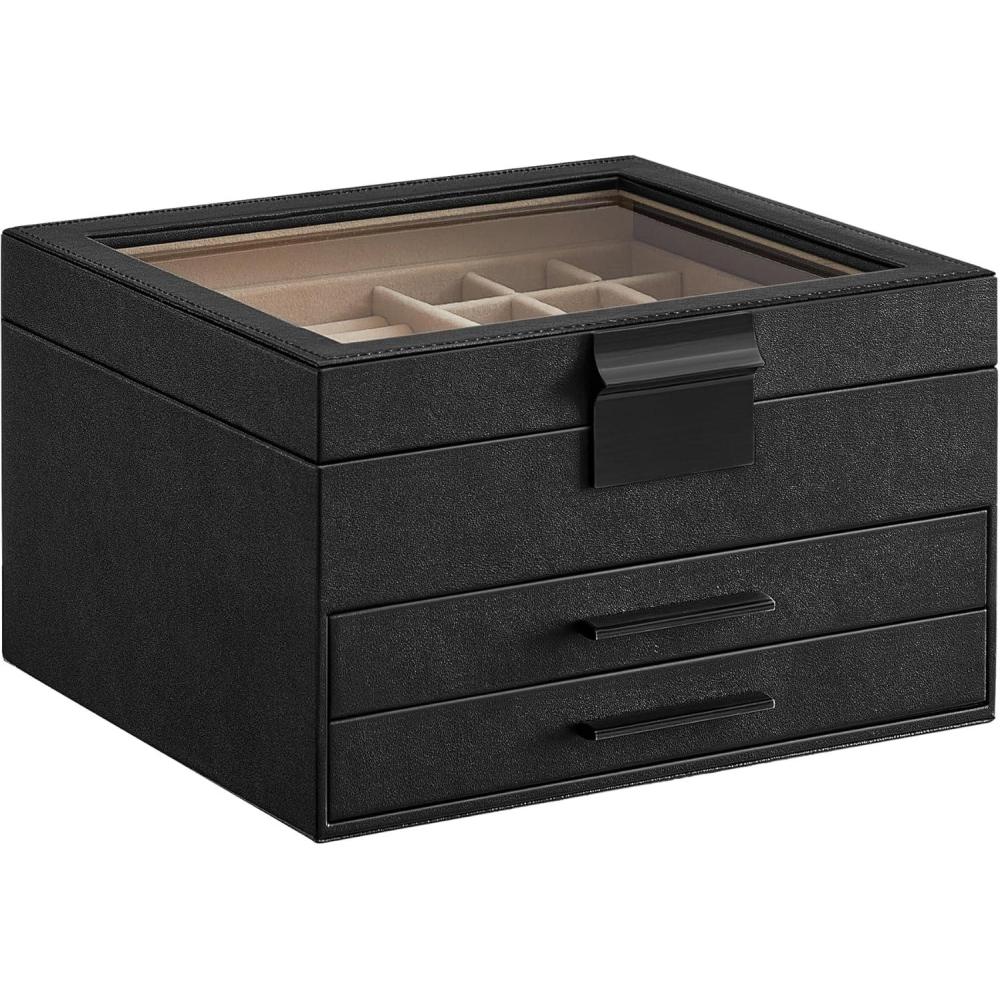 SONGMICS Jewelry Box Organizer with Glass Lid, 3-Layer Jewelry Storage, with 2 Drawers, Modern Style, 8 x 9.1 x 5.3 Inches, Cloud White and Gold Color UJBC239WT(Graphite Black + Silver)