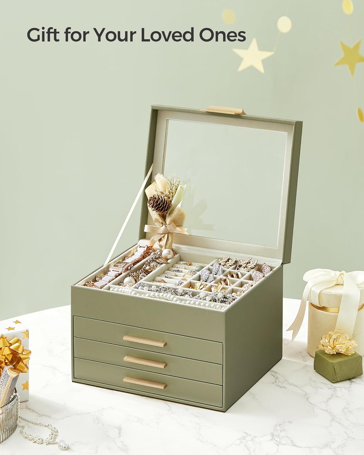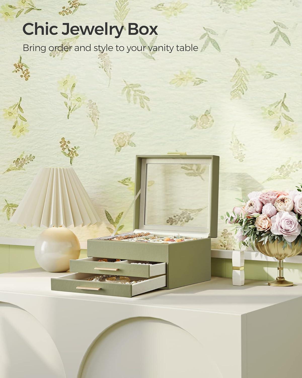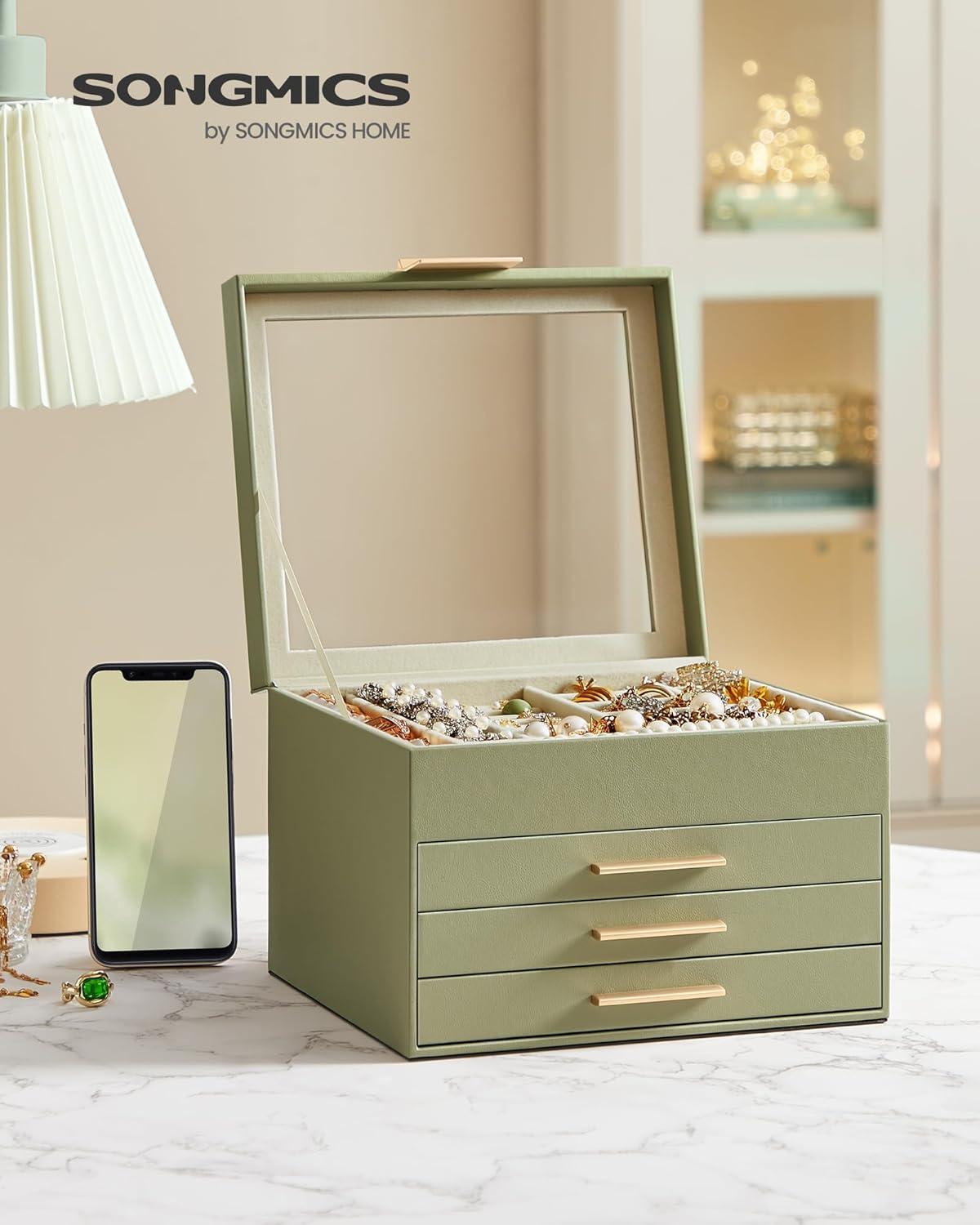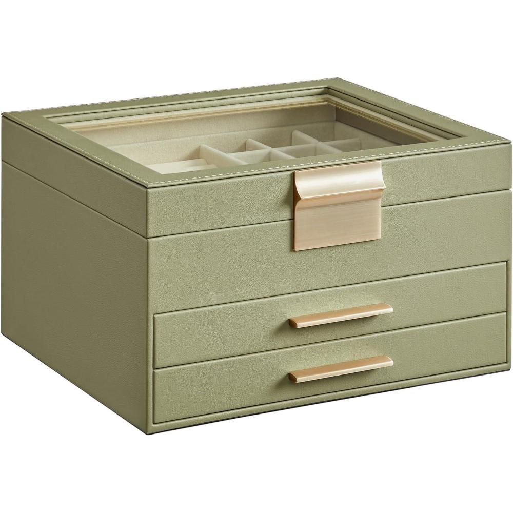 SONGMICS Jewelry Box Organizer with Glass Lid, 3-Layer Jewelry Storage, with 2 Drawers, Modern Style, 8 x 9.1 x 5.3 Inches, Cloud White and Gold Color UJBC239WT(Laurel Green + Gold)