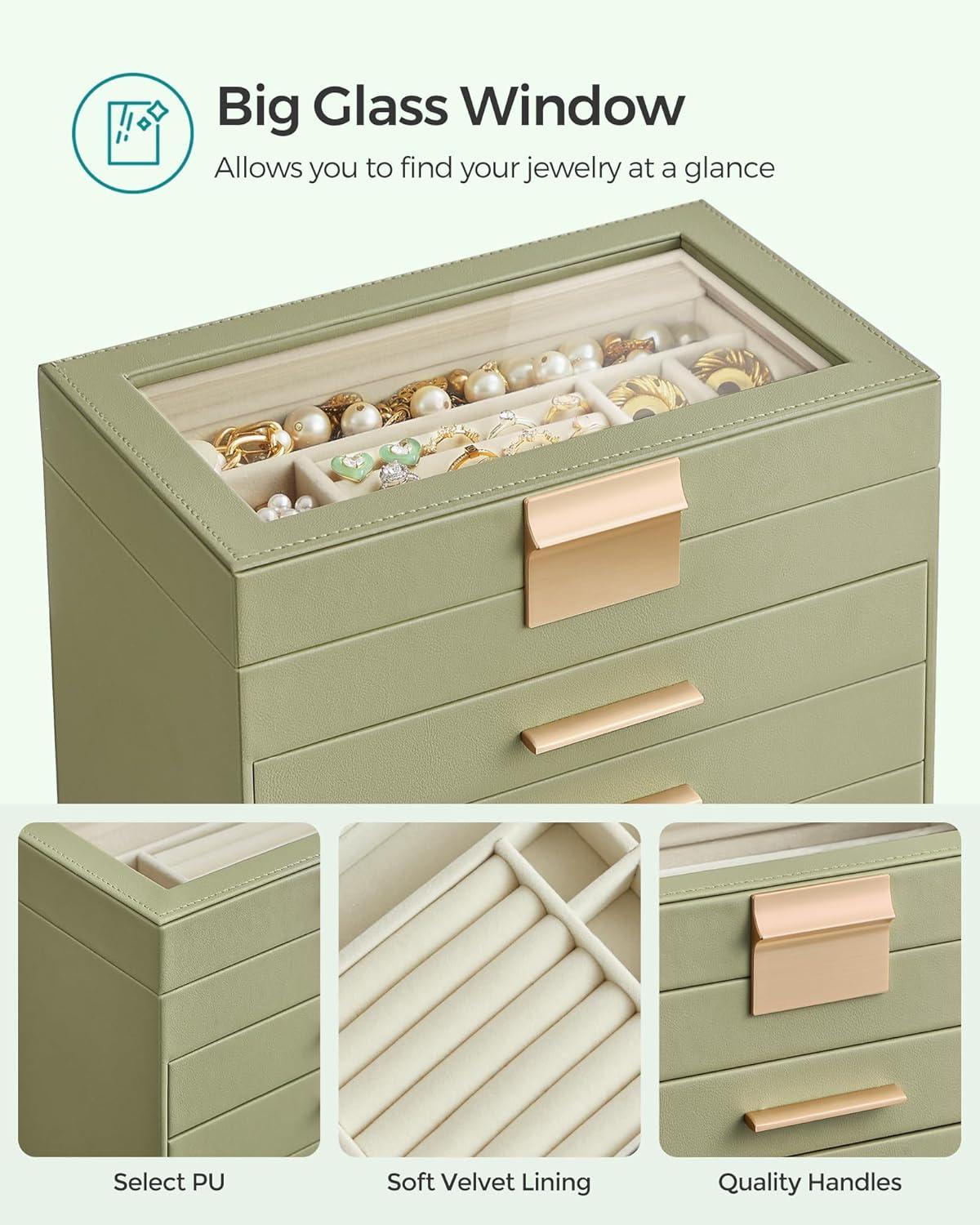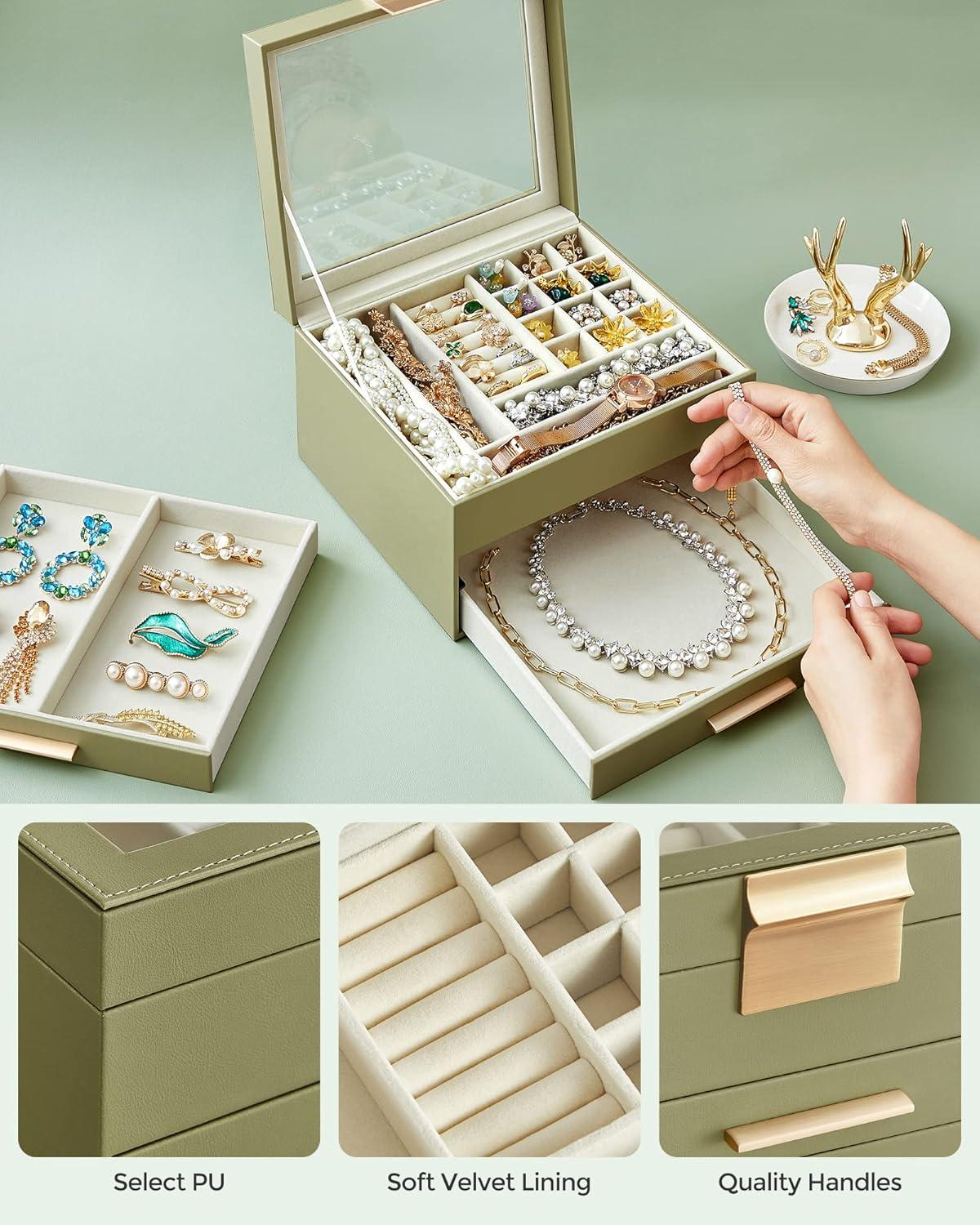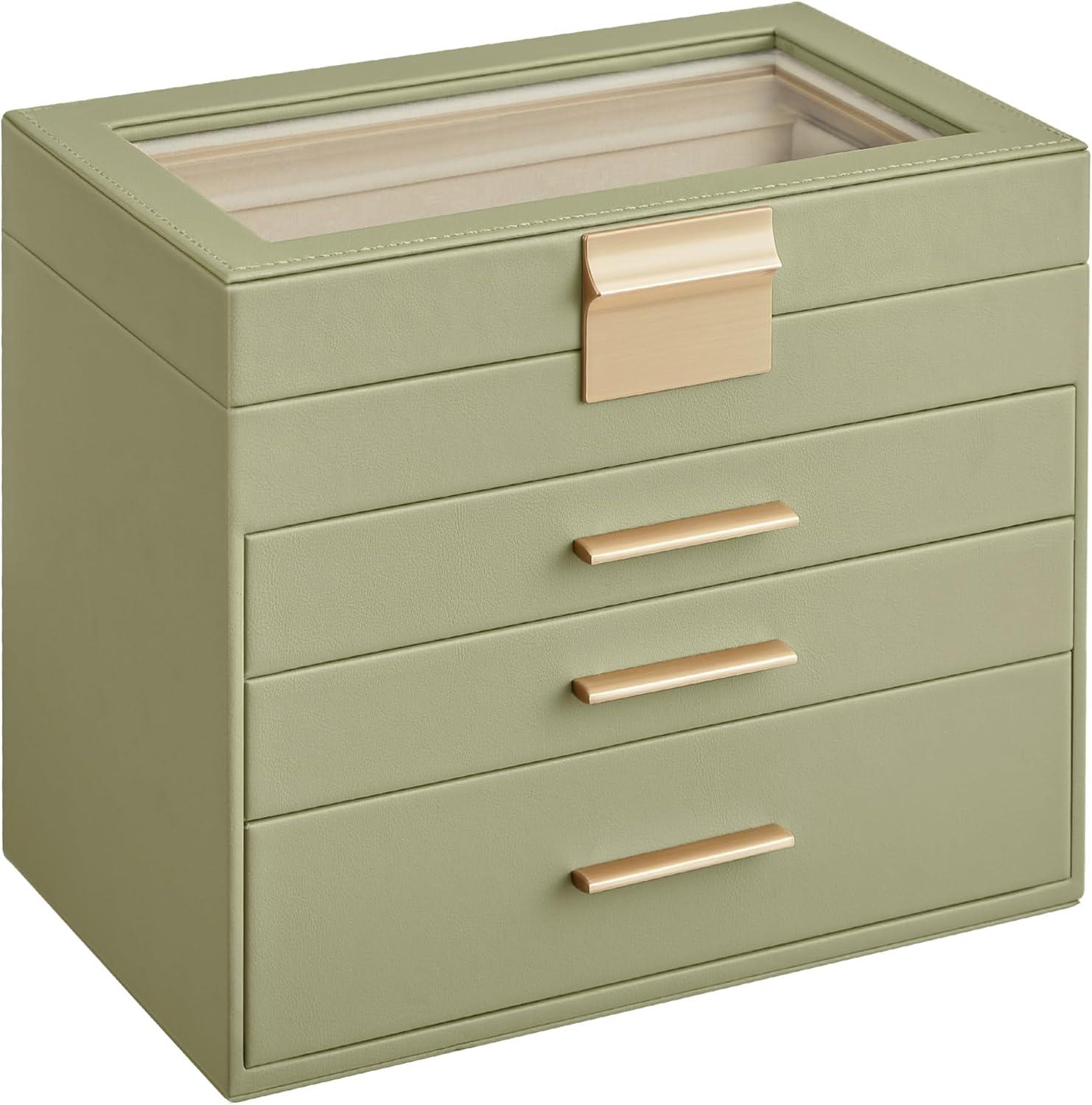 SONGMICS Jewelry Box Organizer with Glass Lid, 3-Layer Jewelry Storage, with 2 Drawers, Modern Style, 8 x 9.1 x 5.3 Inches, Cloud White and Gold Color UJBC239WT(Laurel Green + Gold)
