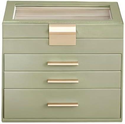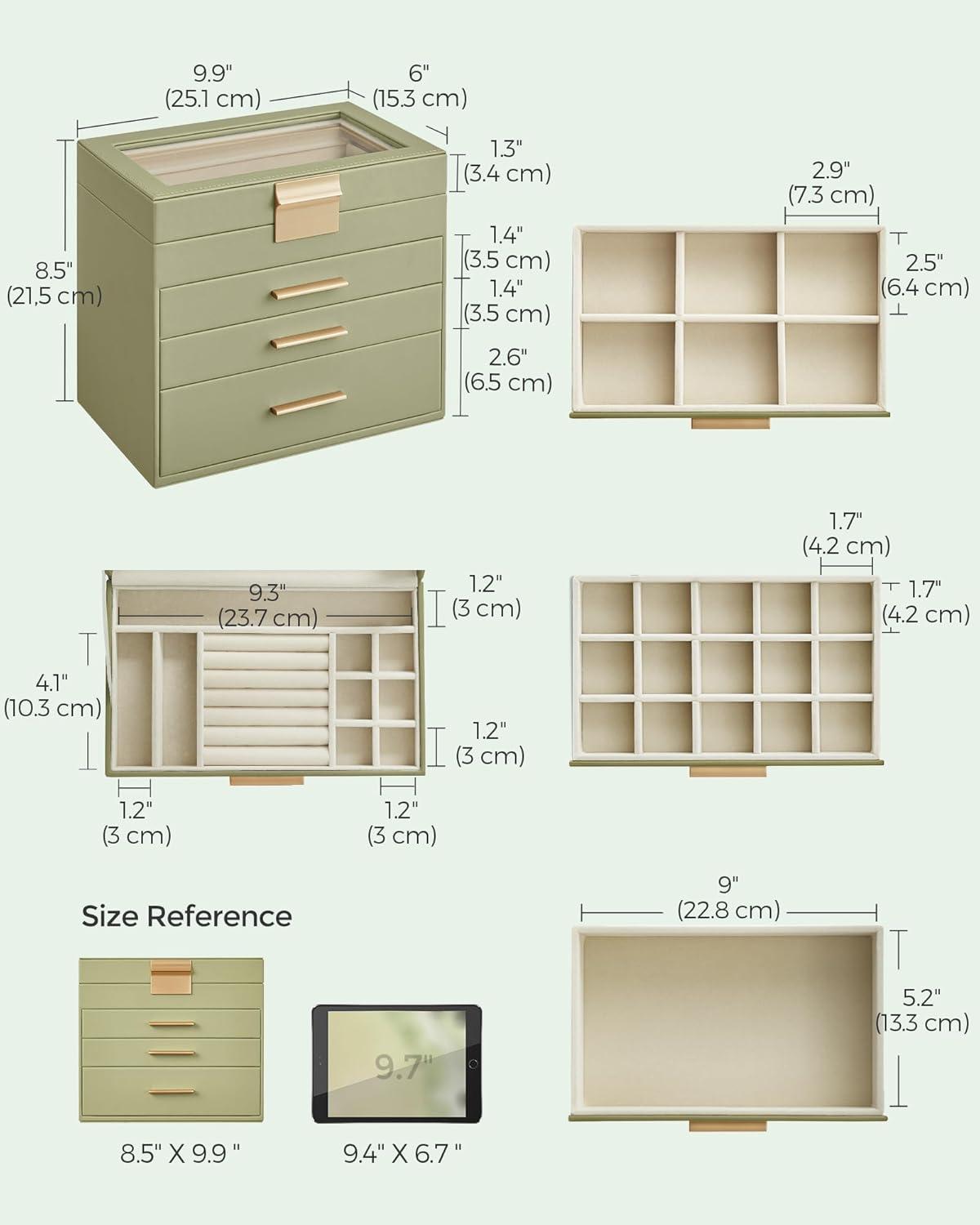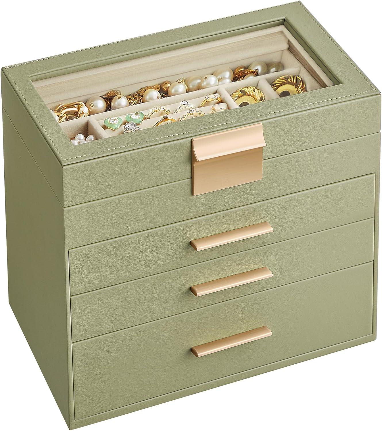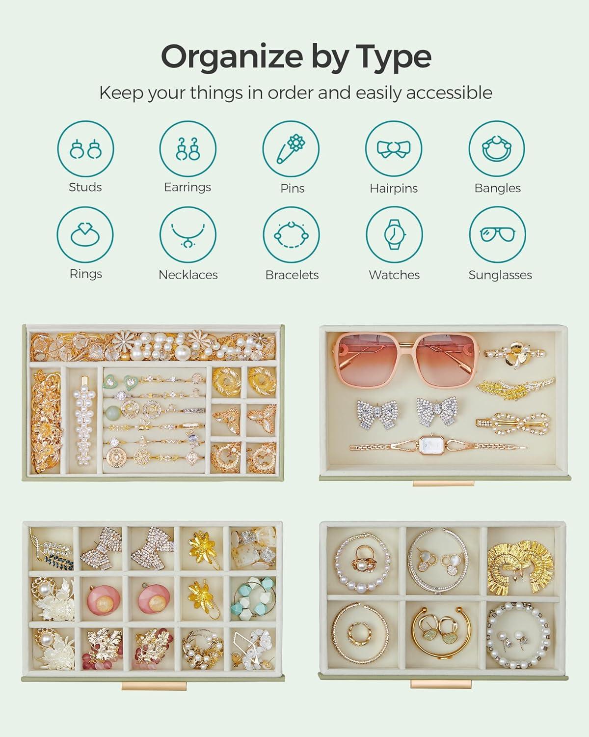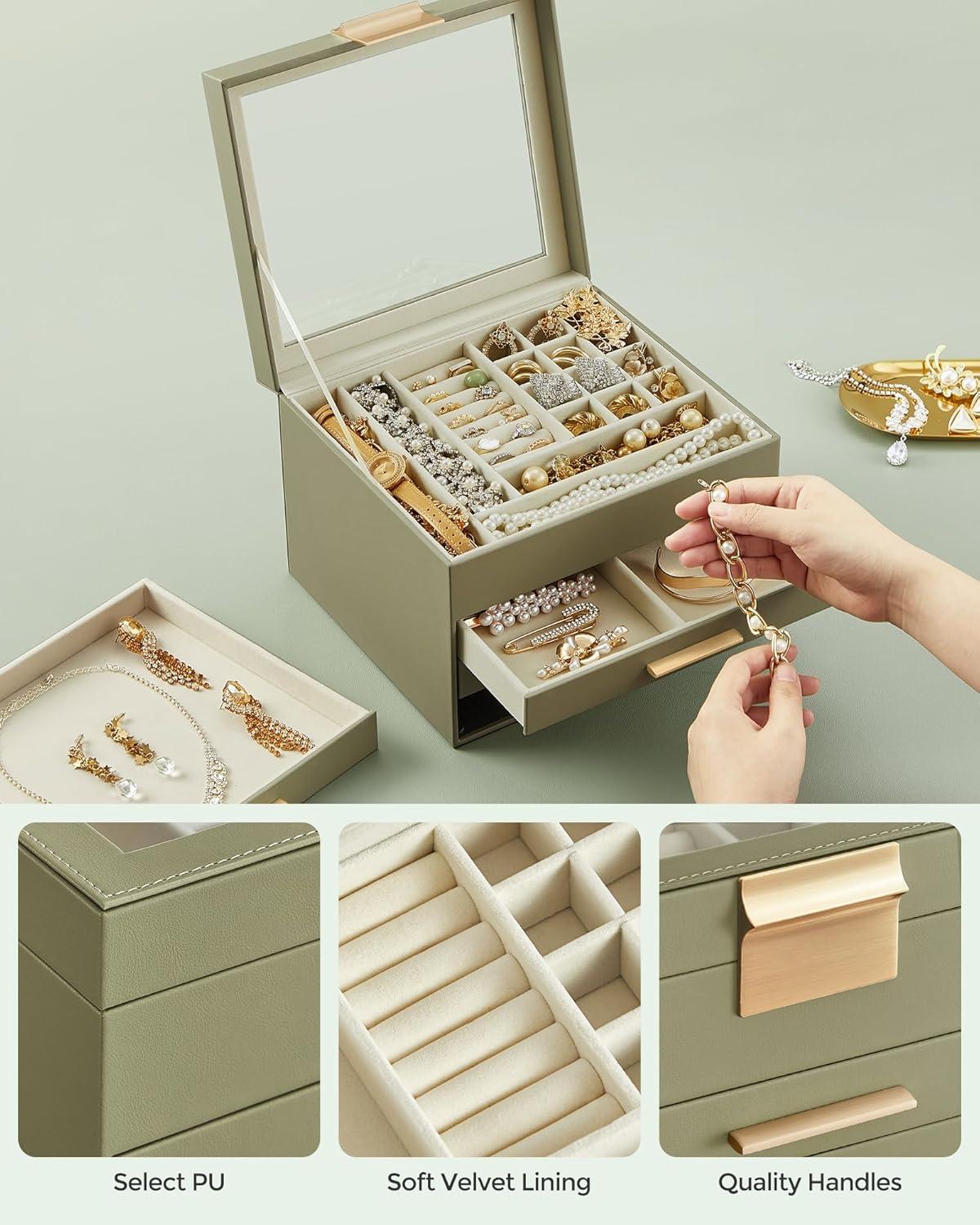 SONGMICS Jewelry Box Organizer with Glass Lid, 3-Layer Jewelry Storage, with 2 Drawers, Modern Style, 8 x 9.1 x 5.3 Inches, Cloud White and Gold Color UJBC239WT(Laurel Green + Gold)
