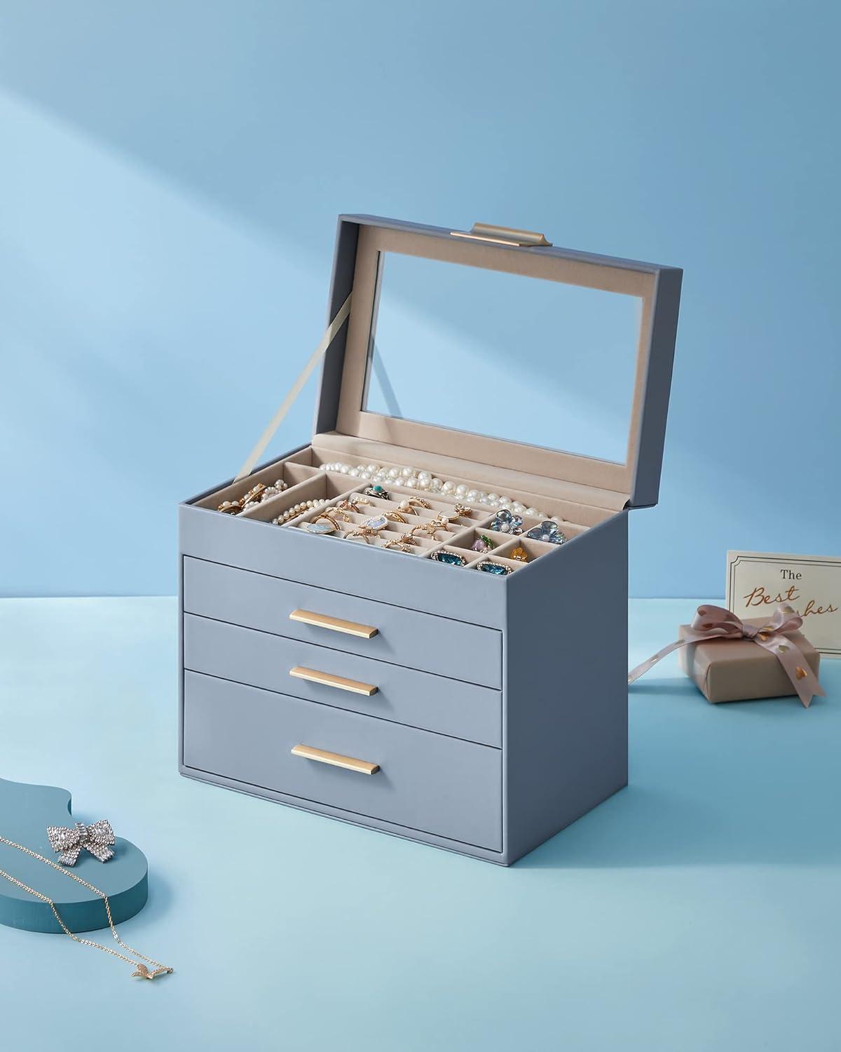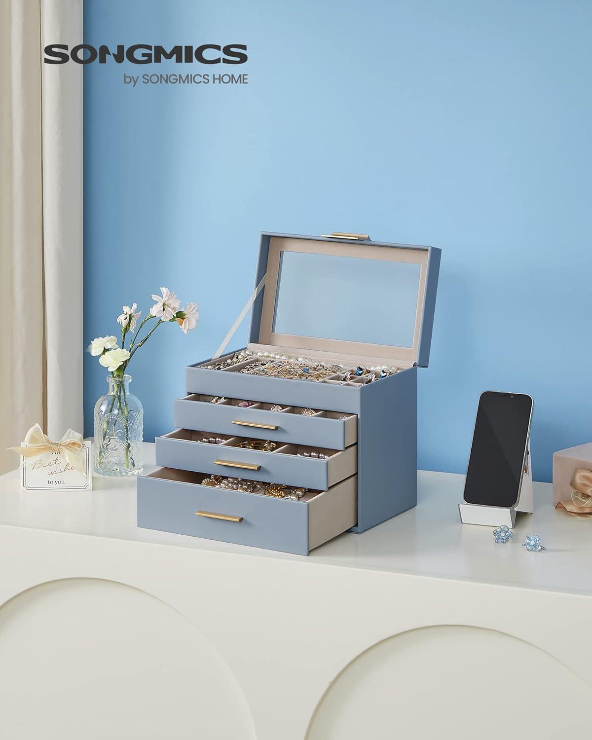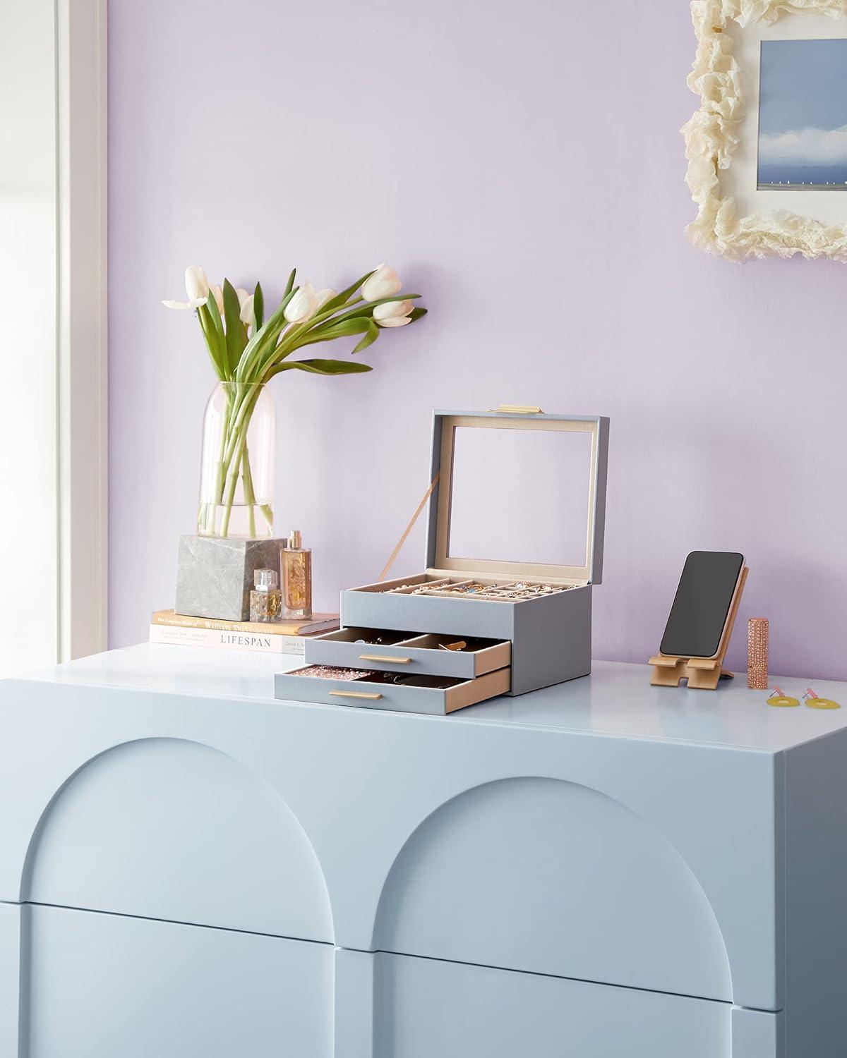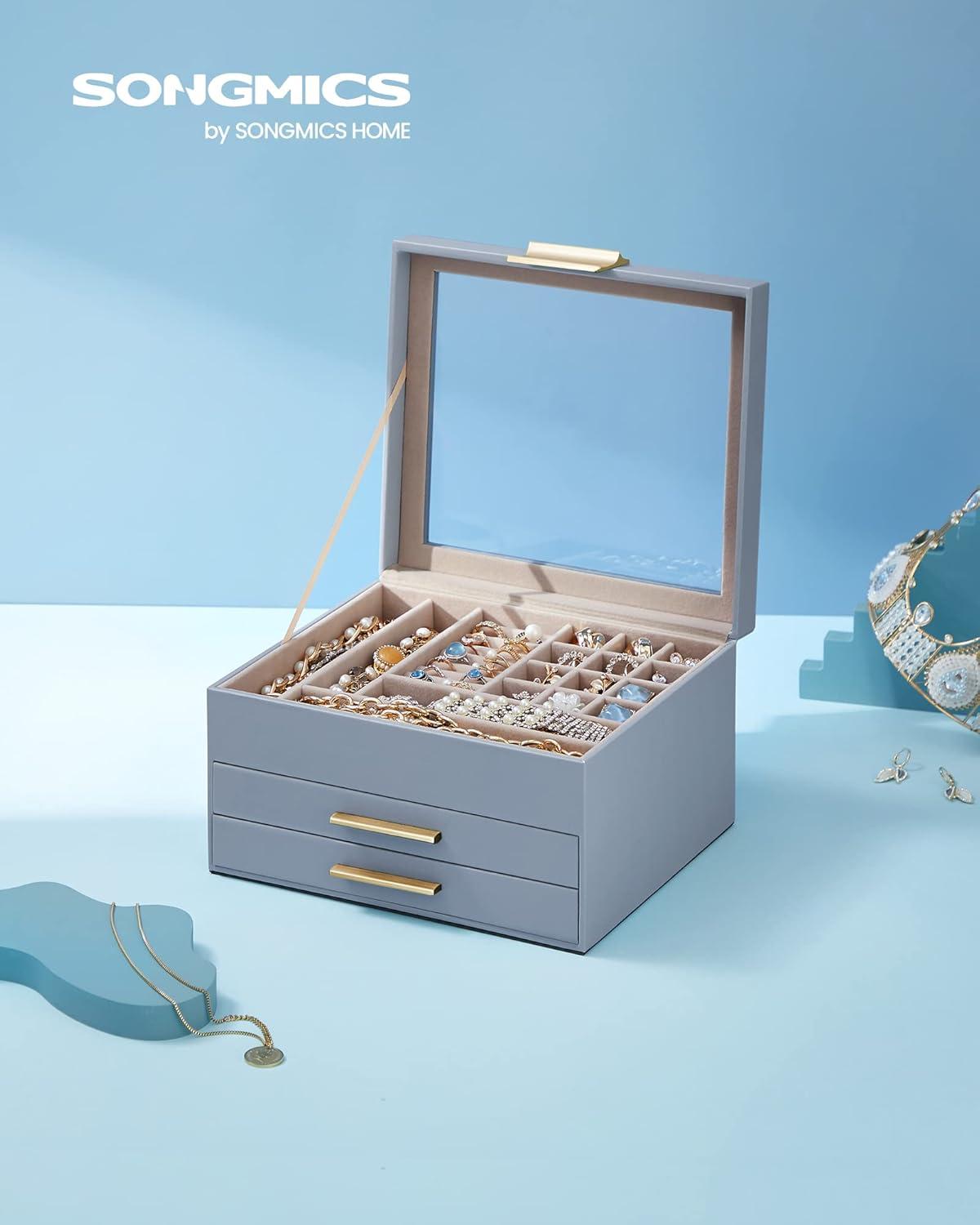 SONGMICS Jewelry Box Organizer with Glass Lid, 3-Layer Jewelry Storage, with 2 Drawers, Modern Style, 8 x 9.1 x 5.3 Inches, Cloud White and Gold Color UJBC239WT(Smoky Blue + Gold)