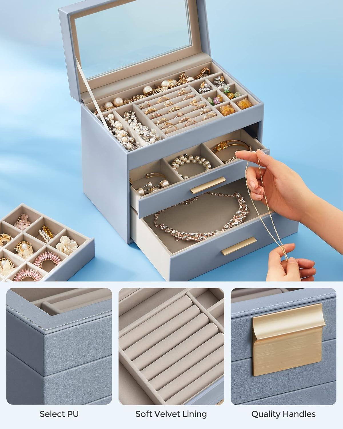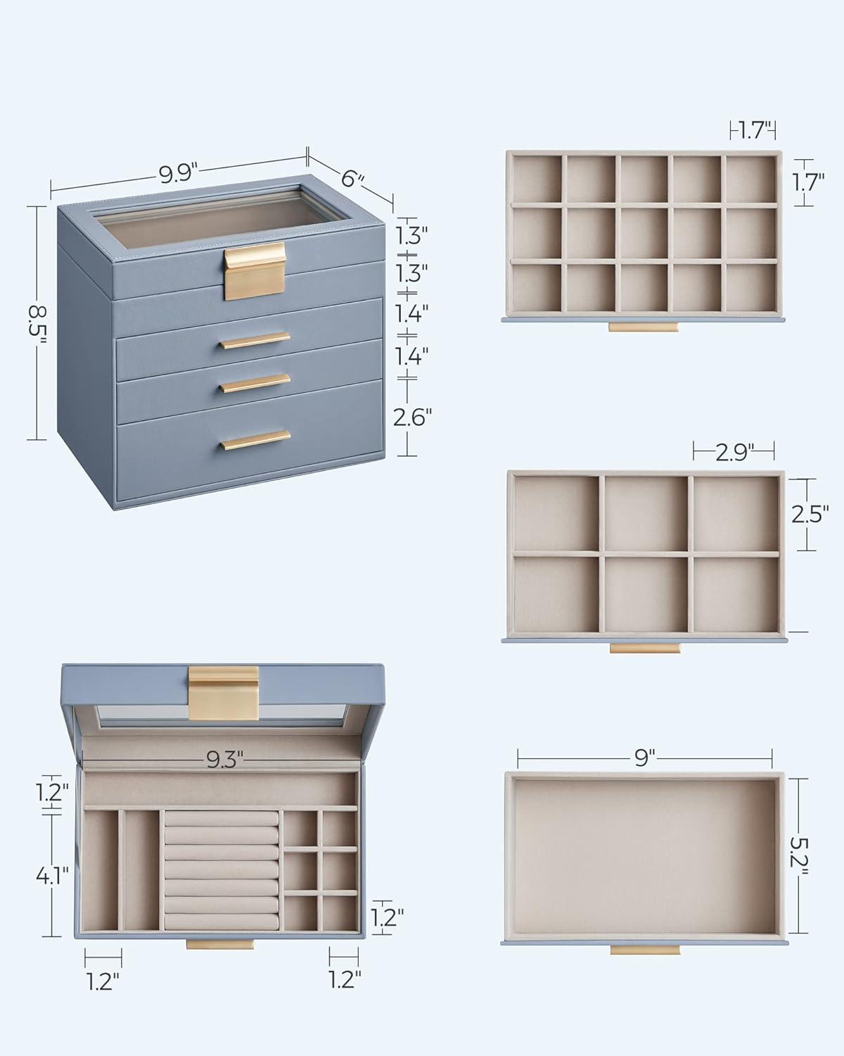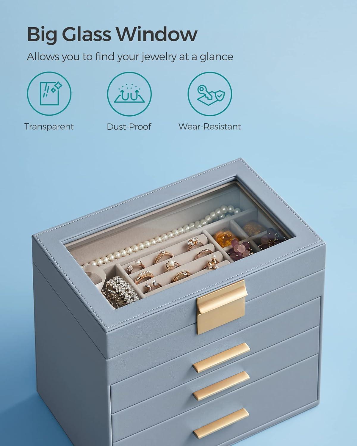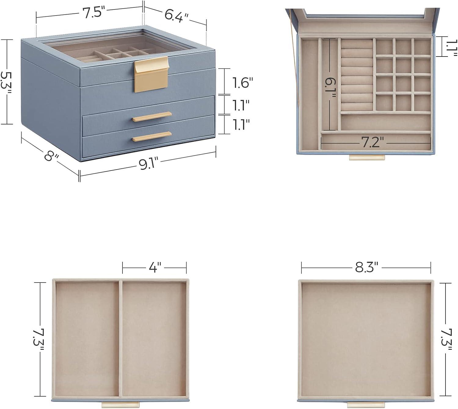 SONGMICS Jewelry Box Organizer with Glass Lid, 3-Layer Jewelry Storage, with 2 Drawers, Modern Style, 8 x 9.1 x 5.3 Inches, Cloud White and Gold Color UJBC239WT(Smoky Blue + Gold)
