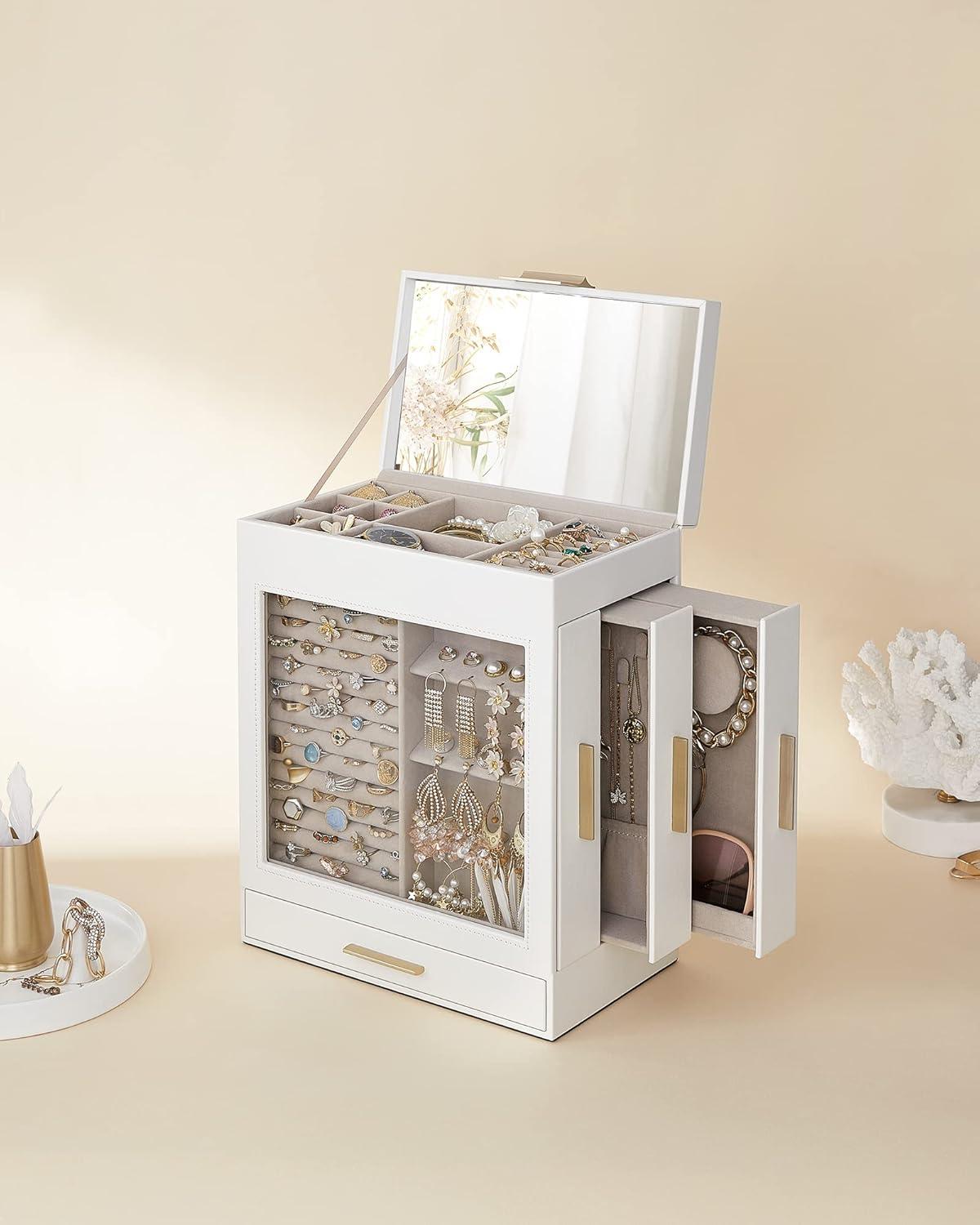 SONGMICS Jewelry Box with Glass Window, 5-Layer Jewelry Organizer with 3 Side Drawers, Jewelry Storage, with Big Mirror, Modern, 6.1 x 10.3 x 12.6 Inches, Smoky Blue and Metallic Gold UJBC162Q01(Cloud White + Metallic Gold)