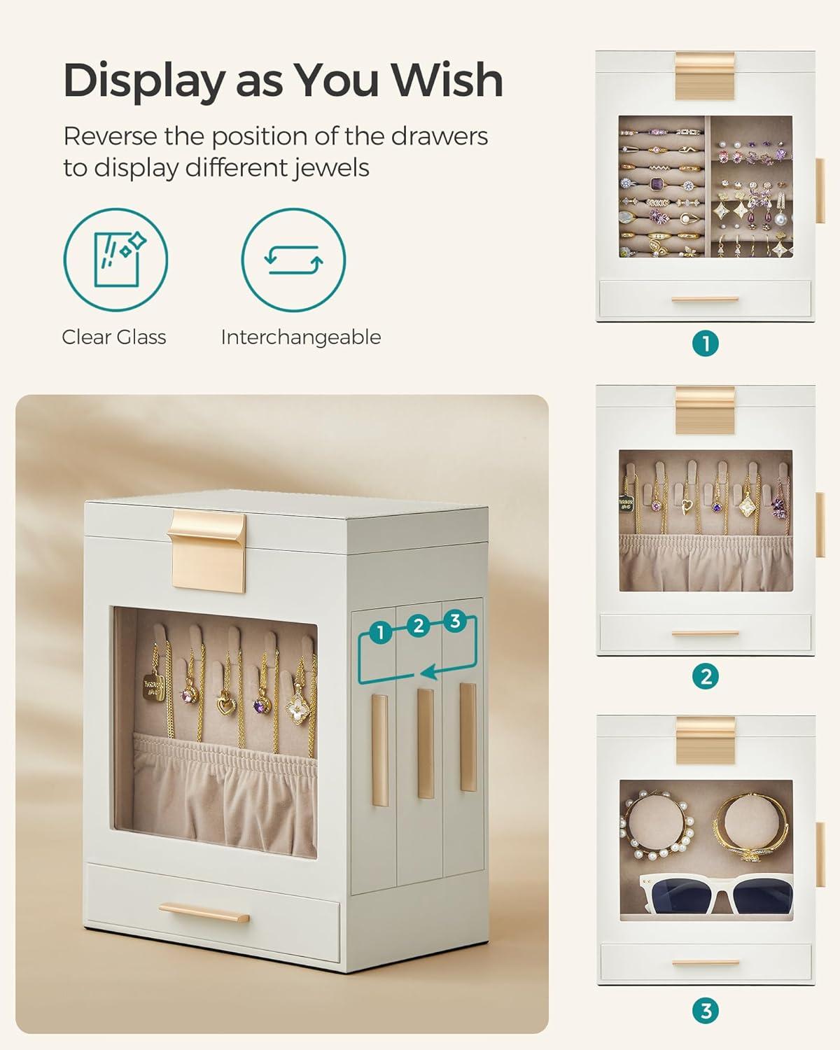 [Interchangeable Side Drawers] The position of the 3 side drawers can be changed to allow you to have different jewels on display as you wish. And your valuables are kept dust-free behind the clear glass window of this jewelry box!
