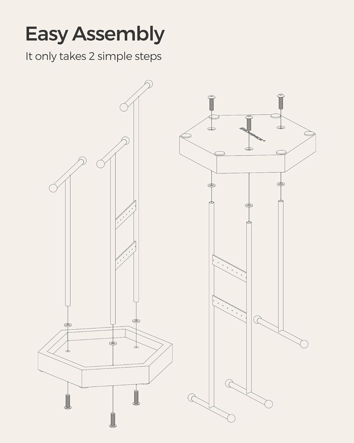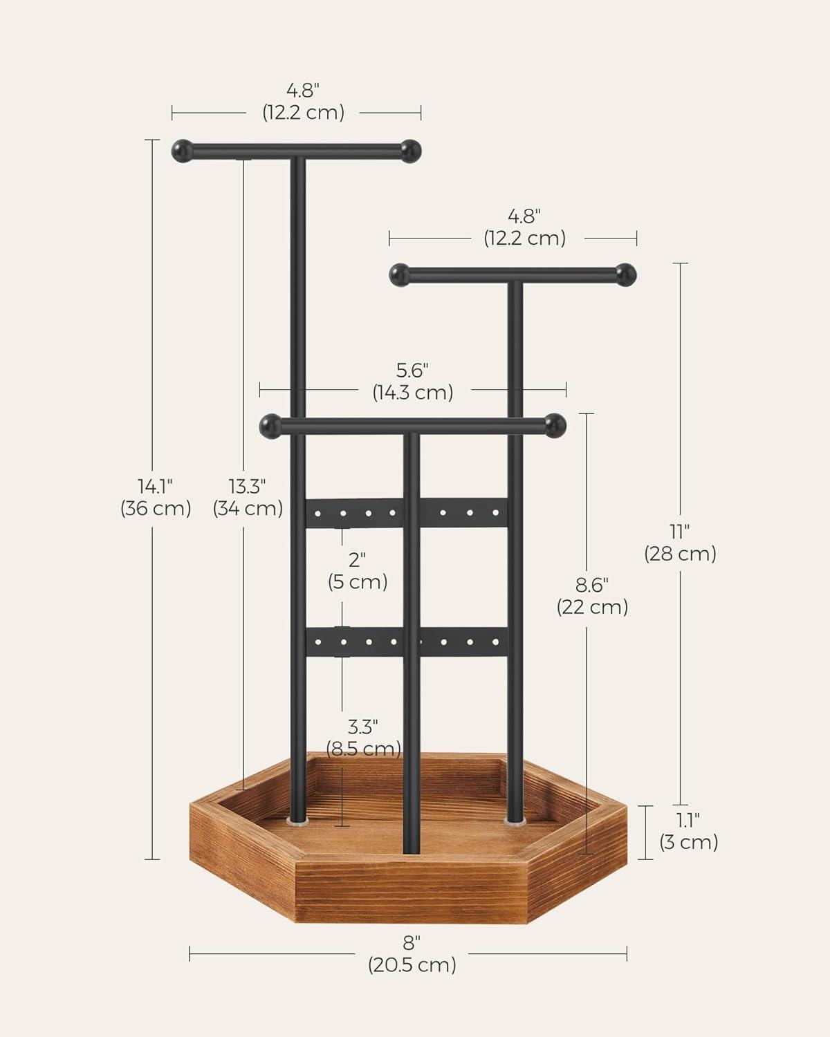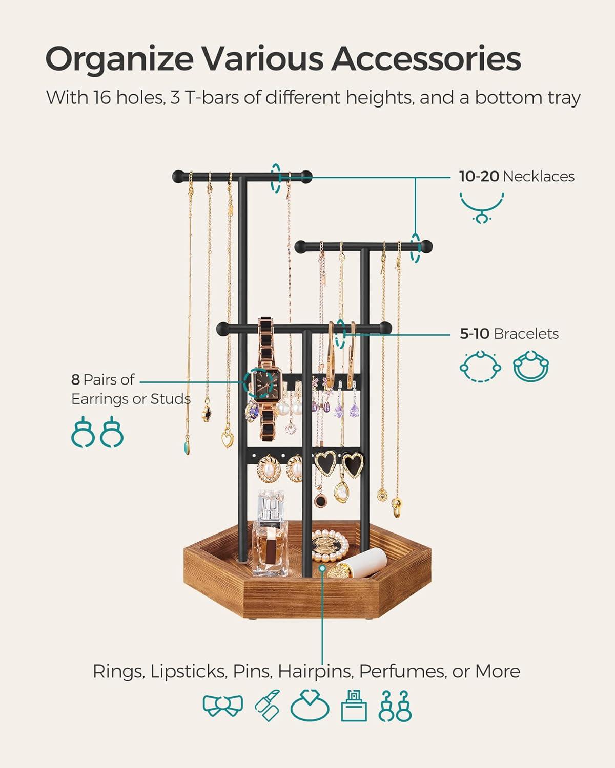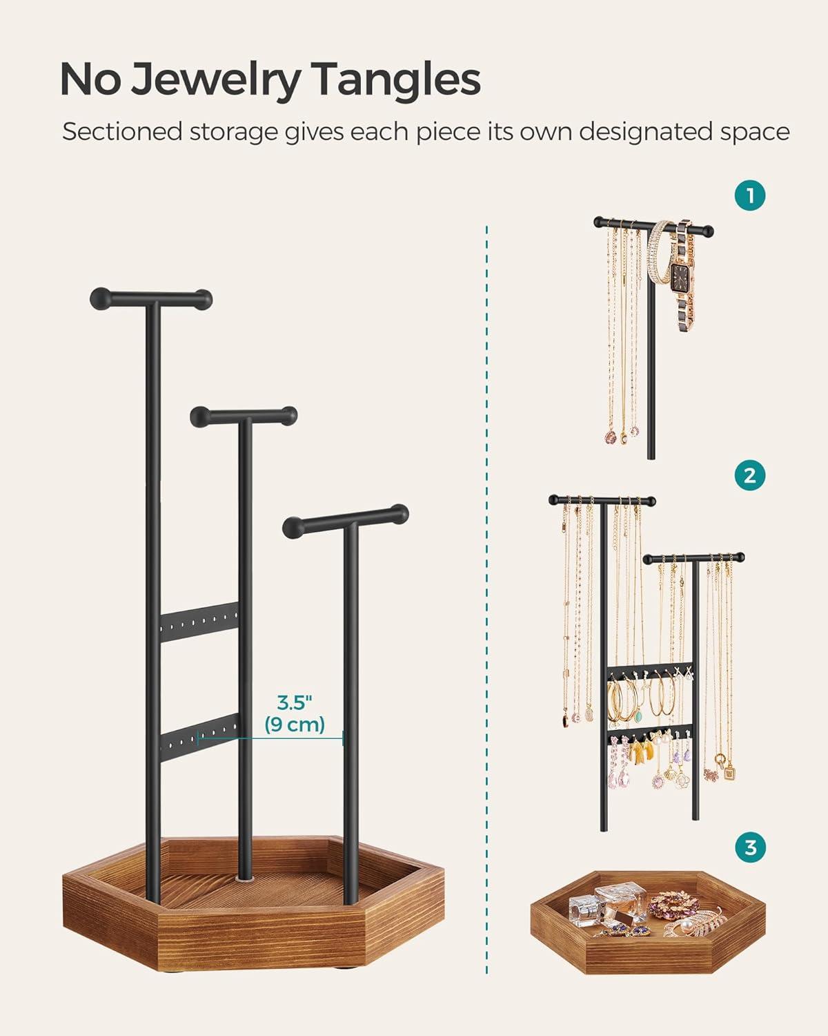 [Sturdy, Durable, and Stable] The jewelry stand is a stable and safe haven for your treasured jewelry, thanks to a hexagonal base and 3 metal T-bars arranged in a triangular distribution and securely screwed to the base