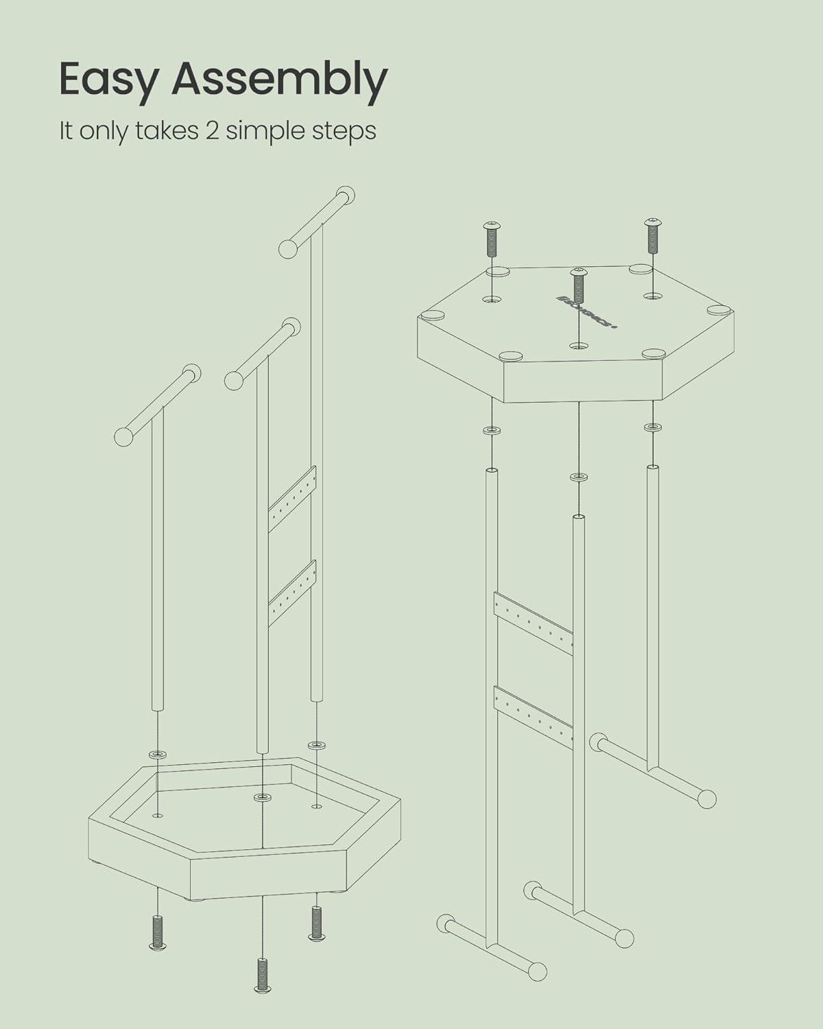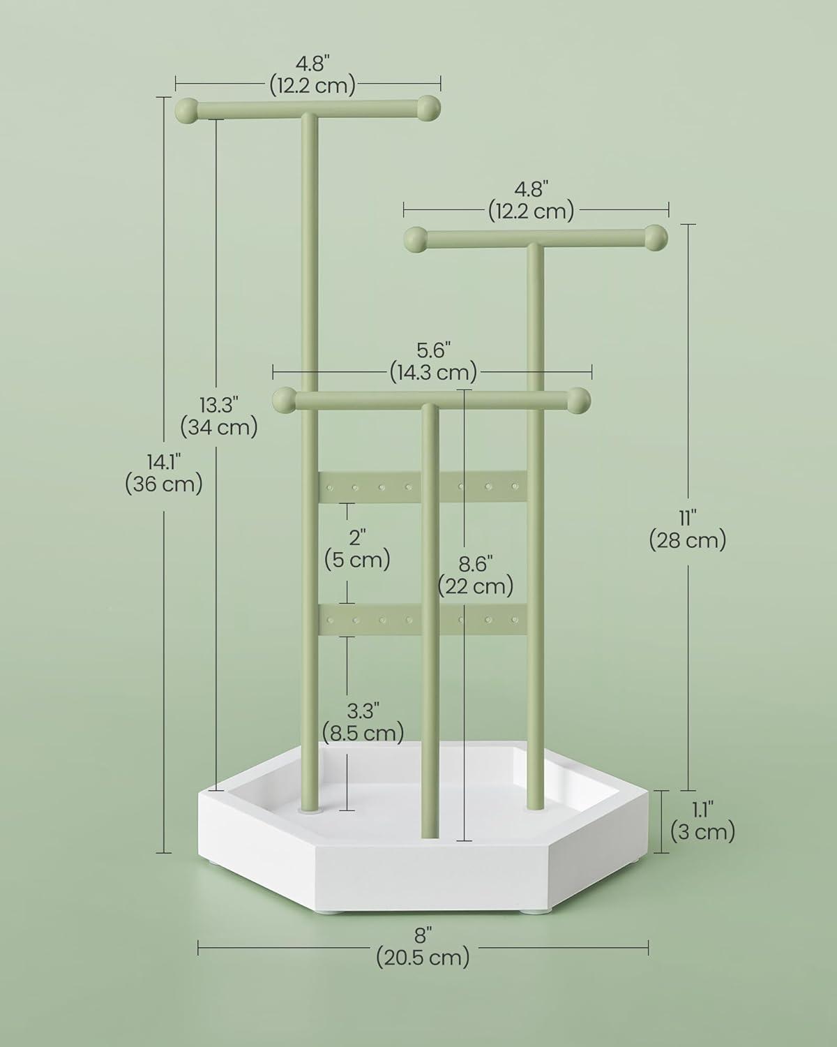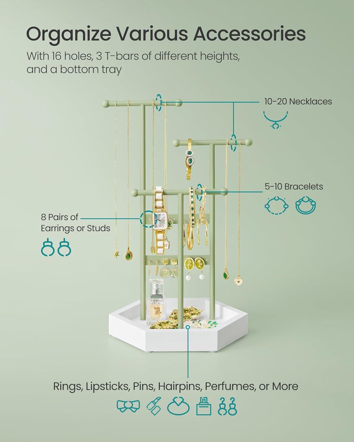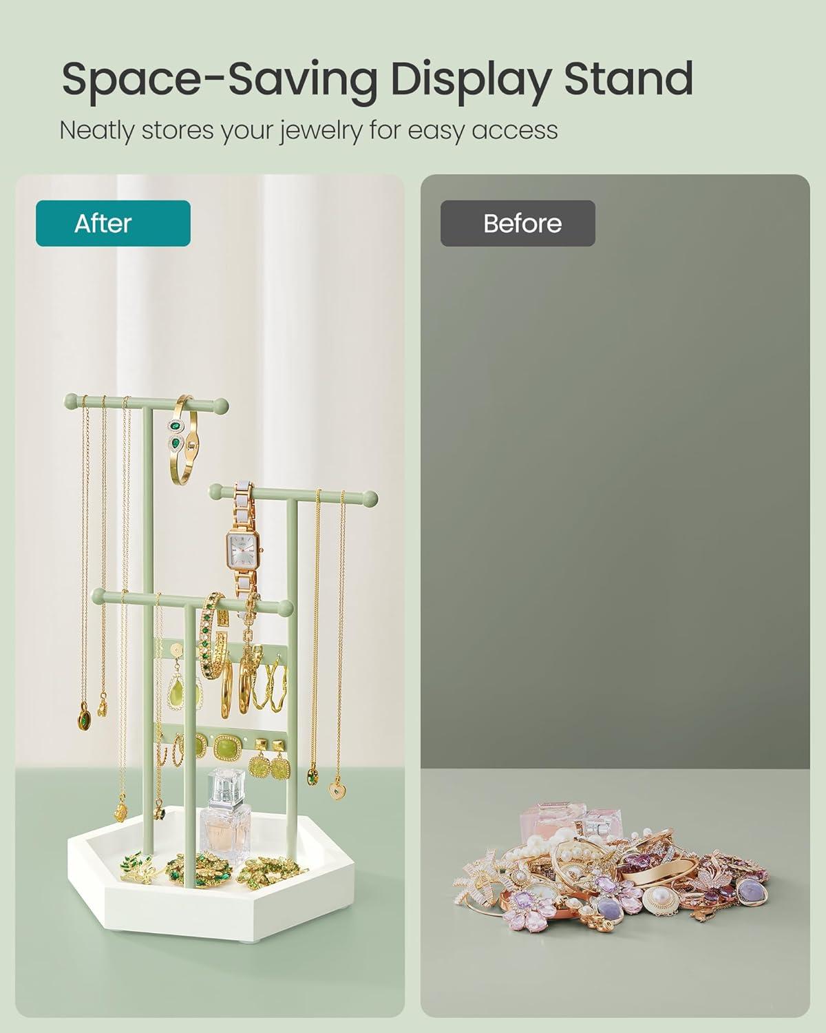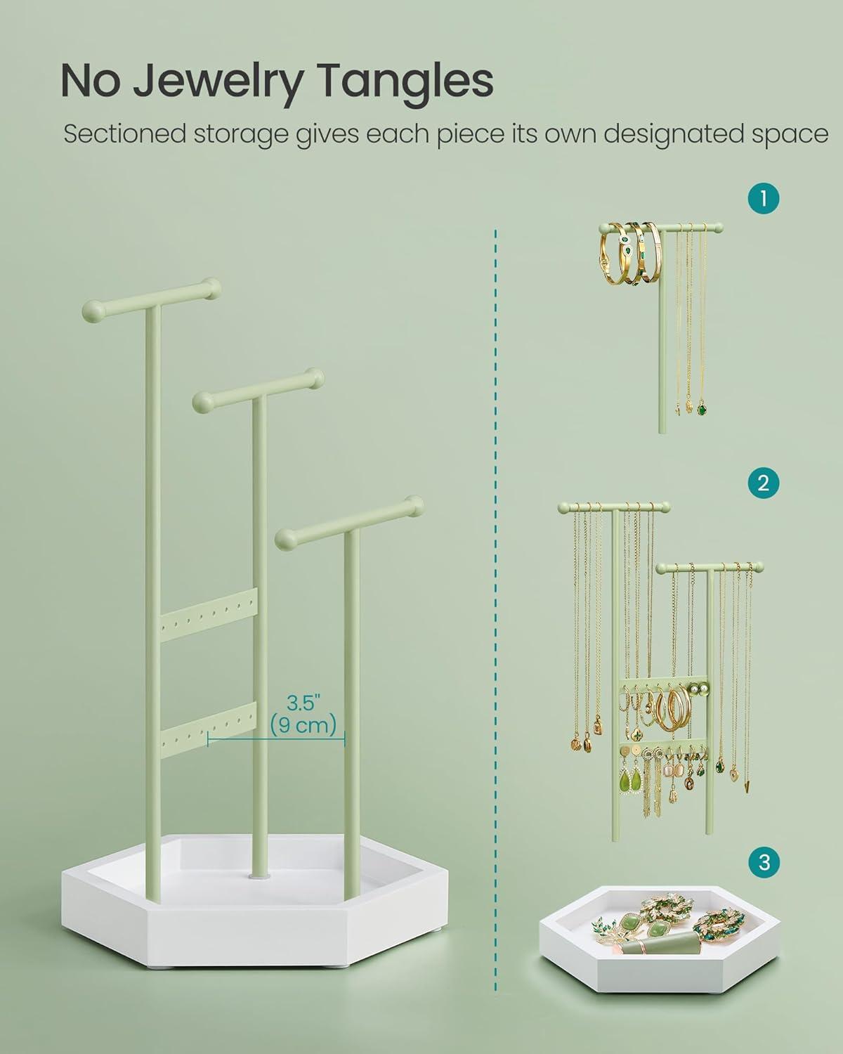 [Sturdy, Durable, and Stable] The jewelry stand is a stable and safe haven for your treasured jewelry, thanks to a hexagonal base and 3 metal T-bars arranged in a triangular distribution and securely screwed to the base