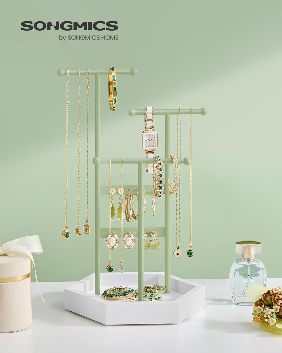 imageSONGMICS Jewelry Holder Jewelry Organizer 3 Tiers and 1 Tray Jewelry Display Stand with Metal Frame Necklace Earring Bracelet Holder for Rings Ink Black and Caramel Brown UJJS03CBLaurel Green  Cloud White