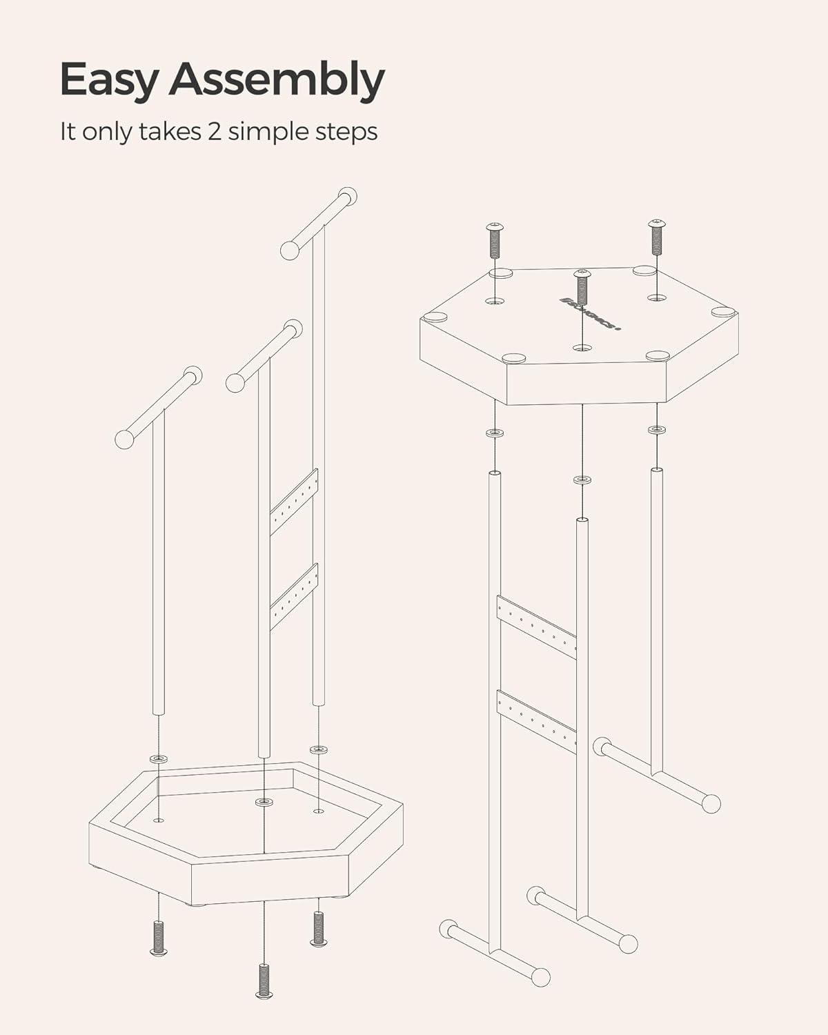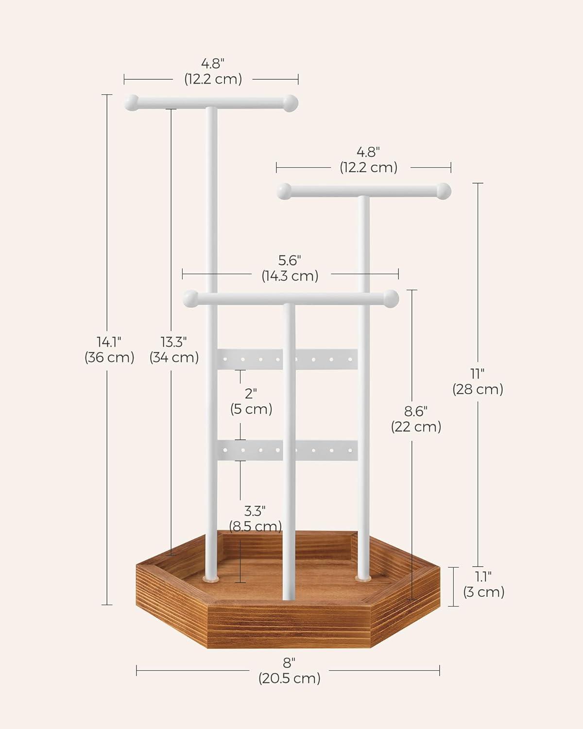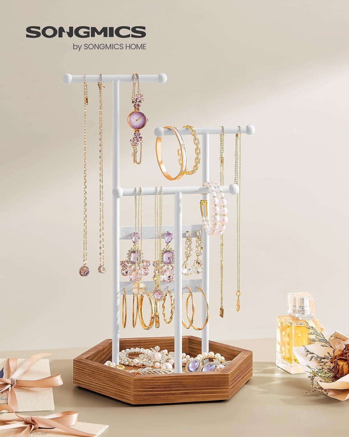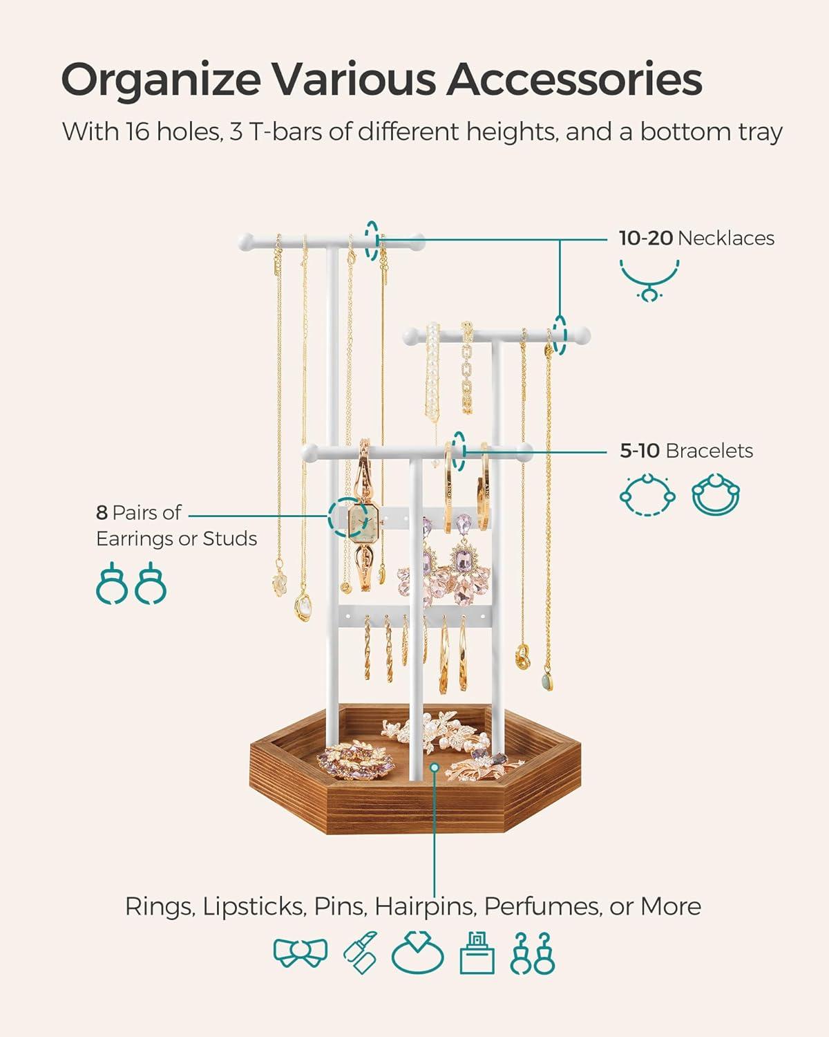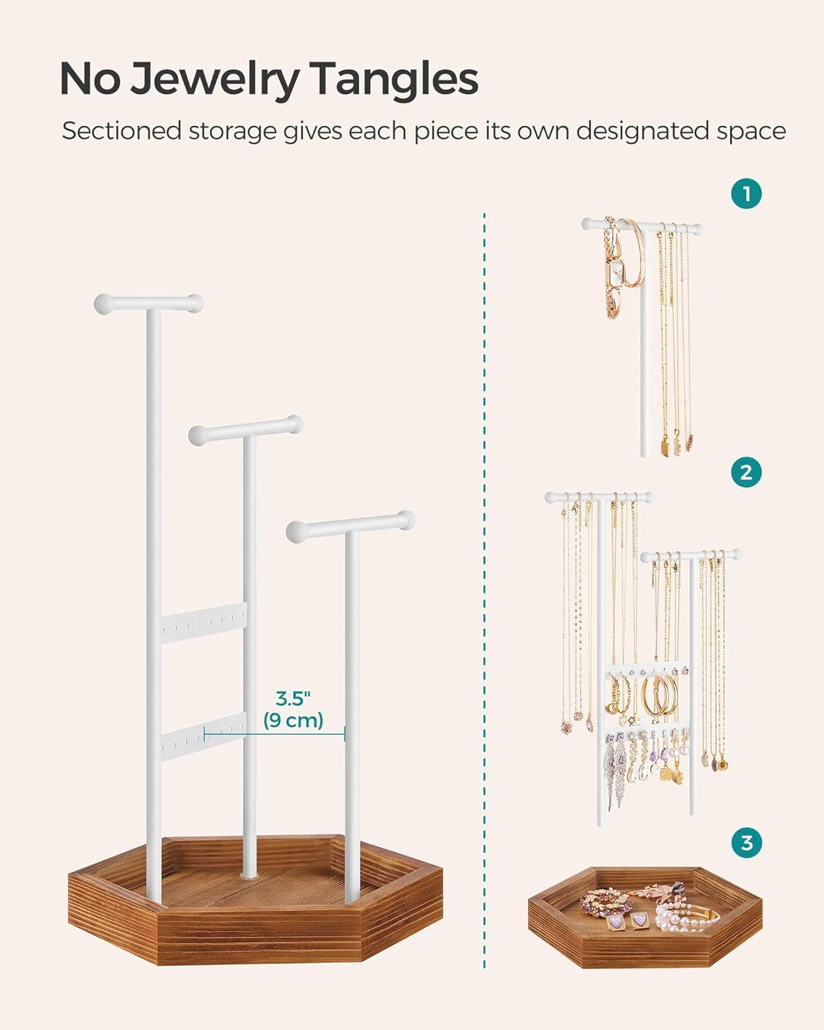 [Sturdy, Durable, and Stable] The jewelry stand is a stable and safe haven for your treasured jewelry, thanks to a hexagonal base and 3 metal T-bars arranged in a triangular distribution and securely screwed to the base