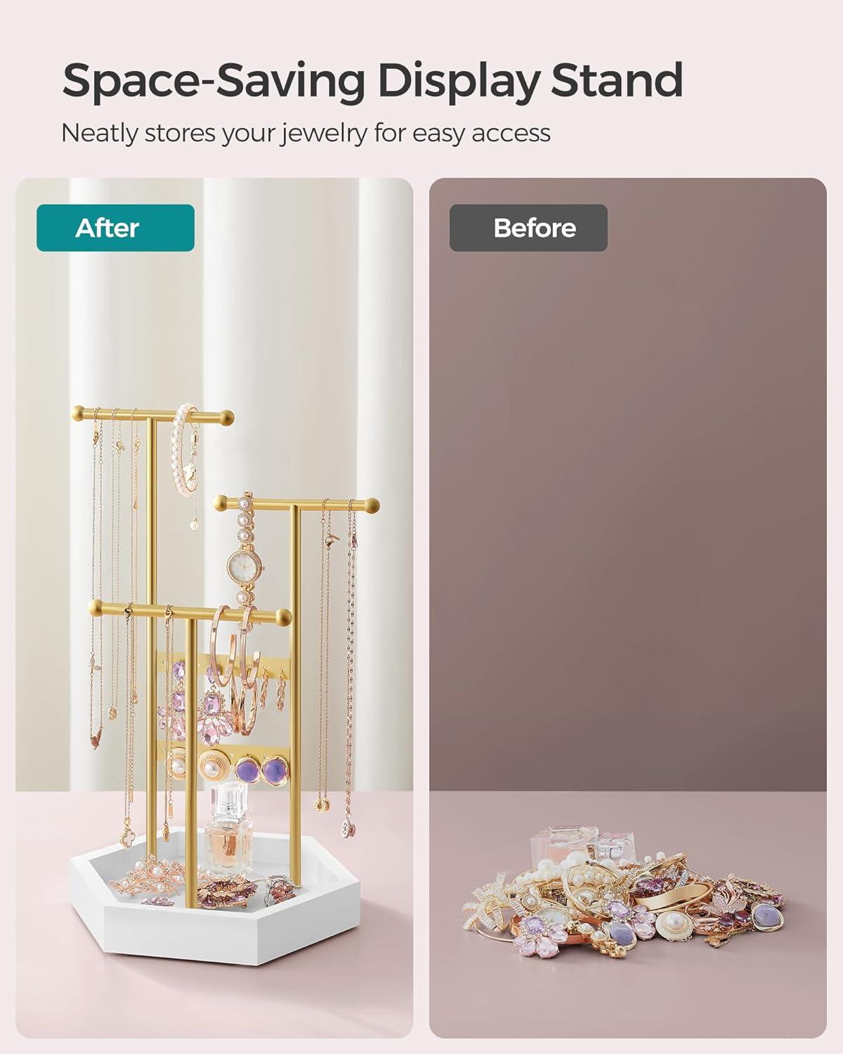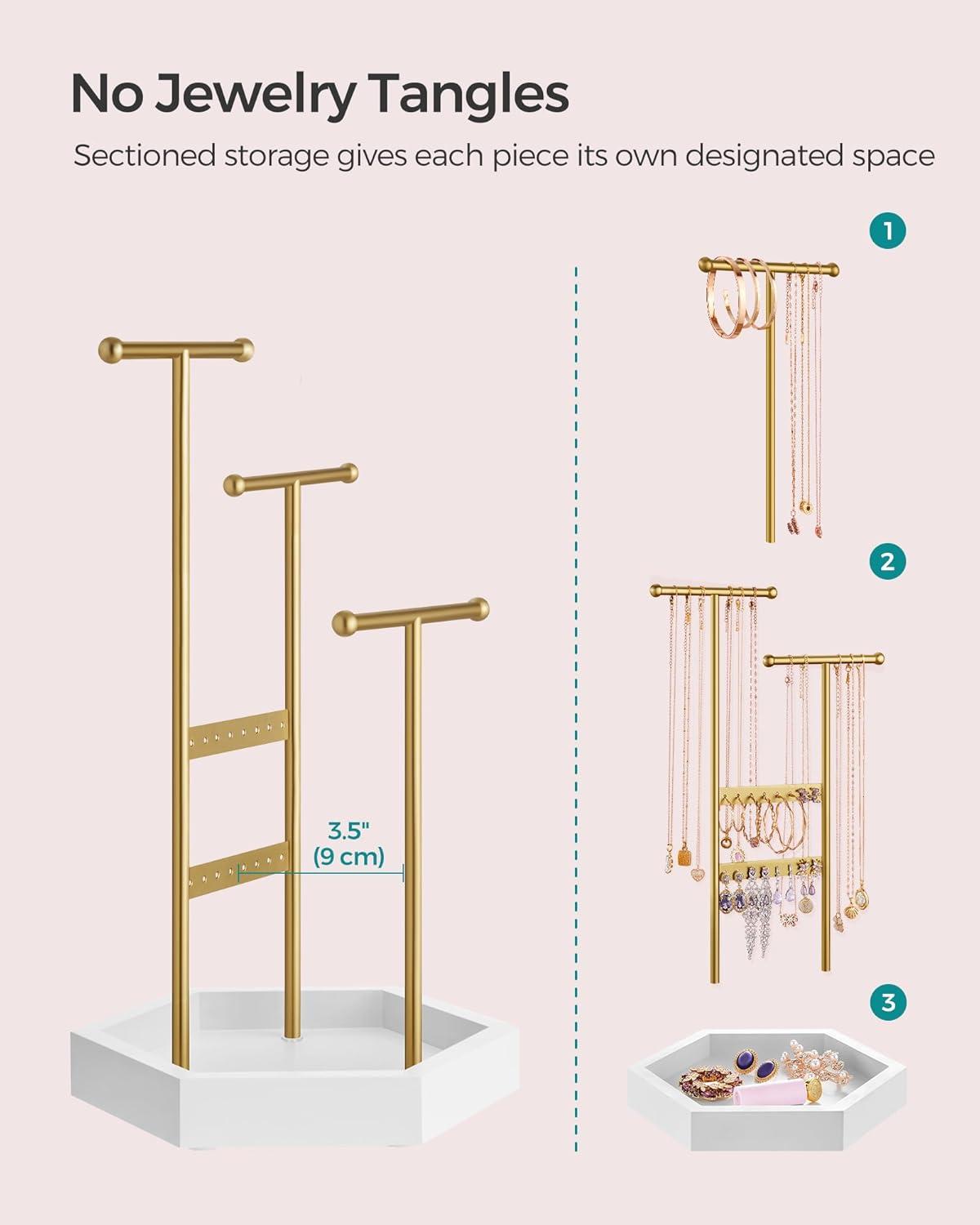[Sturdy, Durable, and Stable] The jewelry stand is a stable and safe haven for your treasured jewelry, thanks to a hexagonal base and 3 metal T-bars arranged in a triangular distribution and securely screwed to the base