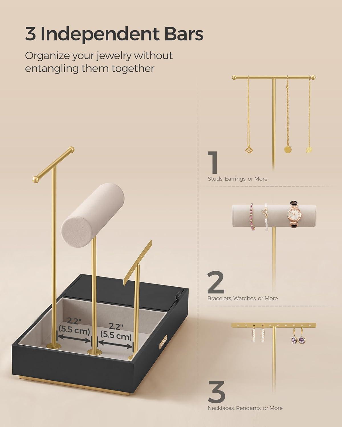 [Practical Statement Piece] Both the bracelet rod and the base of this jewelry organizer are wrapped in soft velvet to protect your valuables from scratches. The distinctive floating base protects your tabletop from getting scratched by the bottom screws