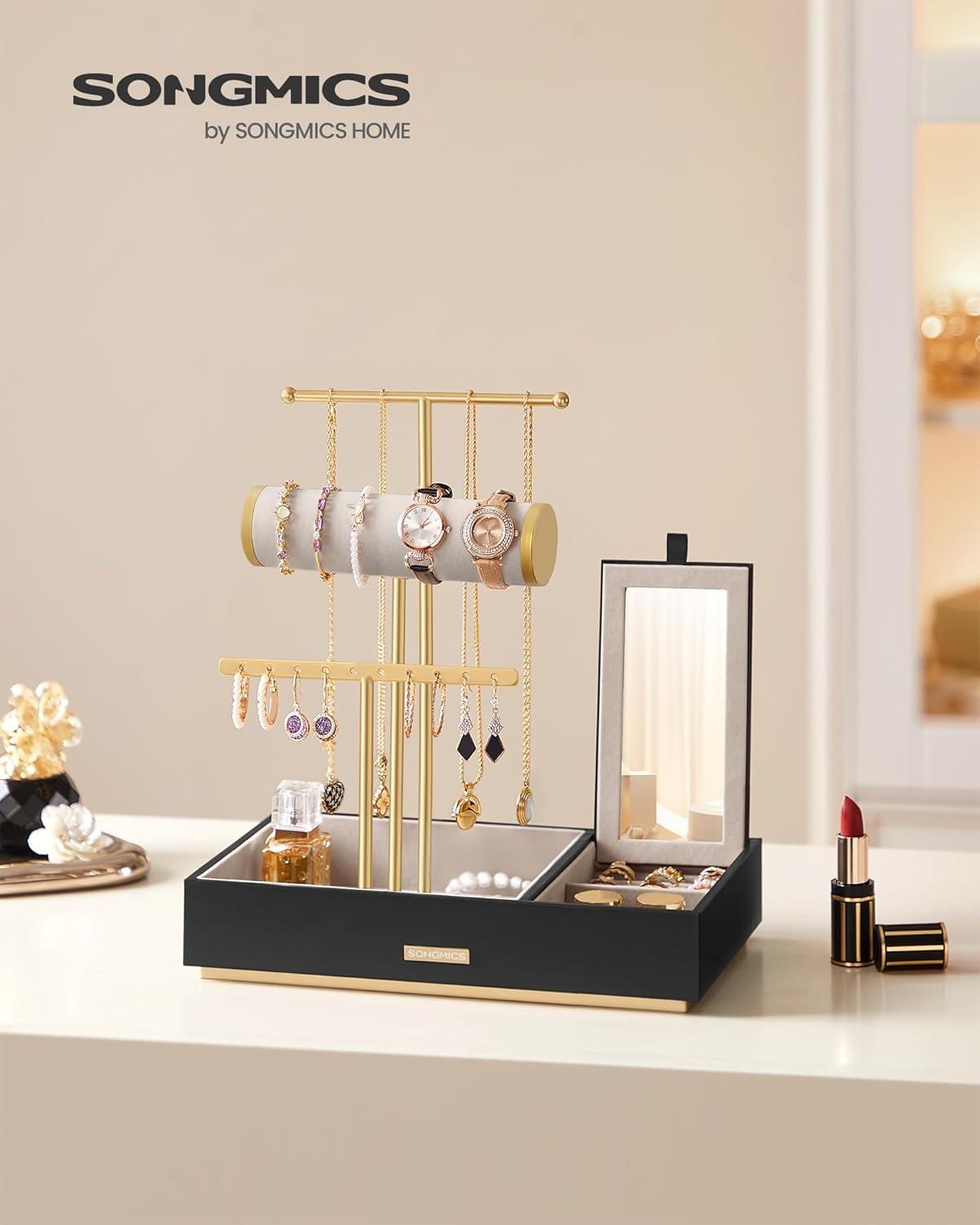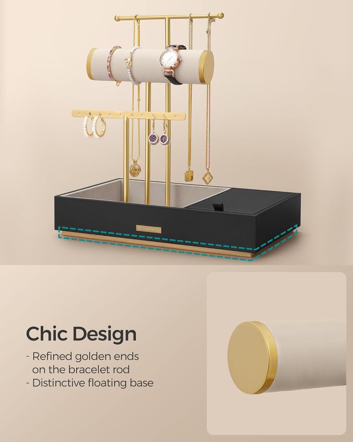 【5 SECTIONS OF STORAGE】This jewelry stand features 3 racks of different heights and 2 bottom velvet trays, providing you oodles of storage to neatly organize your earrings, bracelets, necklaces, rings, and other small accessories