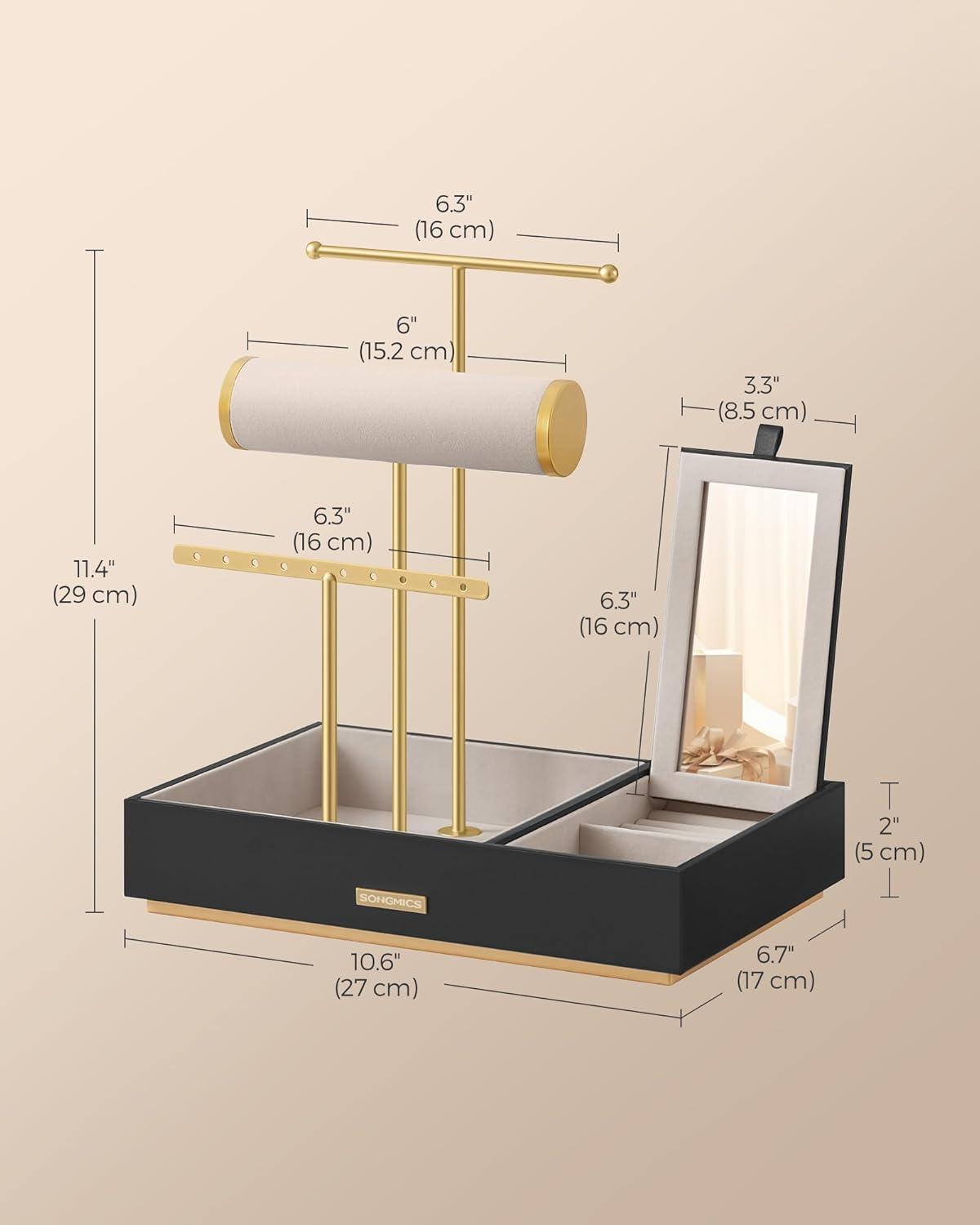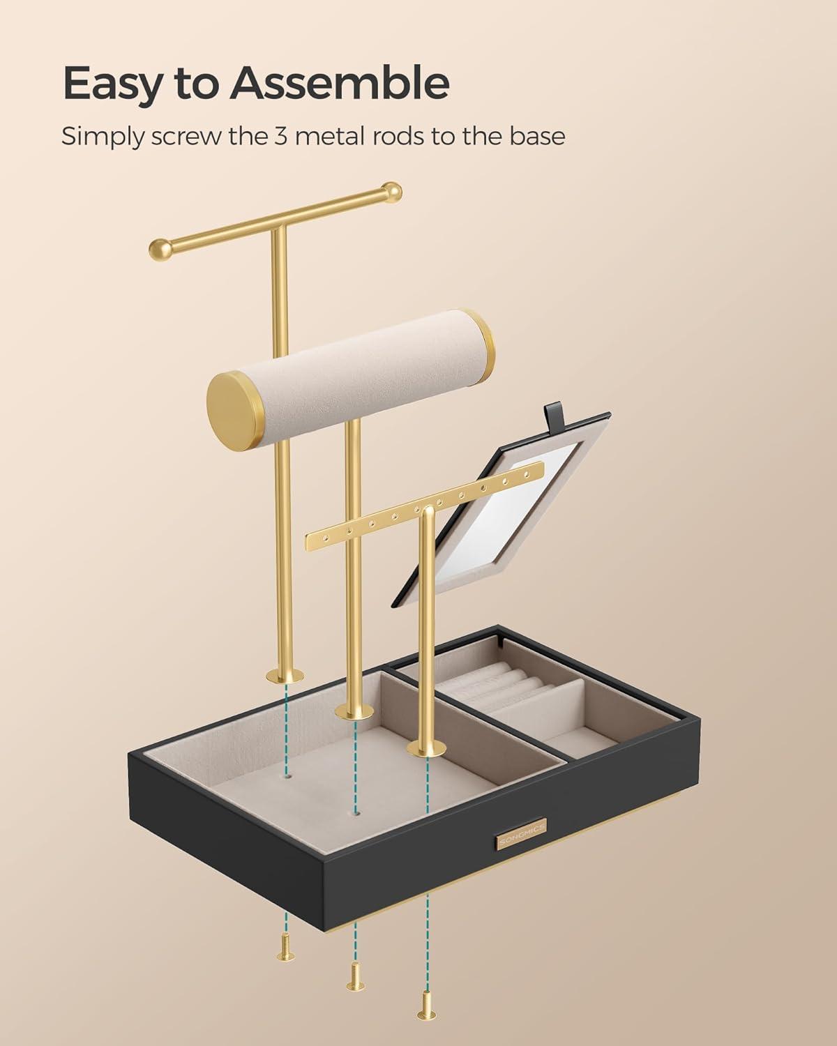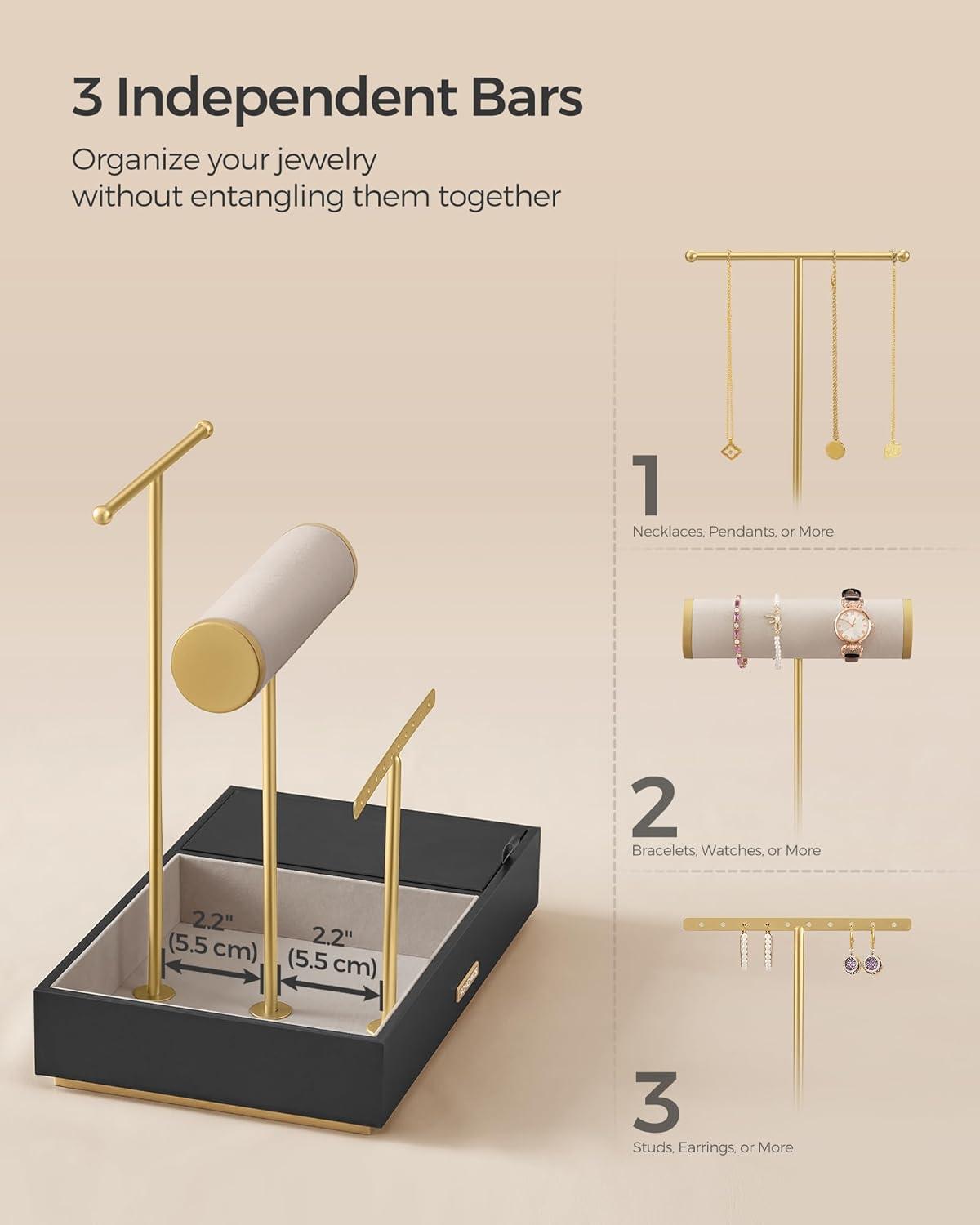 【QUICK SETUP, ELEGANT GIFT】Assembly couldn't be easier – just attach the 3 T-bars to the base. The golden logo on the base and the golden ends on the bracelet rod add to its elegance, making this jewelry holder a perfect gift option