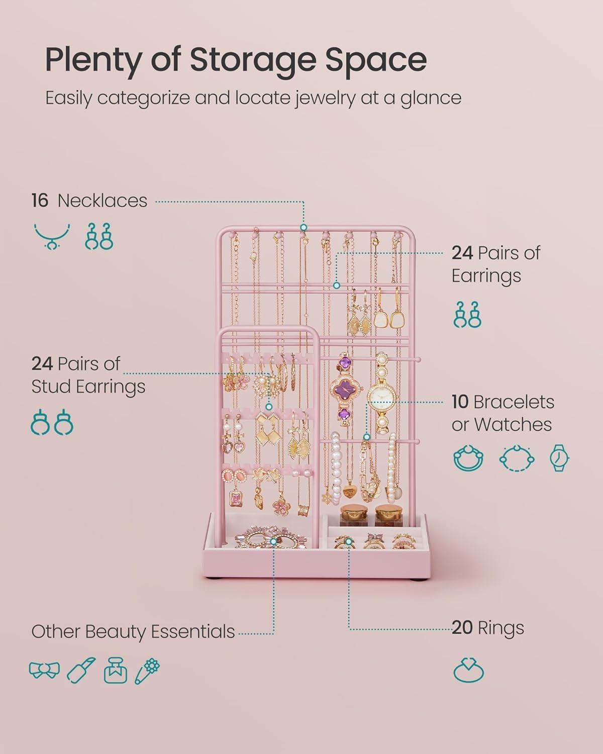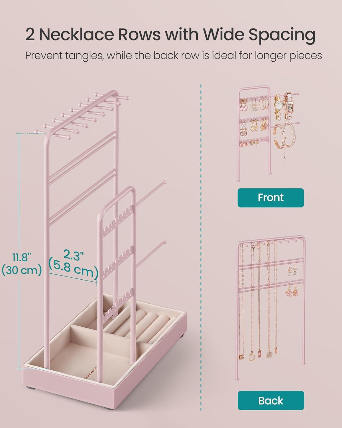 [Double Rows Prevent Tangles] The jewelry holder has 2 independent storage racks with a 2.3″ gap, preventing the entanglement of necklaces, bracelets, and accessories. Its vertical design maximizes organization and saves table space