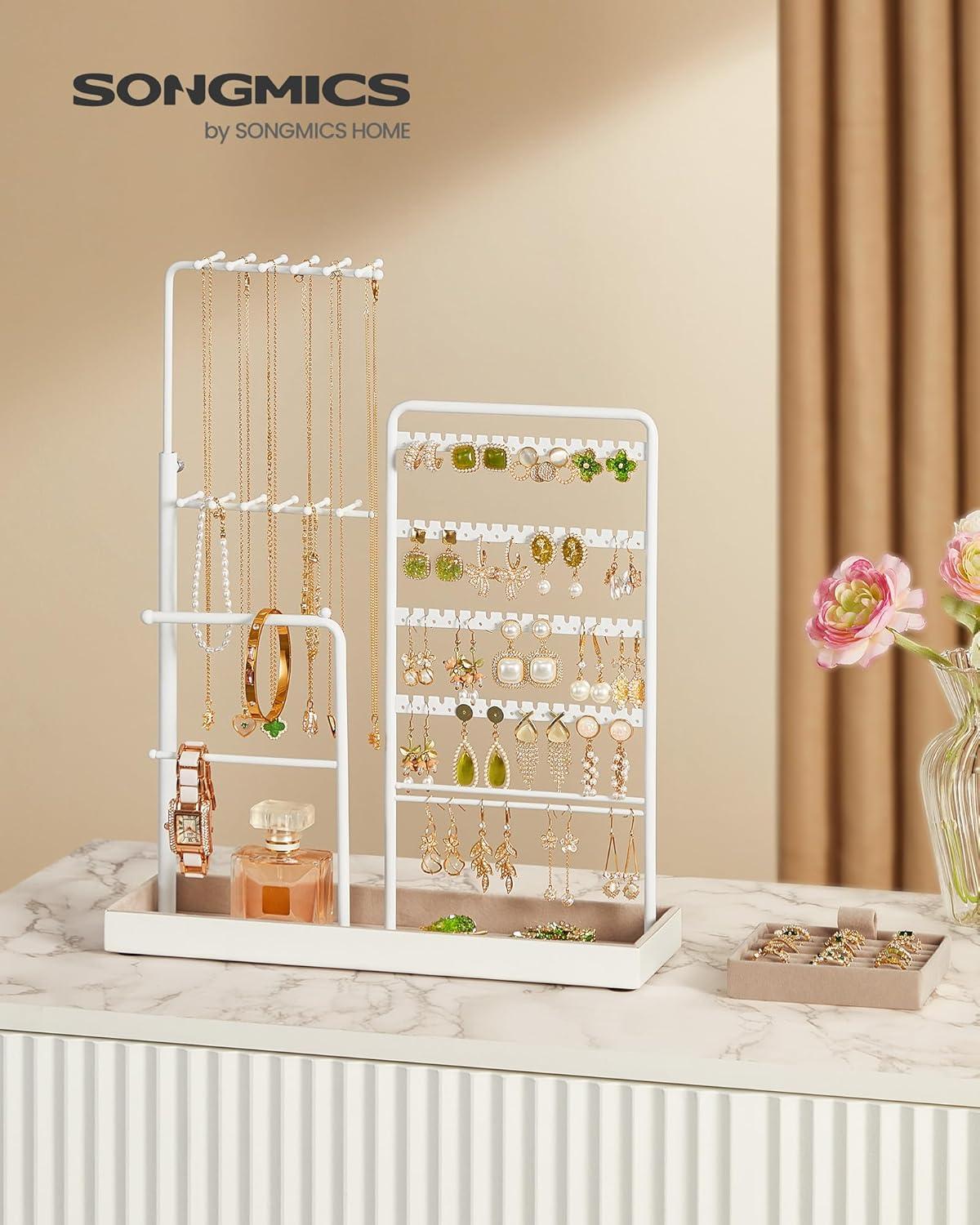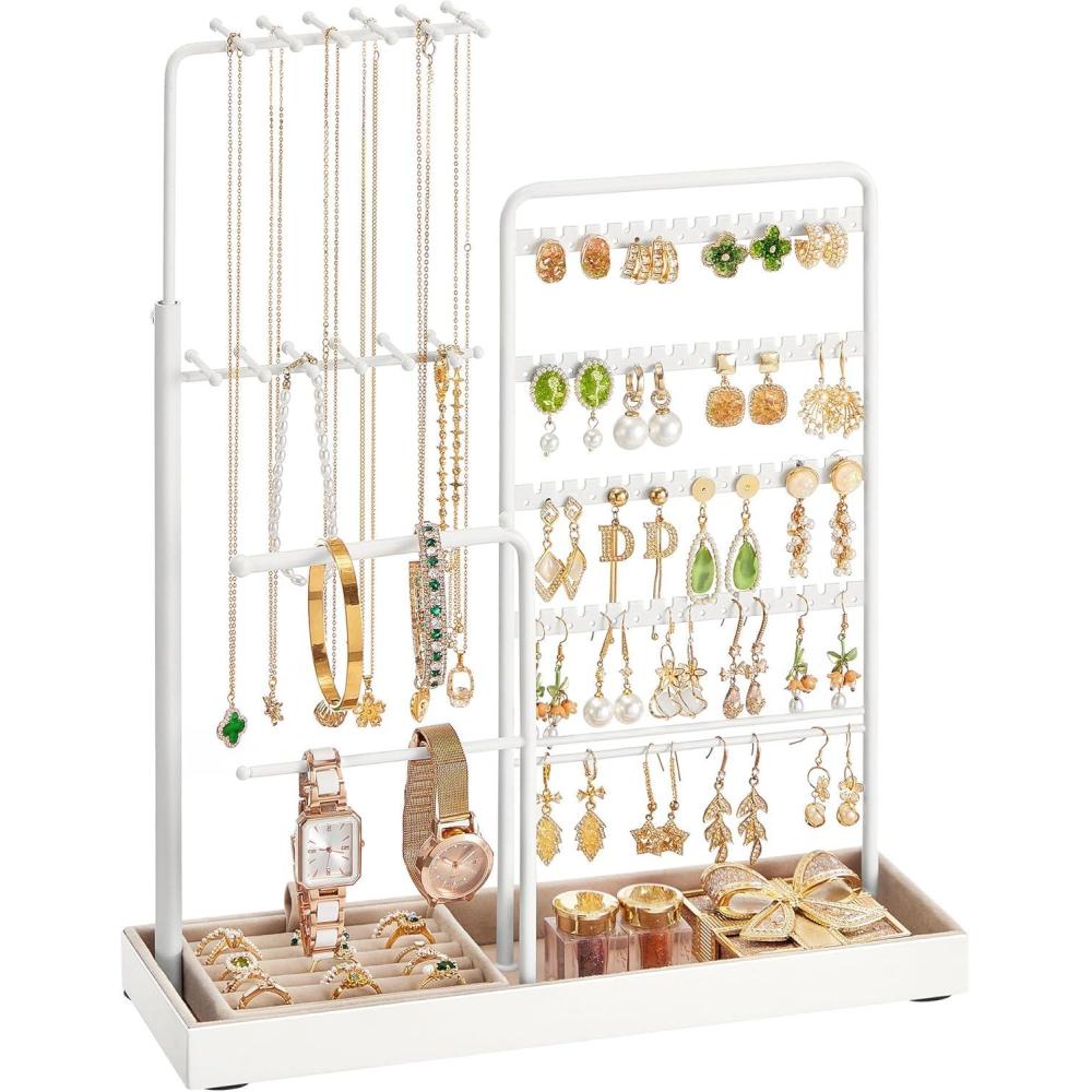Versatile Jewelry Storage: Easily organize up to 46 pairs of earrings, 20 bracelets or watches, 24 necklaces, and small items like rings, lipsticks, pins, and hairpins—all in one jewelry stand