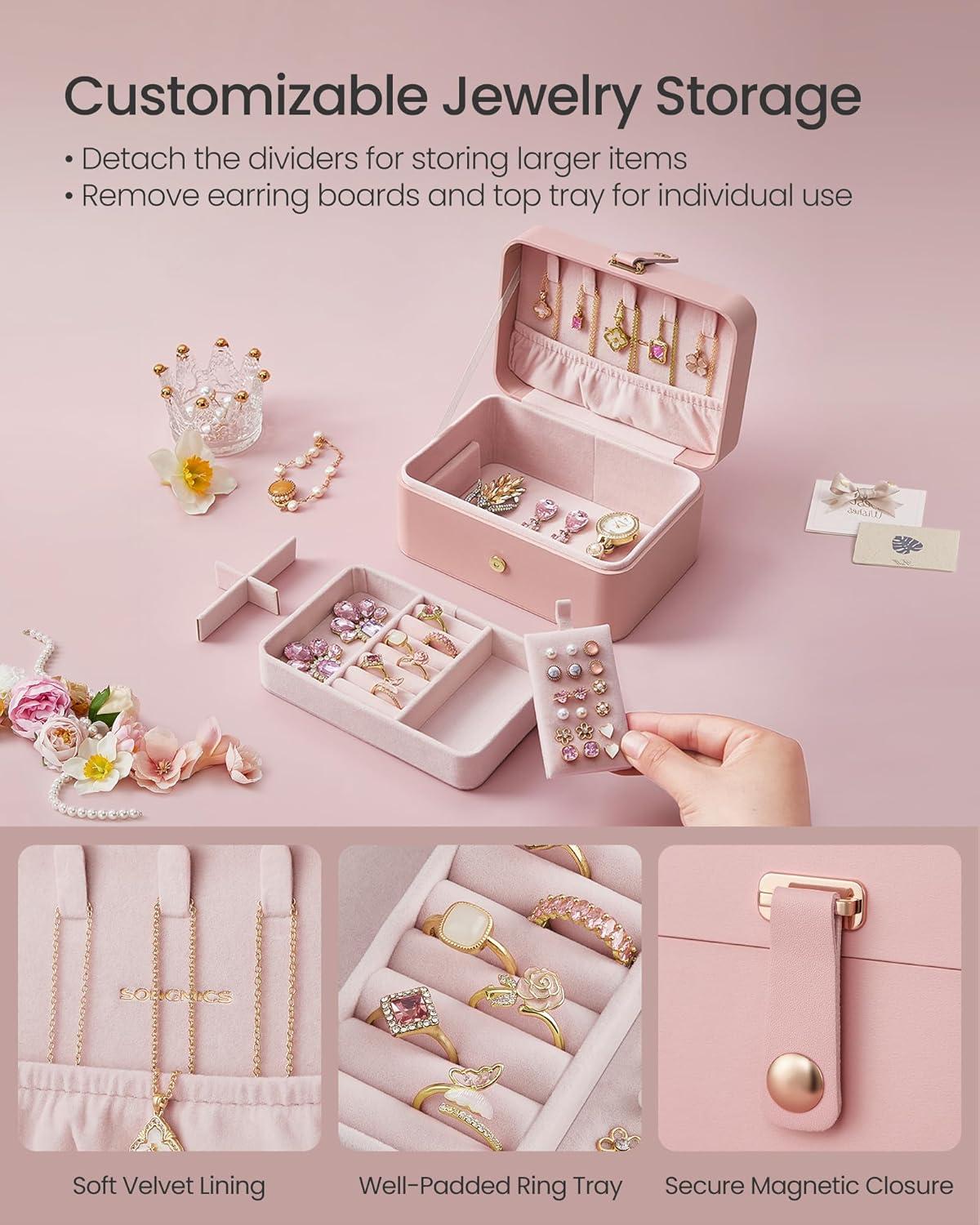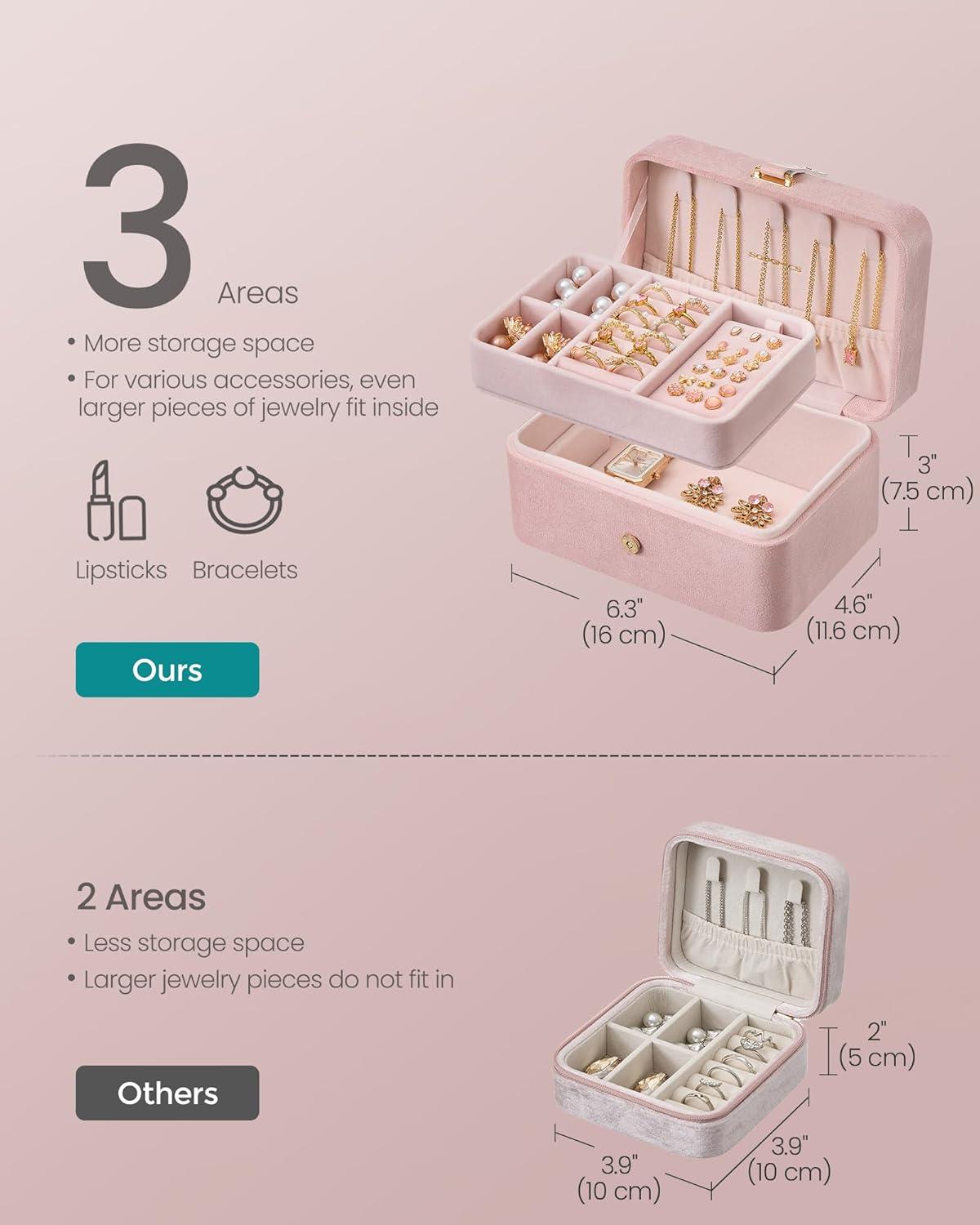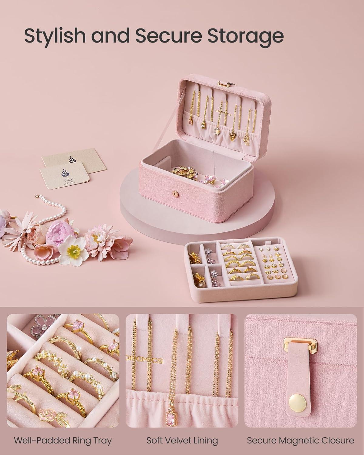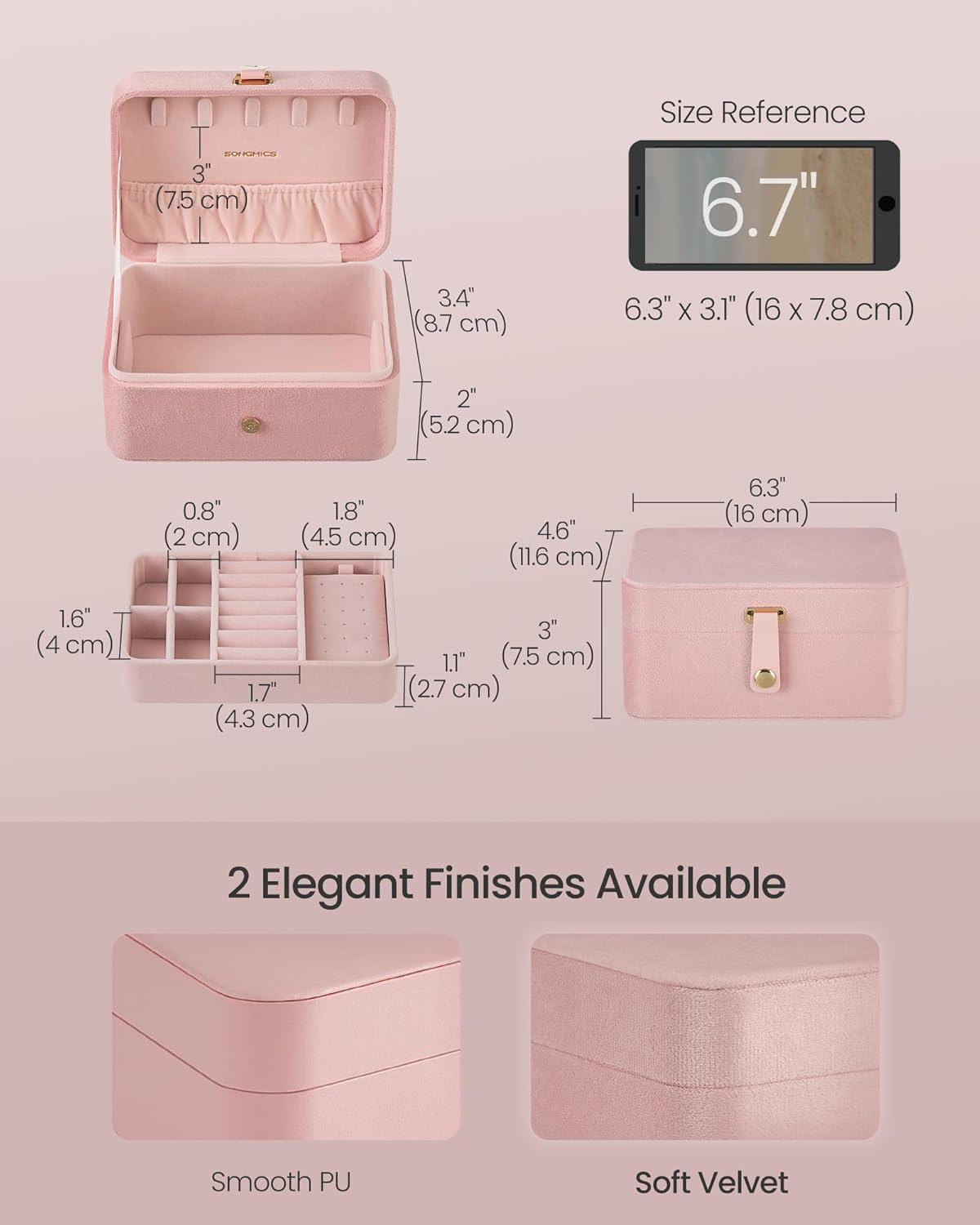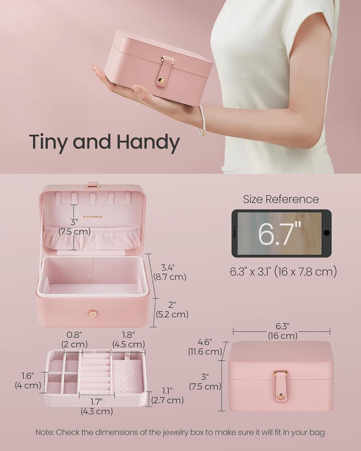 [Compact and Portable] Our 4.6 x 6.3 x 3 inches jewelry case easily fits in your bag or suitcase, allowing you to bring your favorite pieces on the go. Perfect for travel or business trips. Pack and carry with ease!