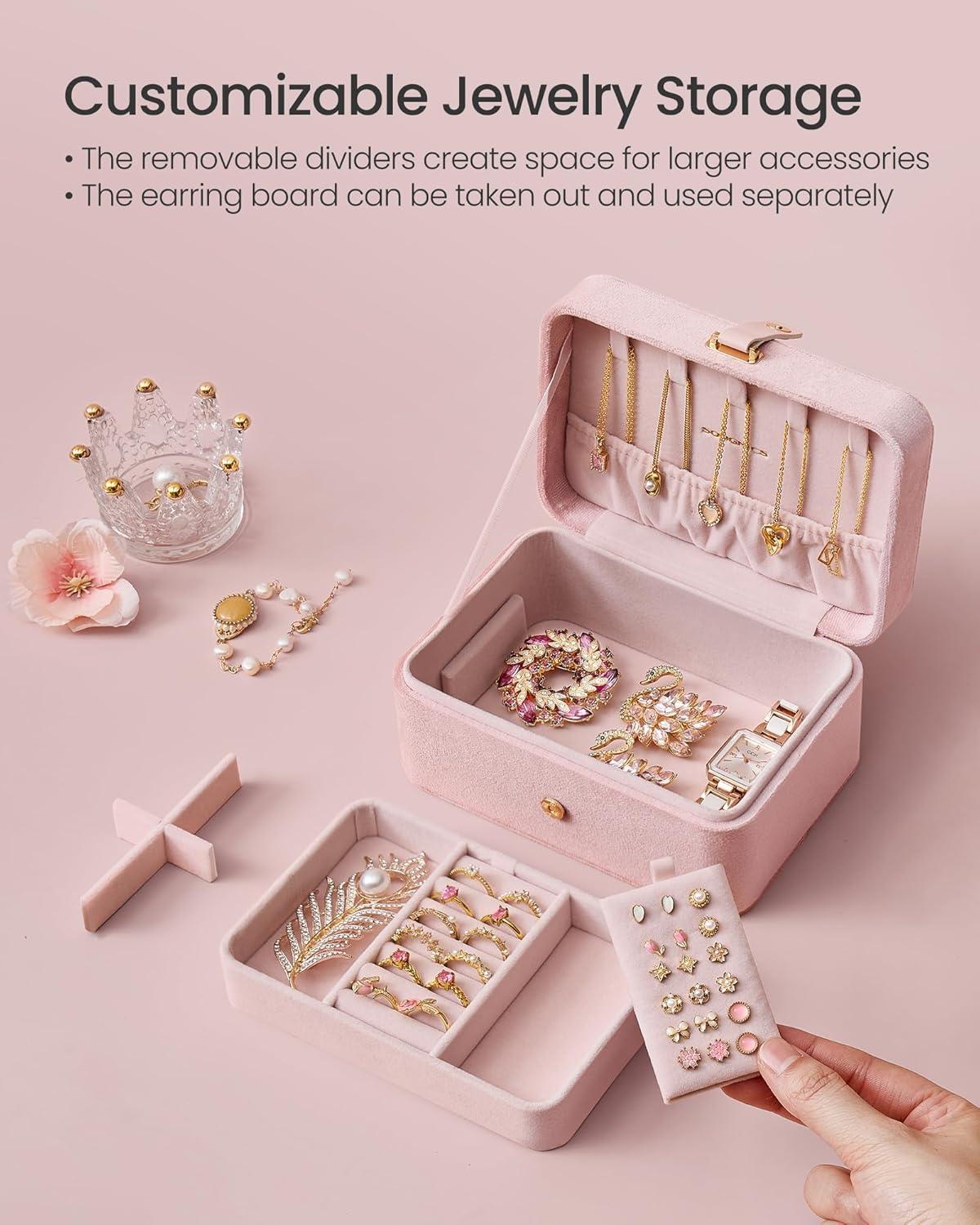 SONGMICS Jewelry Organizer Box, Travel Jewelry Case, 2-Layer Travel Case for Earrings, Necklaces, Bracelets – Portable Jewelry Storage with Large Capacity, Gift Idea, Cloud White UJBC166W01(Jelly Pink)