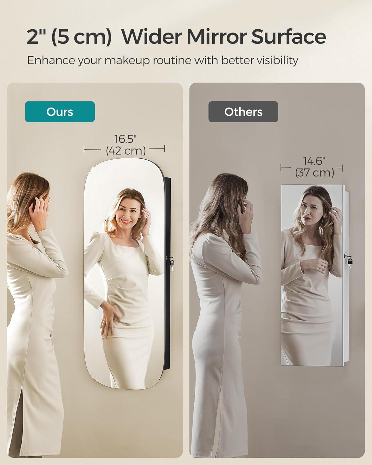Wide Surface: With a 2'' wider design than standard mirrors and measuring 3.9″D x 16.5″W x 42.5″H, this mirror with storage offers a broader view to help you refine every detail of your look