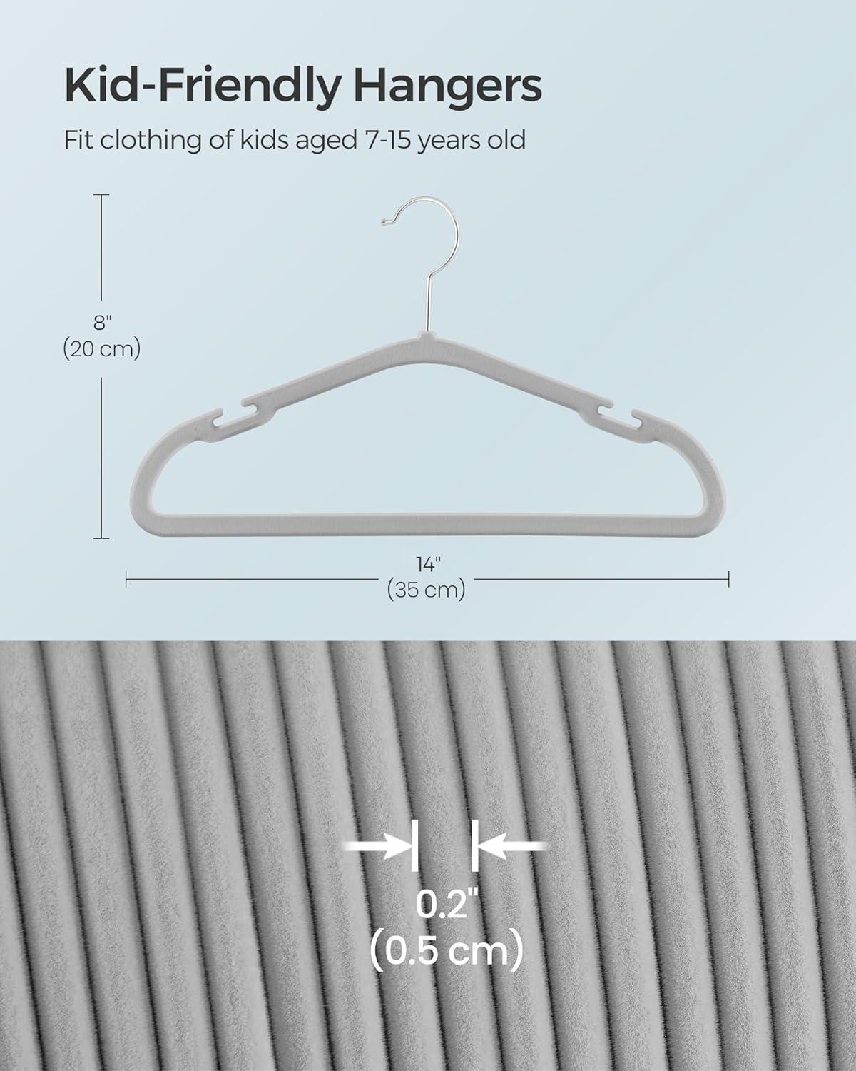 【STRONG SUPPORT】Made from premium ABS plastic and a metal hook, each velvet hanger can hold up to 11 lb (5 kg), allowing you to confidently hang heavy coats and winter clothes for children aged 7-15