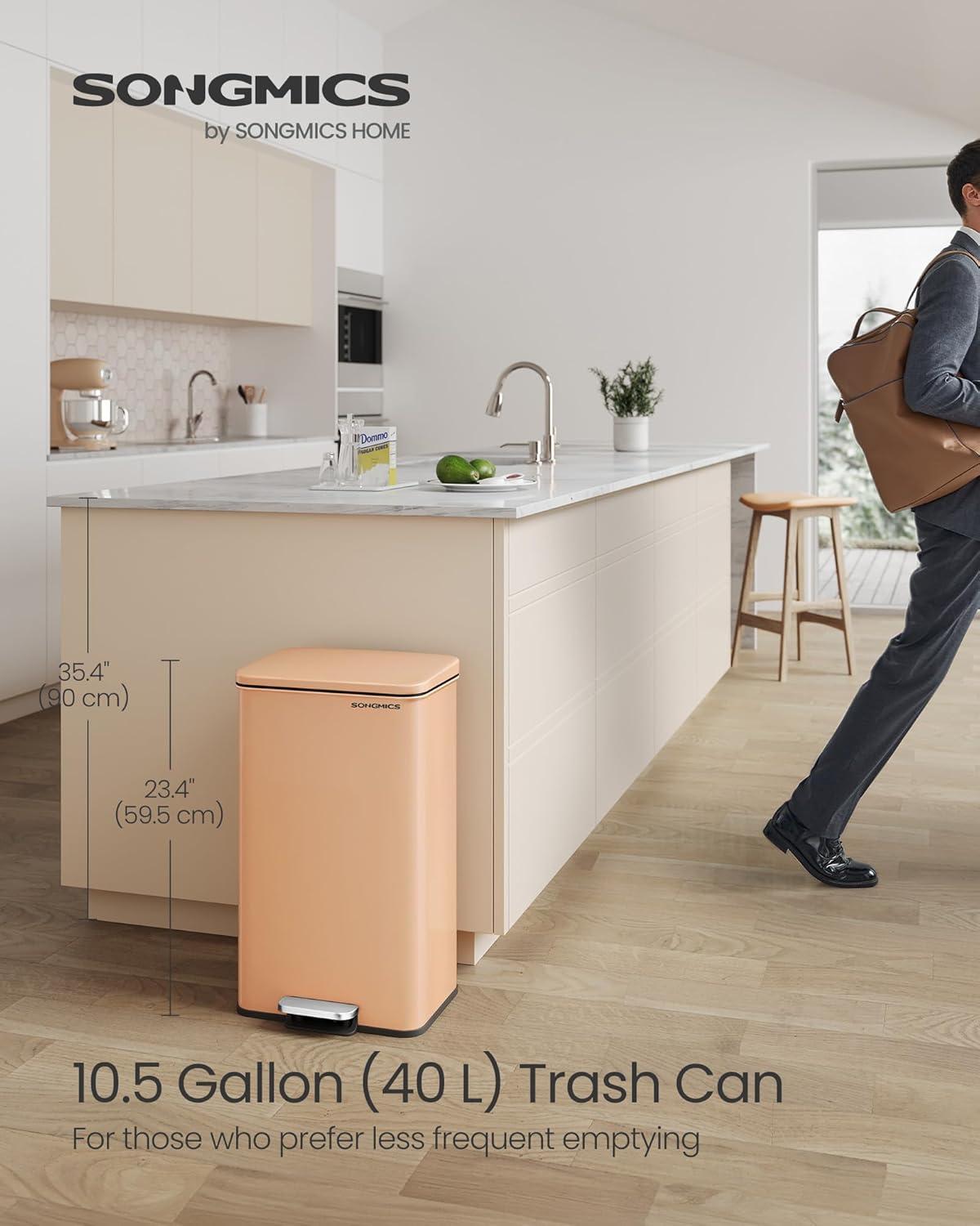 [Stainless Steel] The 10.5 gallon garbage can made of stainless steel resists rust and fingerprints. A simple wipe can keep it clean and smudge-free