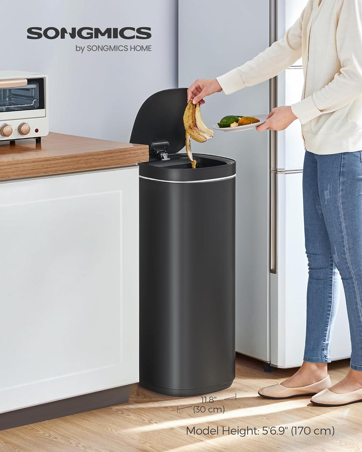 【AUTOMATIC SENSOR BIN】This motion-sensor trash can enhances both convenience and hygiene. Simply wave your hand within 9.8″ over the sensor for a swift, touch-free lid opening in 0.3 seconds. The lid then automatically closes after 5 seconds